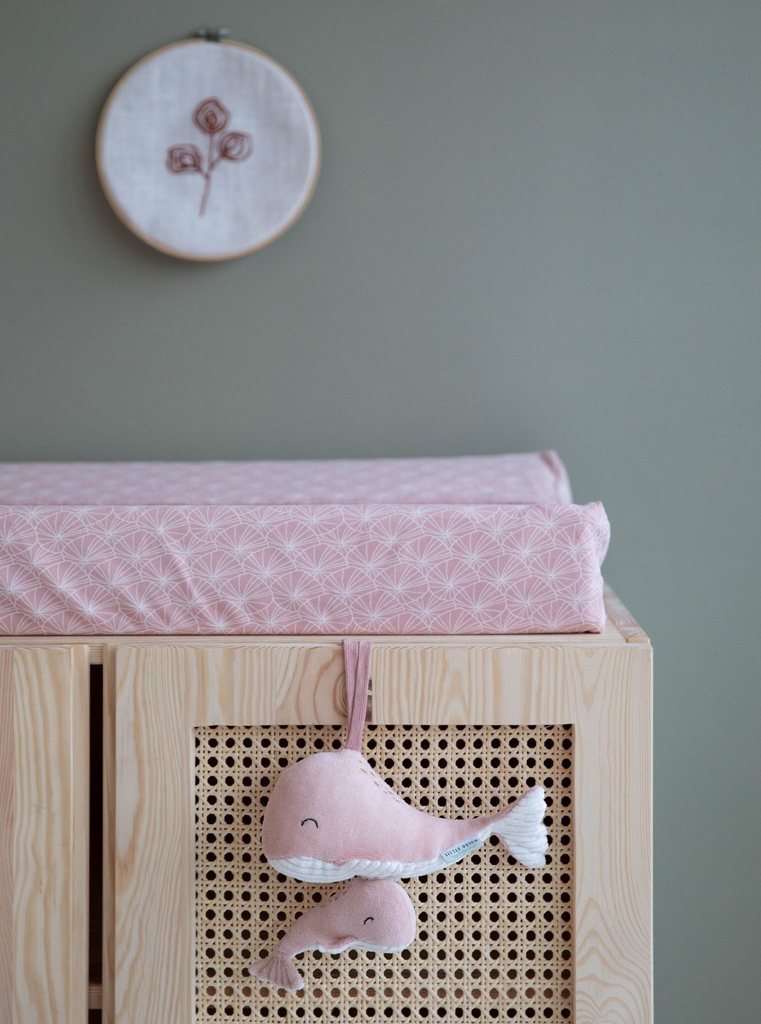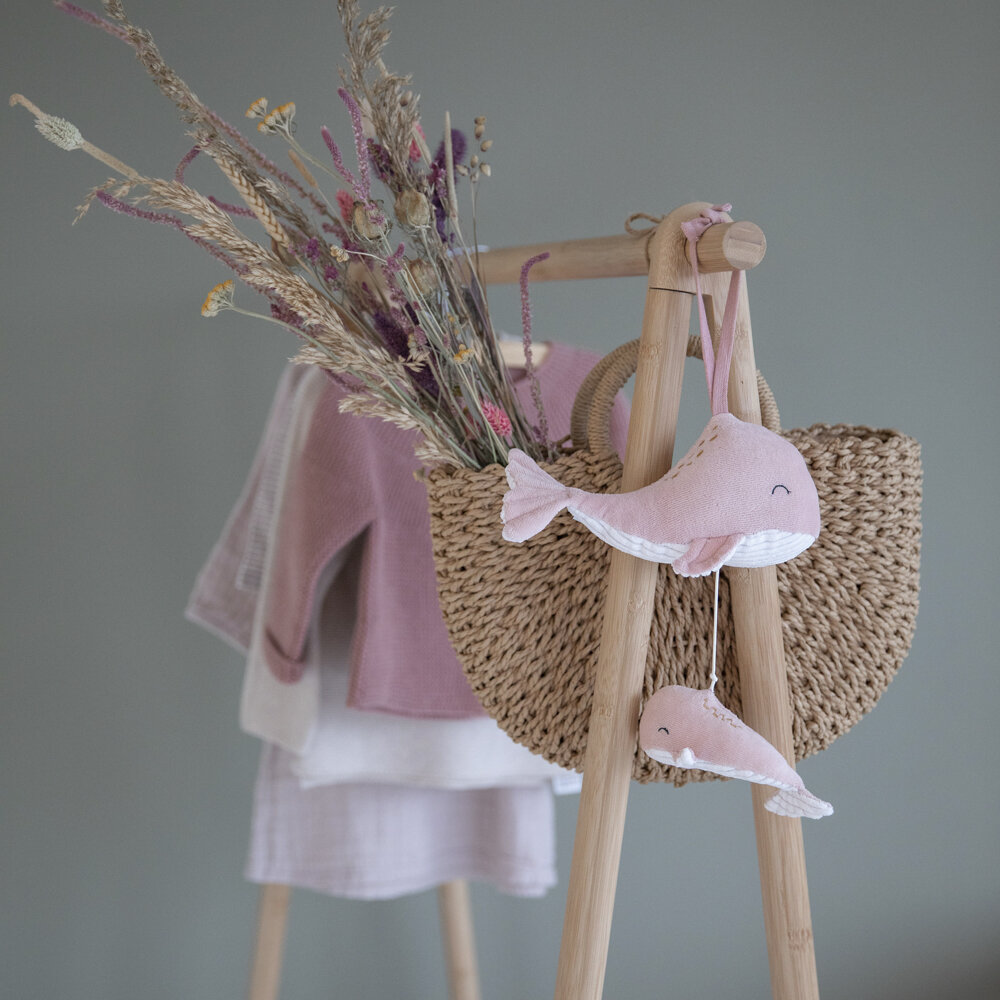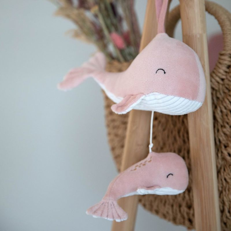 Wesoła pozytywka w kształcie dwóch wielorybków z kolekcji Ocean, którą można zawiesić przy łóżeczku, przy gondoli wózka, do fotelika samochodowego. Gra delikatną, spokojną melodię: kołysankę Brahmsa. Pozytywka jest miękka i przytulna oraz posiada metki do dodatkowej stymulacji zmysłów dziecka. Po pociągnięciu mniejszego wielorybka, uruchamiamy pozytywkę. Może stanowić idealny prezent dla najmłodszych na baby shower, urodziny. Będzie piękną ozdobą pokoju dziecięcego.
