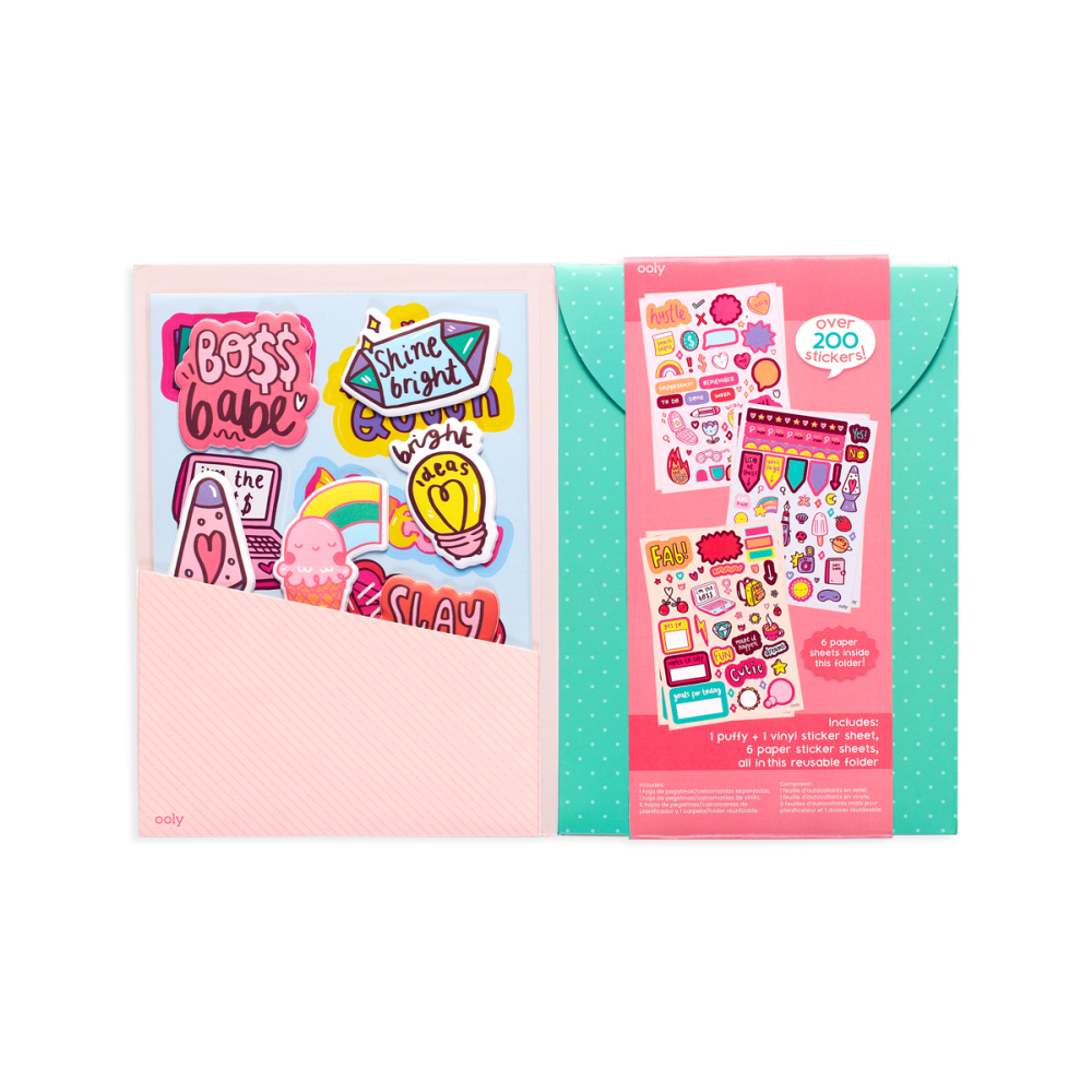 Ponad 200 naklejek o tematyce babskiego biura! Zestaw zawiera: 1 arkusz miękkich, piankowych naklejek, 1 arkusz naklejek winylowych, 6 arkuszy naklejek papierowych i praktyczną kopertę do ich przechowywania. Idealny do dekorowania kalendarzy, dzienników, plannerów, a także nudnych biurek! Rozpocznij uśmiechniętą, naklejkową zabawę!