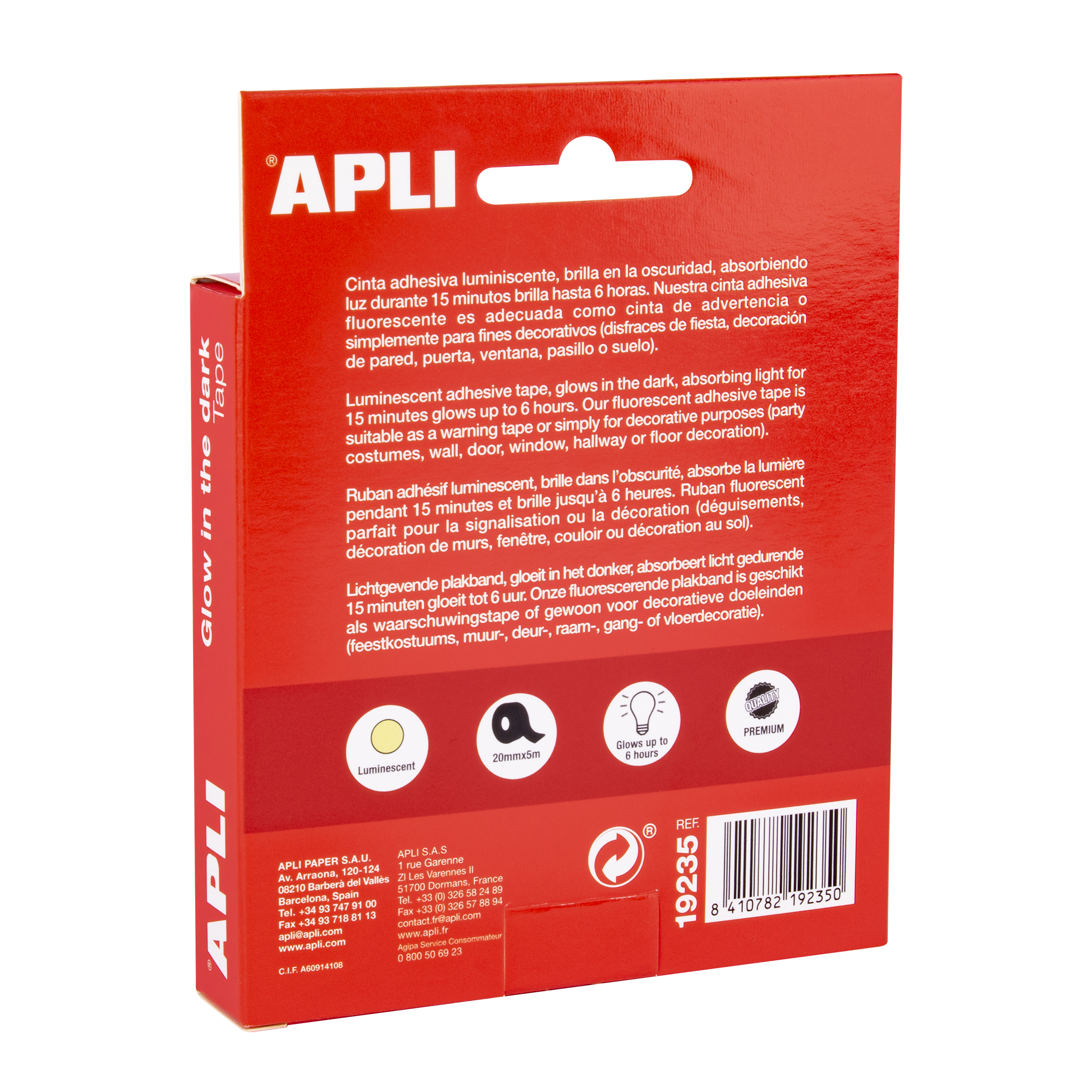 Taśma klejąca świecąca w ciemności Apli Kids o szerokości 20 mm i długości 5 m. Wystarczy naświetlić ją światłem słonecznym bądź sztucznym przez 15 min a będzie świeciła w ciemności do 6h. Taśma na początku świeci bardzo intensywnie a z upływem czasu efekt zanika. Wystarczy naświetlić ją ponownie, aby w pełni cieszyć się właściwościami luminescencyjnymi. Idealnie nada się jako taśma ostrzegawcza do oznaczenia schodów, wyjść/wejść, obniżonych sufitów, progów. Można jej także użyć do obklejenia kół rowerowych oraz kasku. Zapewni to bezpieczną jazdę po zmroku. Taśmę można wykorzystać do przeróżnych prac plastycznych np. do strojów na Halloween, laurek, ozdób na ścianę czy sufit.