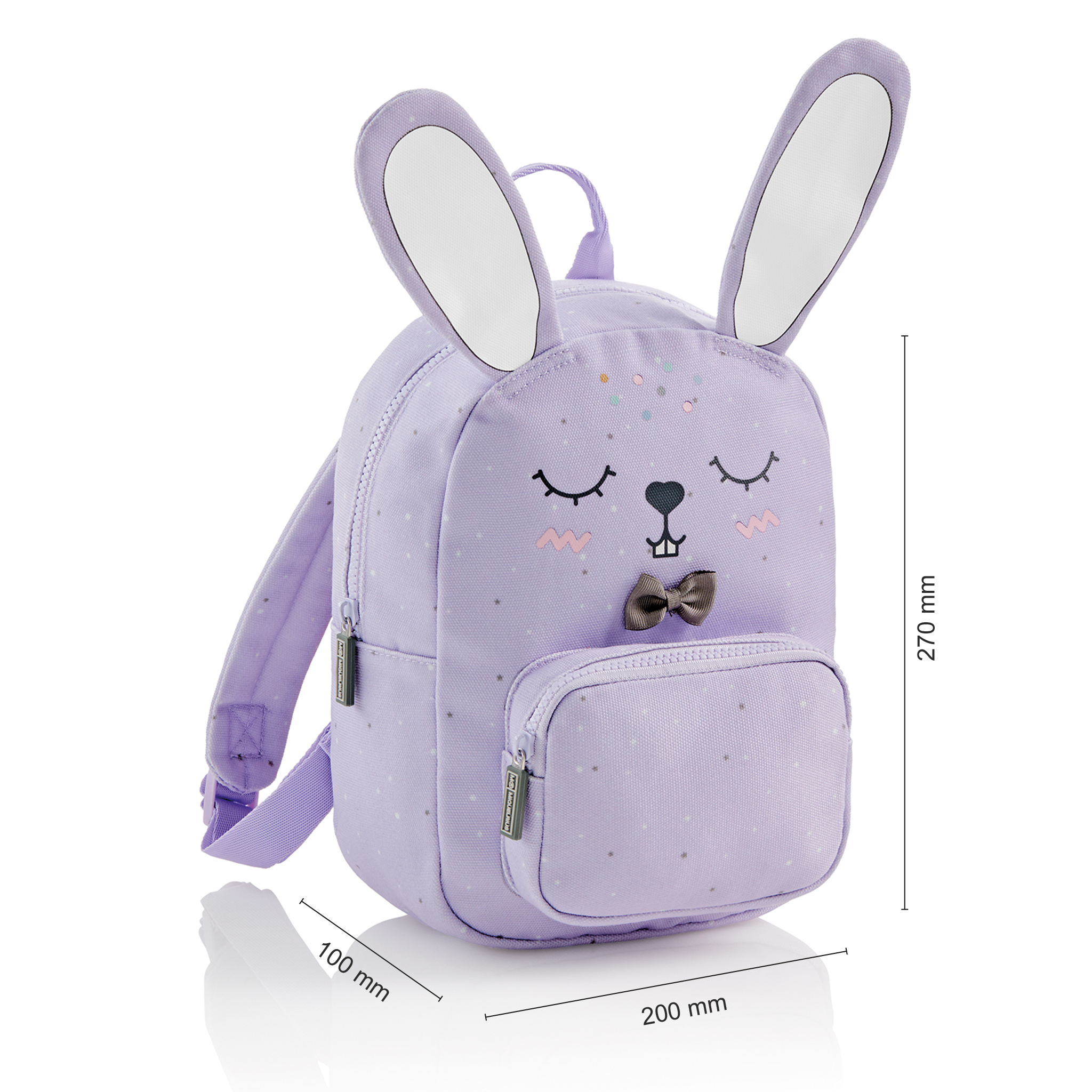 Fioletowy plecak Miquelrius z uroczą buźką królika i wystającymi uszami to idealny wybór dla najmłodszych dzieci. Został wyposażony w jedną dużą komorę i przednią kieszonkę na drobiazgi. Obie zamykane na zamek błyskawiczny, który zapewnia praktyczność i łatwy dostęp do potrzebnych rzeczy. Miękki, delikatny materiał i zabawny, zwierzęcy design sprawiają, że plecak jest niepowtarzalny i przyciąga uwagę dzieci. Posiada pasek piersiowy dla komfortowego i stabilnego noszenia. Wewnątrz znajduję się miejsce na imię dziecka i kontaktowy numer telefonu rodzica, co okazuje się niezwykle pomocne w przypadku zagubienia.