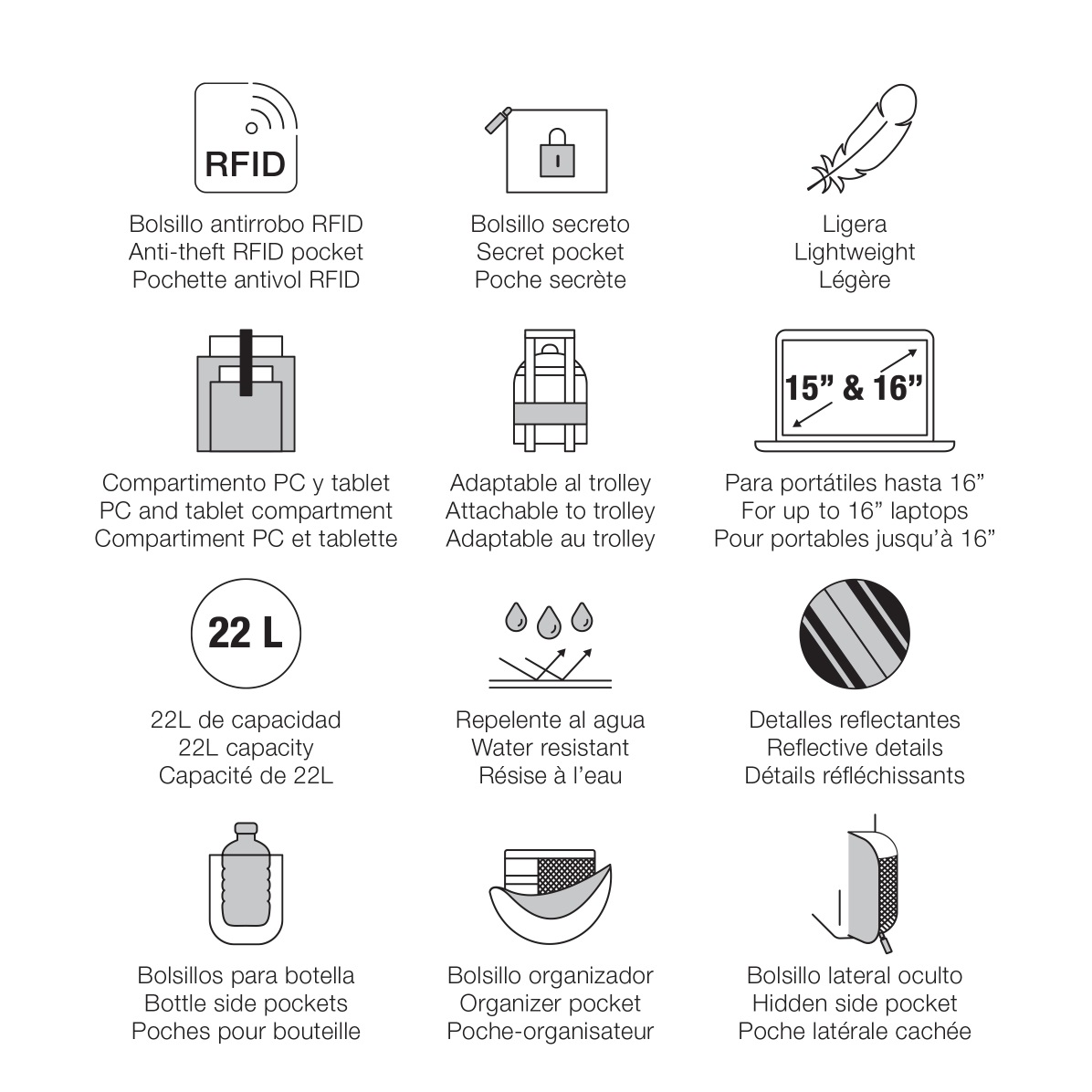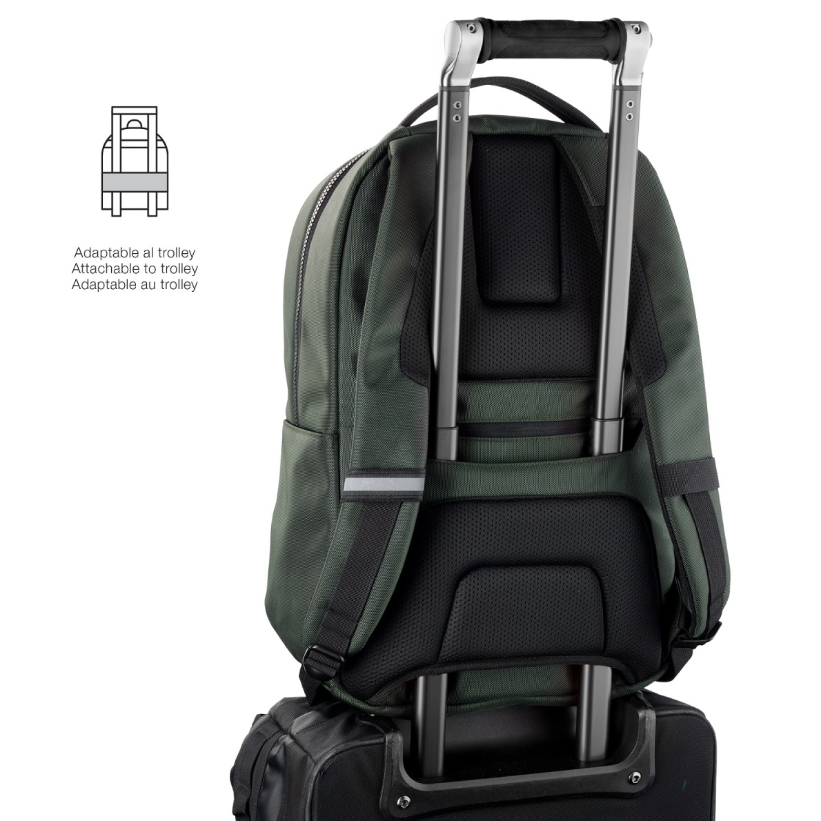 Świetnie sprawdzi się również podczas podróży służbowych dzięki możliwości założenia plecaka na walizkę. Elementy odblaskowe zwiększają widoczność i bezpieczeństwo po zmroku.