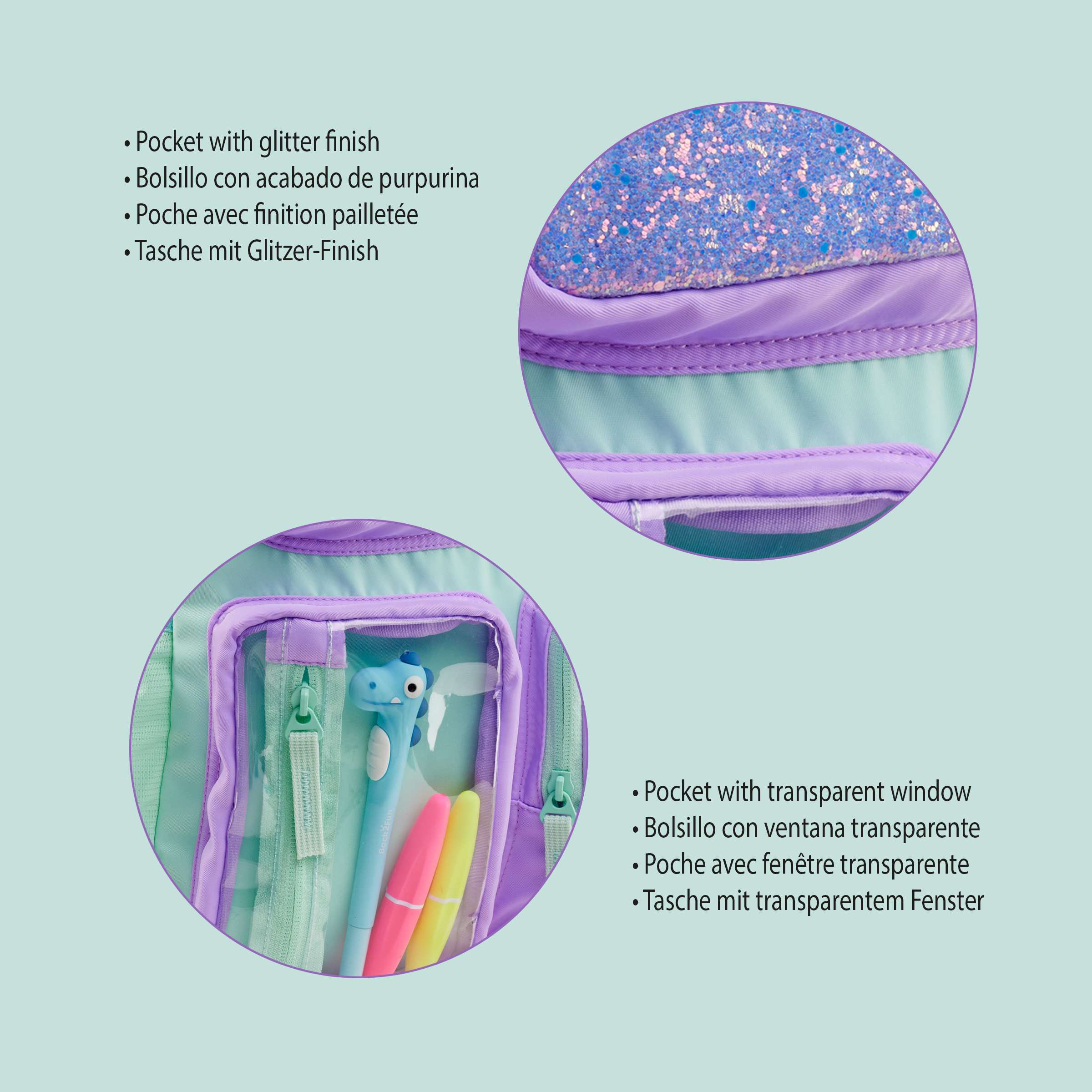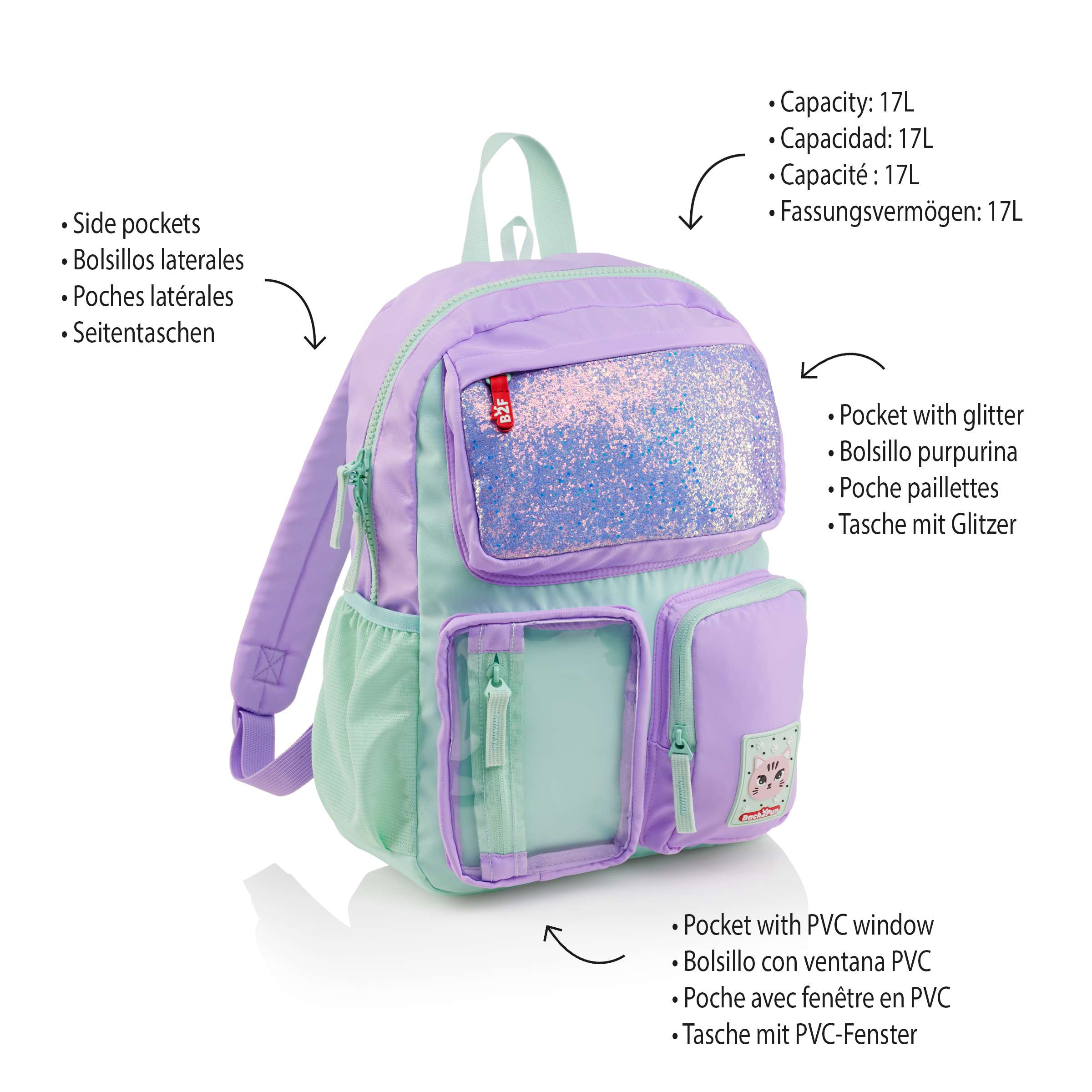 Plecak marki Miquelrius w pastelowych kolorach z pewnością skradnie serce każdego dziecka! Ze względu na dużą pojemność 17 l idealnie sprawdzi się do szkoły. Posiada jedną komorę główną i 3 mniejsze kieszonki z przodu, w tym jedną ozdobioną brokatem, jedną przezroczystą - wszystkie zapinane na zamek błyskawiczny. Dodatkowo został wyposażony w dwie boczne kieszenie na bidon lub butelkę z wodą.