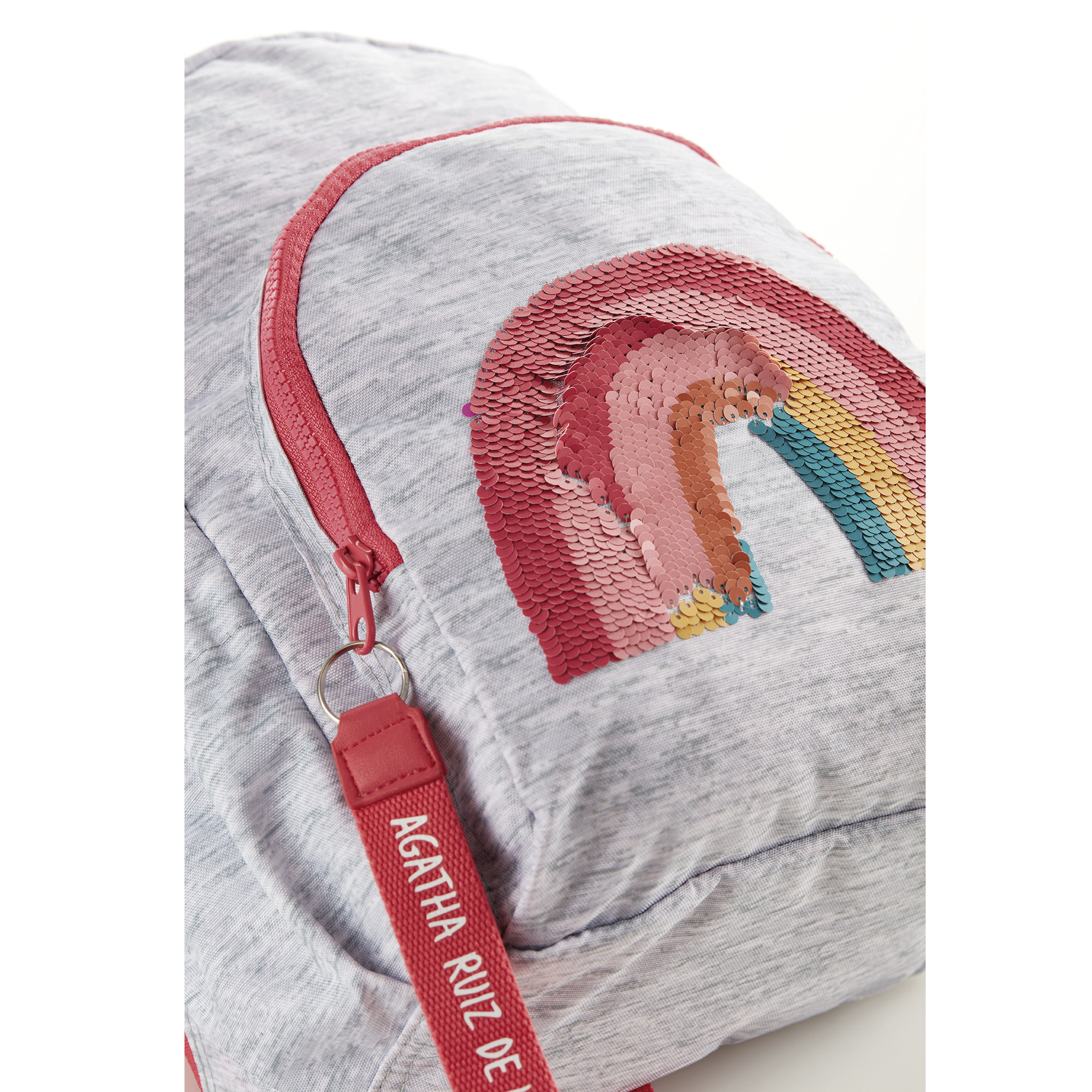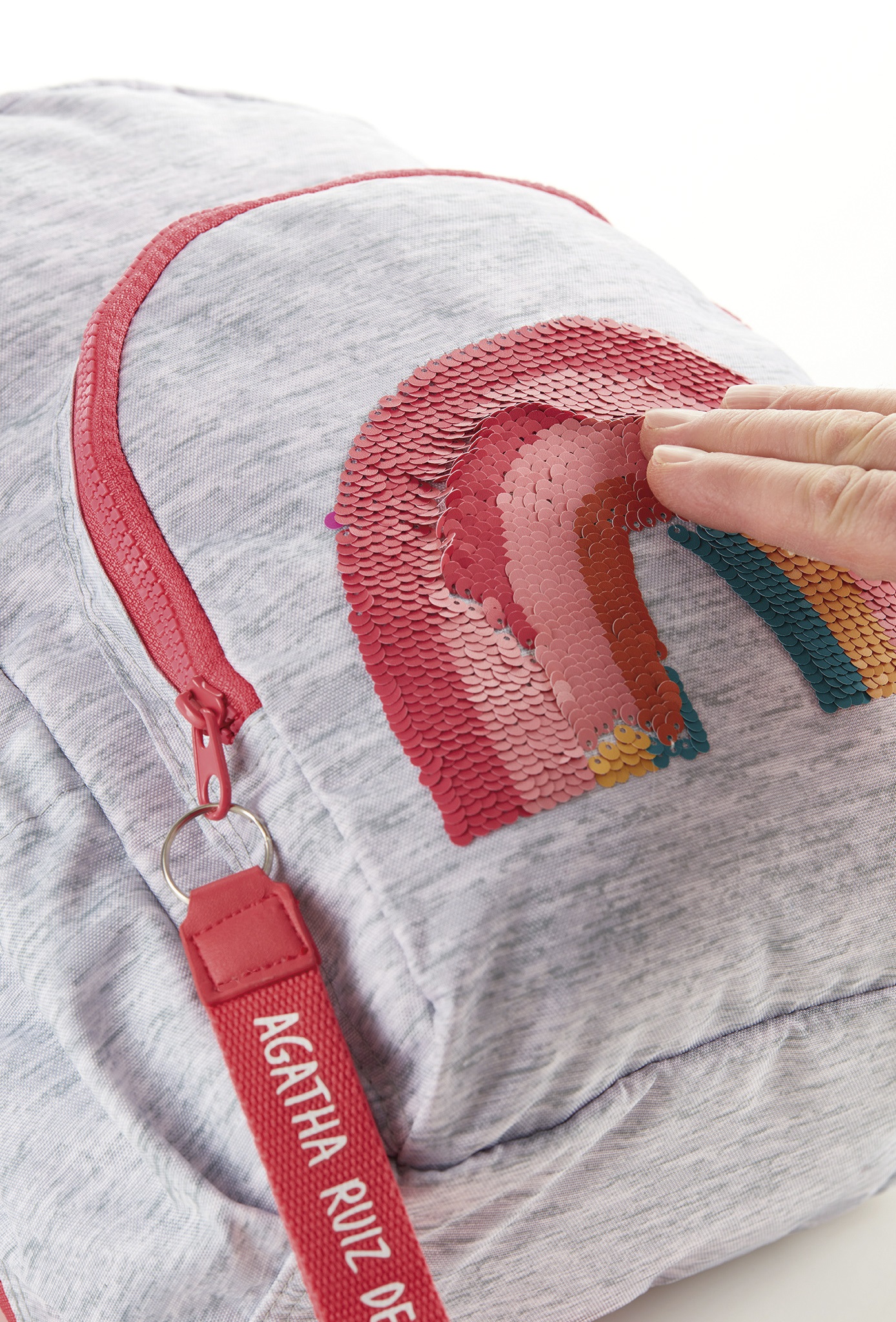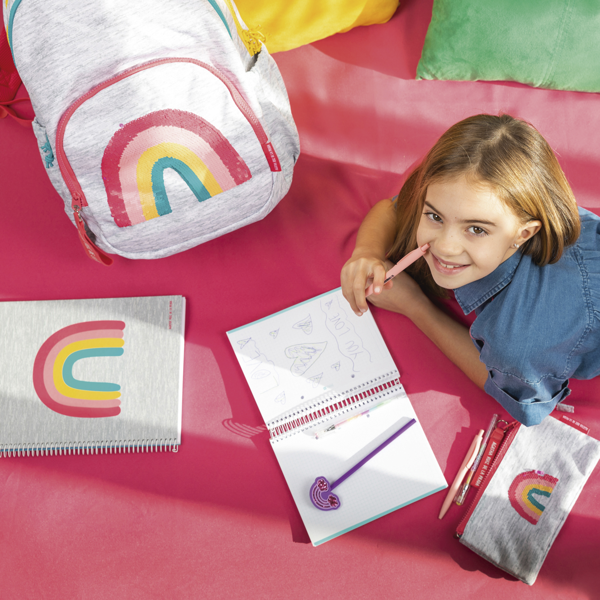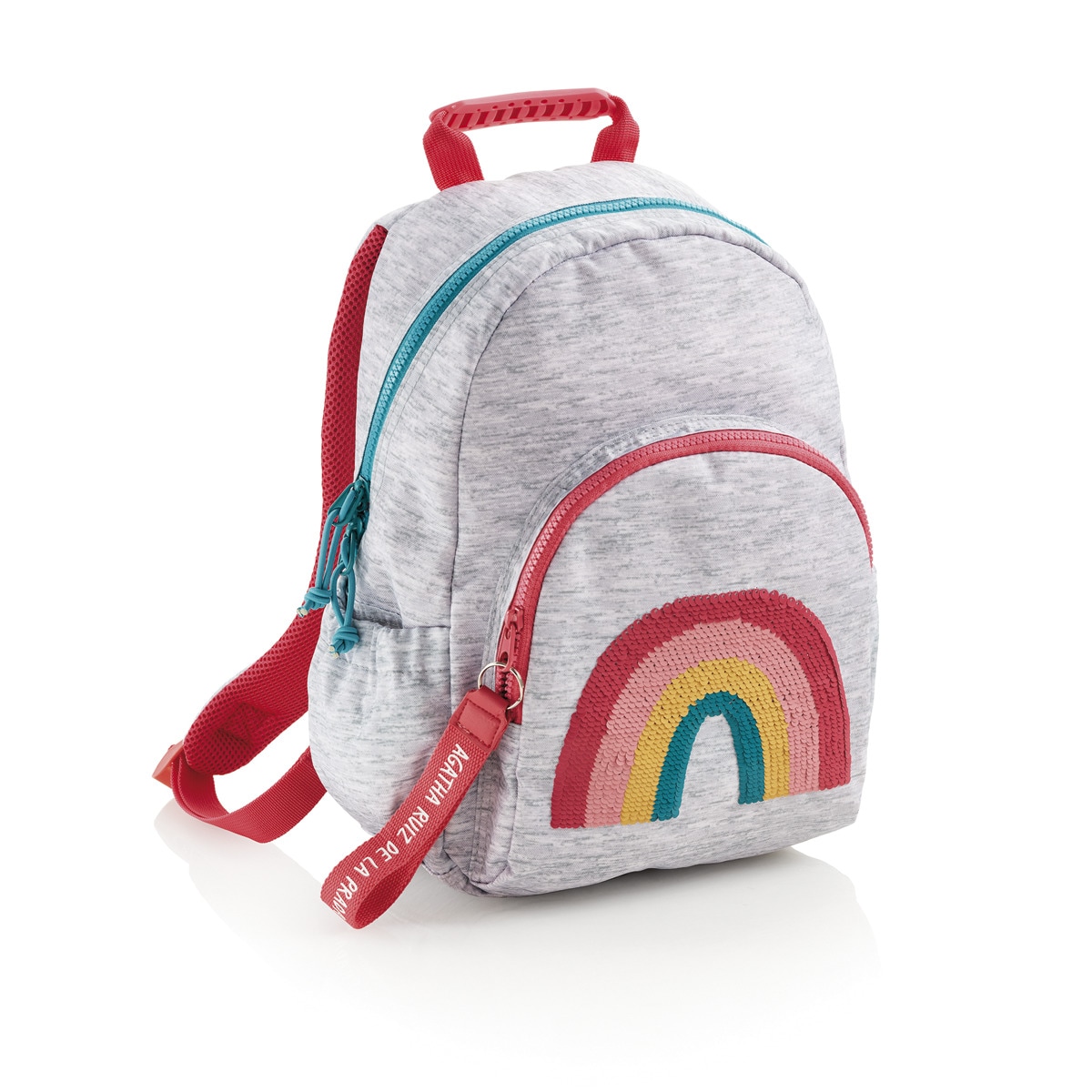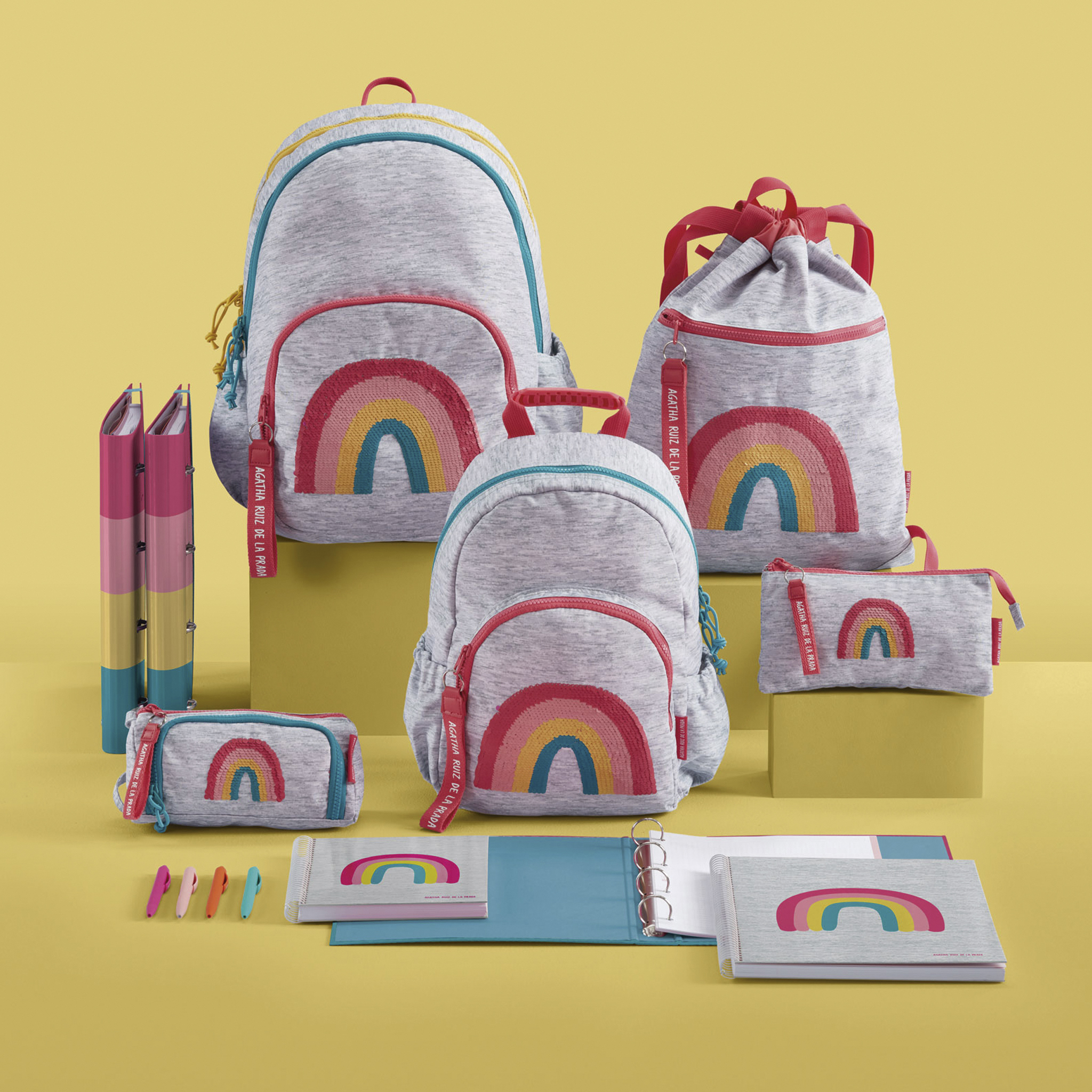 Dwukomorowy plecak London z kolekcji Bright marki Miquelrius. Zaprojektowany przez Agathę Ruiz de la Prada - projektantkę mody mocno zaangażowaną w ekologię. Wykonany został z poliestru z recyklingu RPET. Plecak posiada dwie kieszenie zapinane na zamek (górną i przednią). Ma wysokiej jakości wytrzymałe zamki, z metalowymi uchwytami i taśmą ułatwiającą otwieranie. Ergonomiczne i regulowane pasy naramienne z wypełnieniem zwiększają komfort użytkowania. W przedniej komorze jest dodatkowa kieszonka zapinana na zamek, która ułatwi organizację drobiazgów a boczne kieszenie na butelkę umożliwia szybki dostęp do napoju. Breloczek z pomponem dodaje uroku całości. Z przodu plecaka widnieje kolorowa tęcza z odwracanym cekinami.