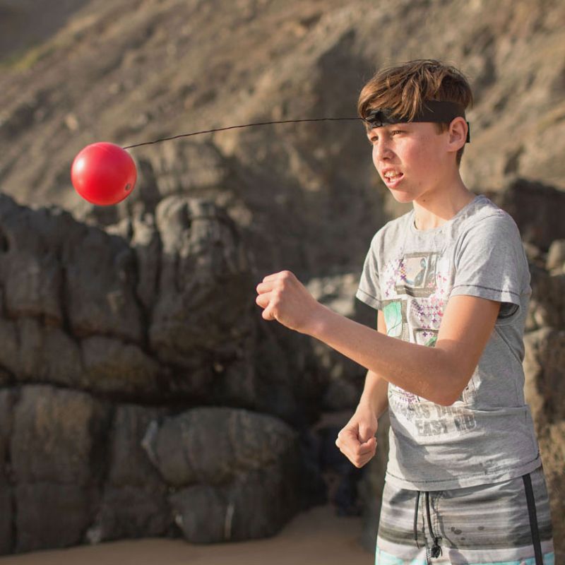 Produkt wykonany jest z dbałością o szczegóły i jest wysokiej jakości. Długość elastycznej gumki jest regulowana. Należy ją przymocować do zaczepu znajdującego się w opasce tak, aby sięgała od czoła do wyciągniętej ręki. Następnie załóż opaskę na głowę w ten sposób, aby piłka wisiała przed twarzą.