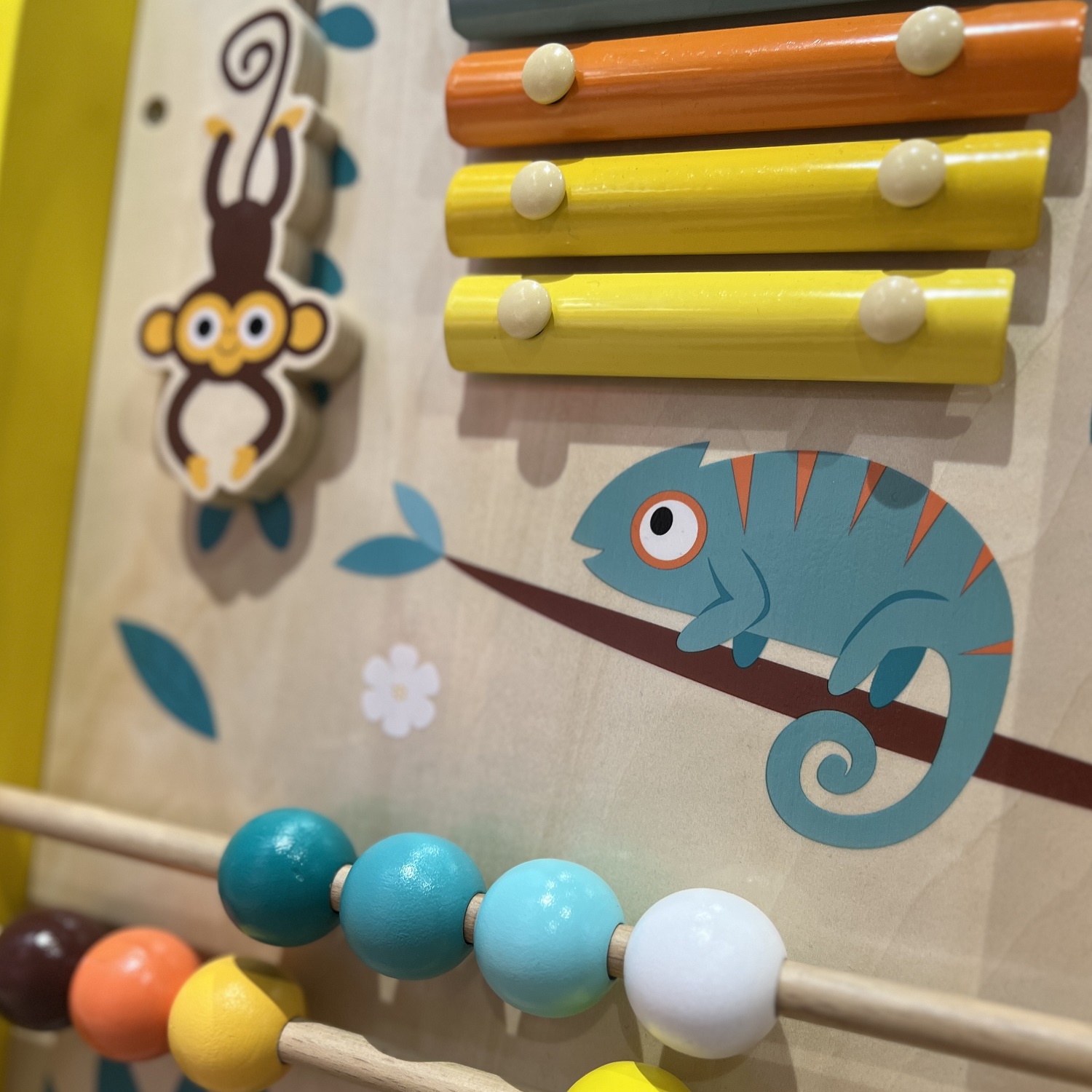 Pchacz stanowi źródło rozwoju małej i dużej motoryki. Oferuję mnóstwo aktywności - trzy ścianki pchacza stanowią przestrzeń dla: liczydła, sortera kształtów, pętli z elementami do przesuwania, toru z elementami do przesuwania, cymbałków (5 klawiszy i 2 pałeczki w zestawie) i przesuwnej małpki, która grzechocze. Zabawa nimi to równocześnie nauka, np. przesuwanie klocków po pętlach czy po torze rozwija koordynację ruchową i małą motorykę, sorter pomaga rozróżniać kolory i kształty, liczydło to wprowadzenie do matematyki, a cymbałki – do gry na instrumentach i muzyki.
