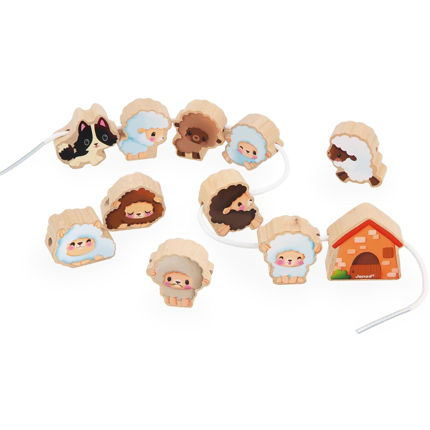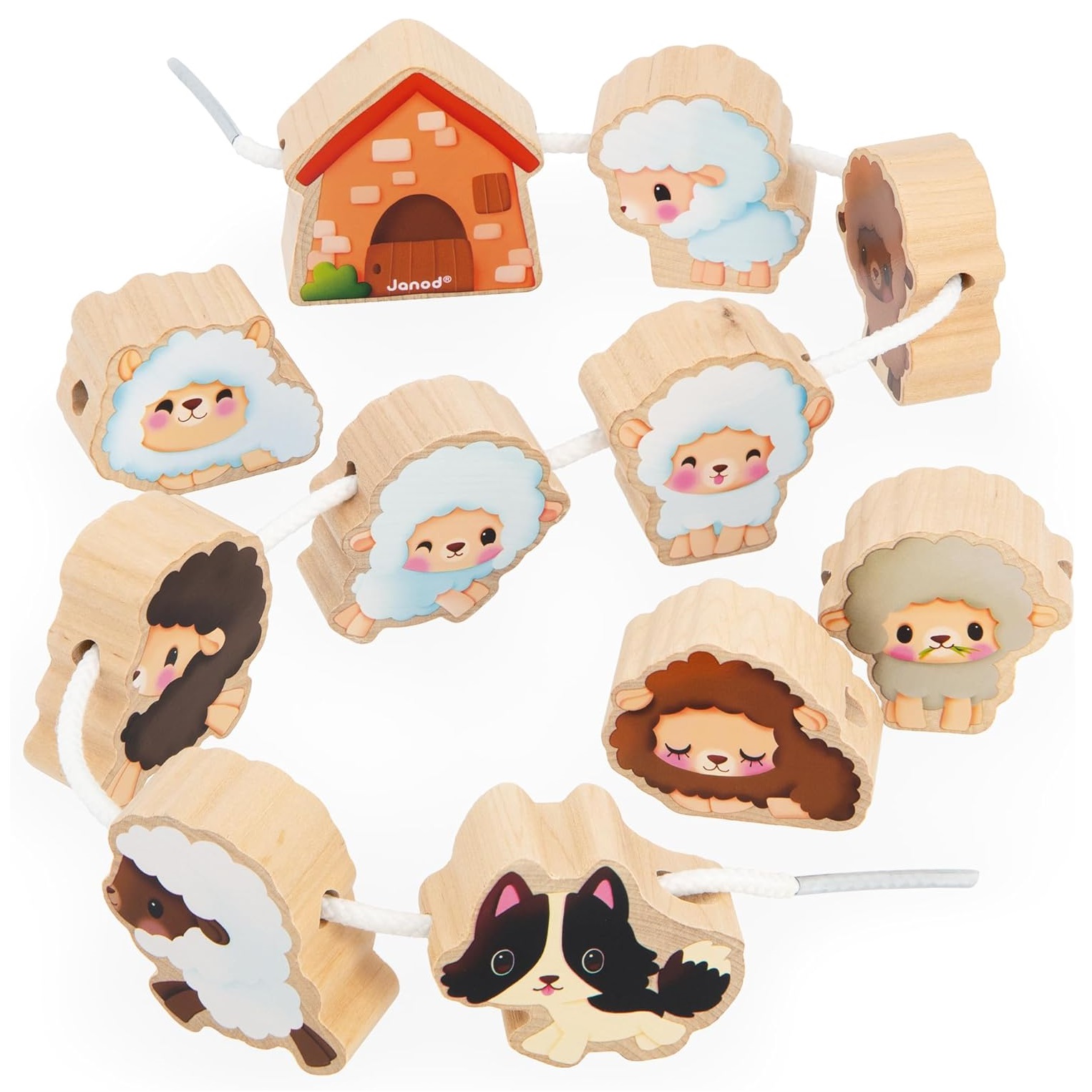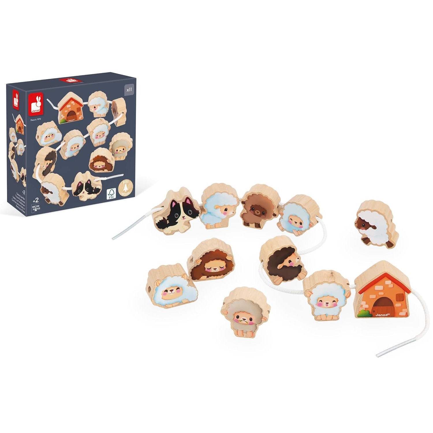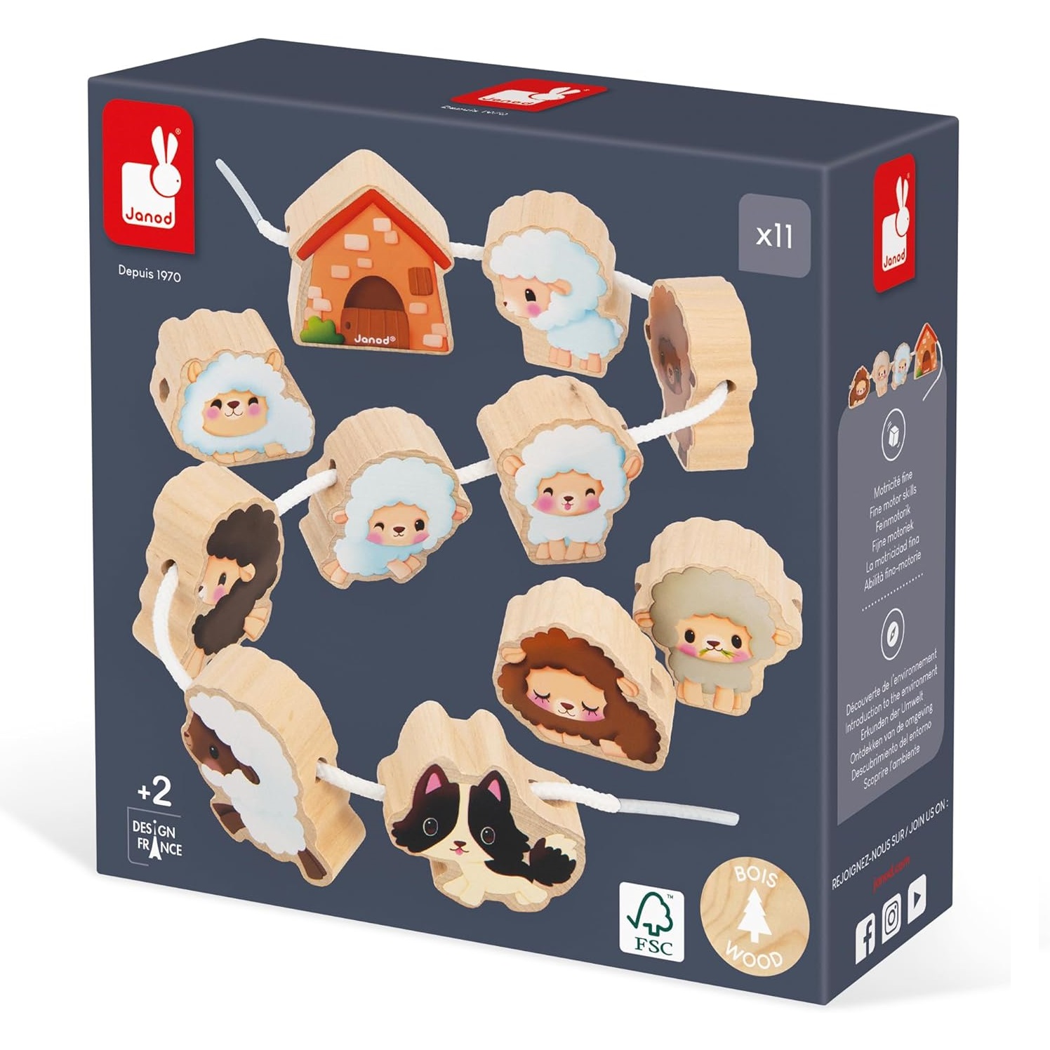 Nawlekanka z drewnianymi owieczkami z kolekcji Farma francuskiej marki JANOD to zabawka, rozwijająca małą motorykę, koordynację ręka-oko, sprawność dłoni i palców oraz skupiająca uwagę dziecka.