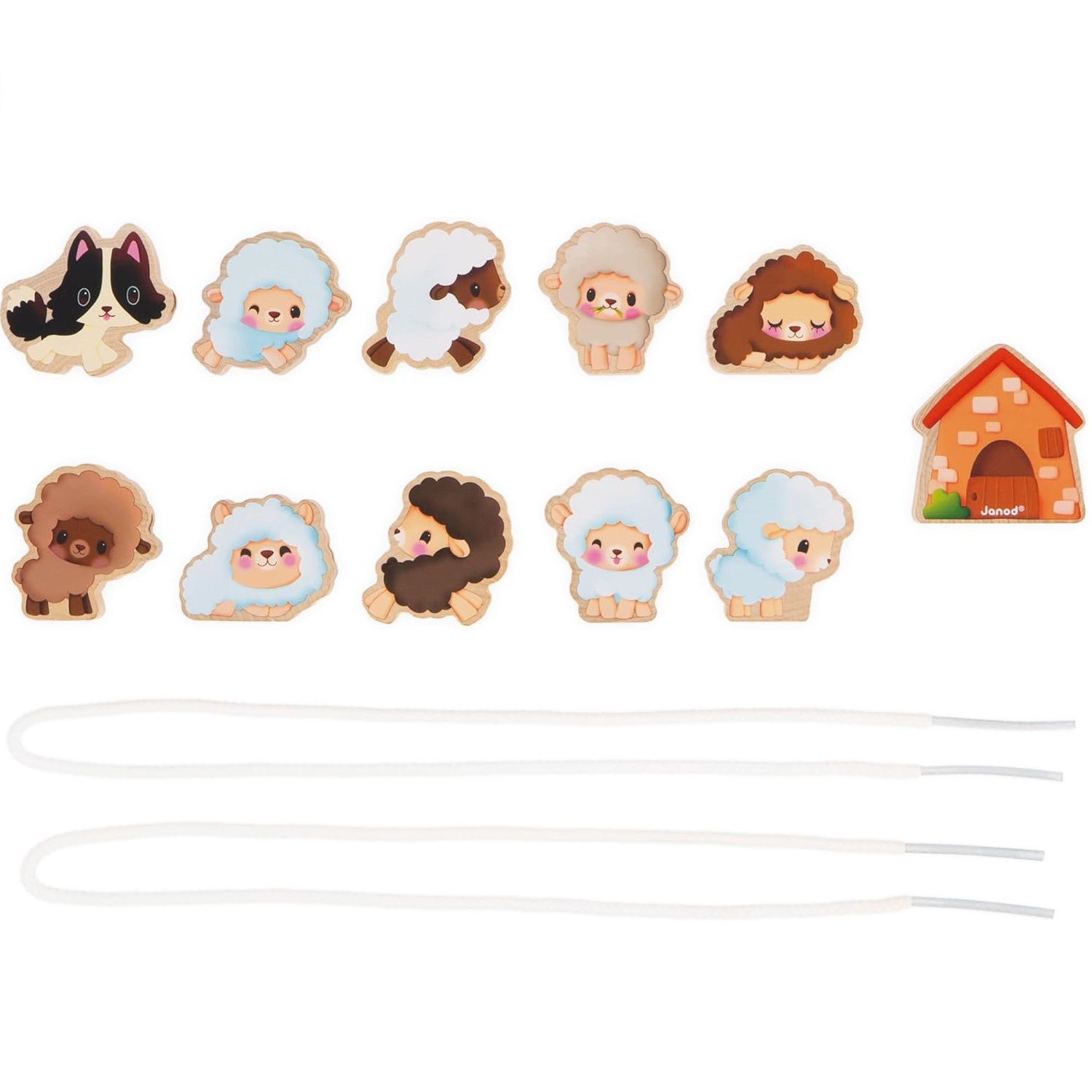 W zestawie są dwa białe sznurki z laminowanymi końcówkami, na które można nawlekać drewniane elementy: 9 owieczek, 1 budynek farmy i 1 psa pasterskiego, tworząc przy tym różne opowieści z życia na farmie. Zabawka została zaprojektowana we Francji. Zapakowana jest w estetyczne kartonowe pudełko. Idealnie nadaje się na prezent.