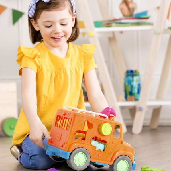 Ciężarówka jest nie tylko pojazdem, ale również wspaniałym sorterem gwarantującym świetną zabawę. Tył samochodu posiada klapę, dzięki której można go otworzyć i bez problemu wyjąć klocki na zewnątrz. Zestaw składa się z 8 plastikowych klocków (każdy posiada inny kształt) zwierząt oraz brył geometrycznych z motywem owoców. Podczas zabawy maluch rozwinie zdolności motoryczne, poprawi koordynację ręka-oko oraz zręczność.