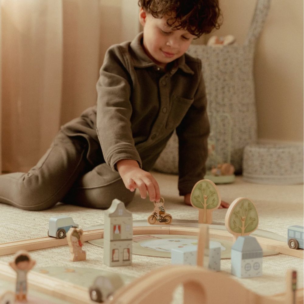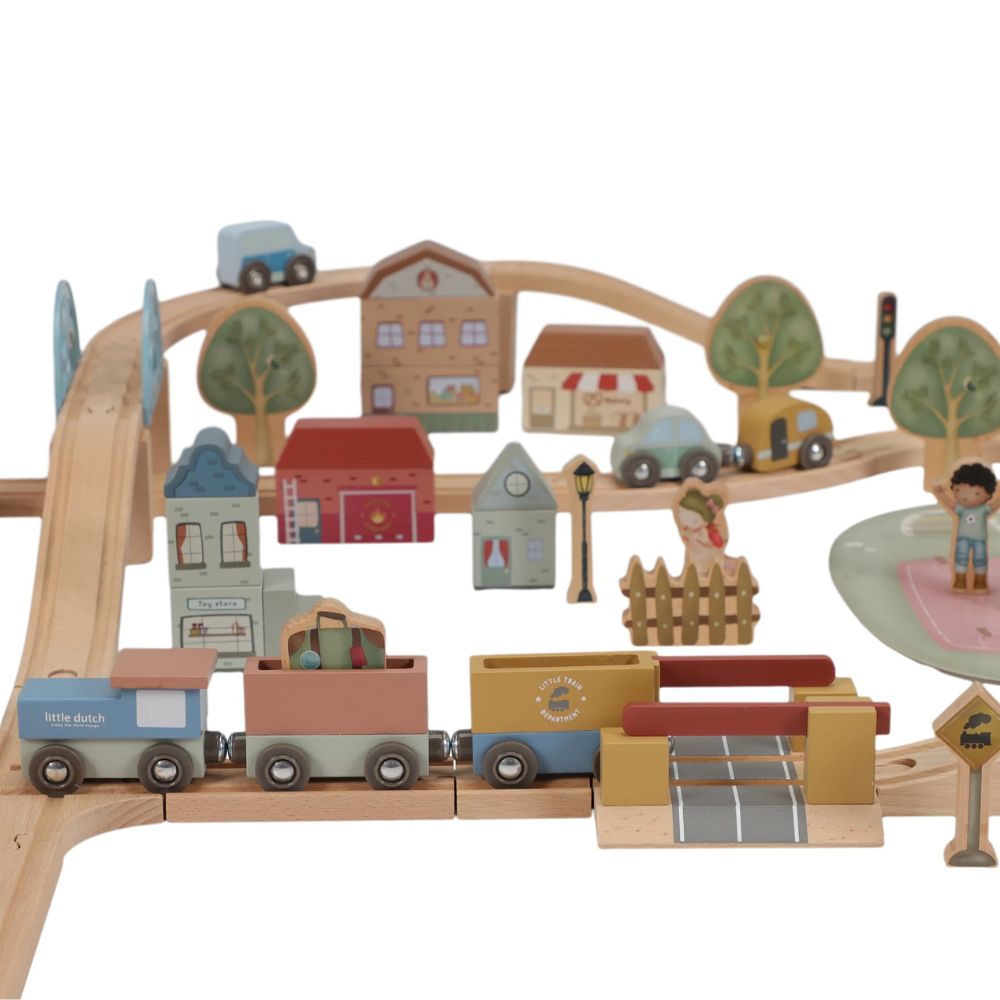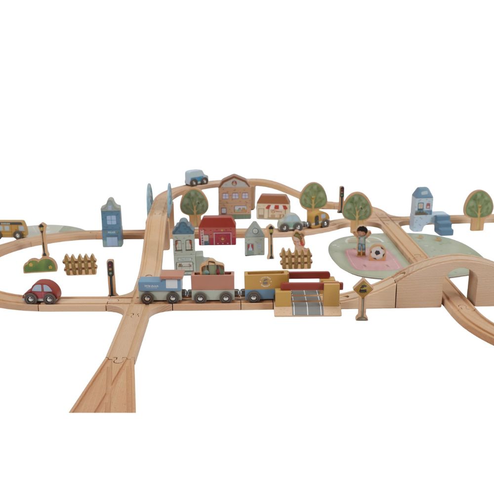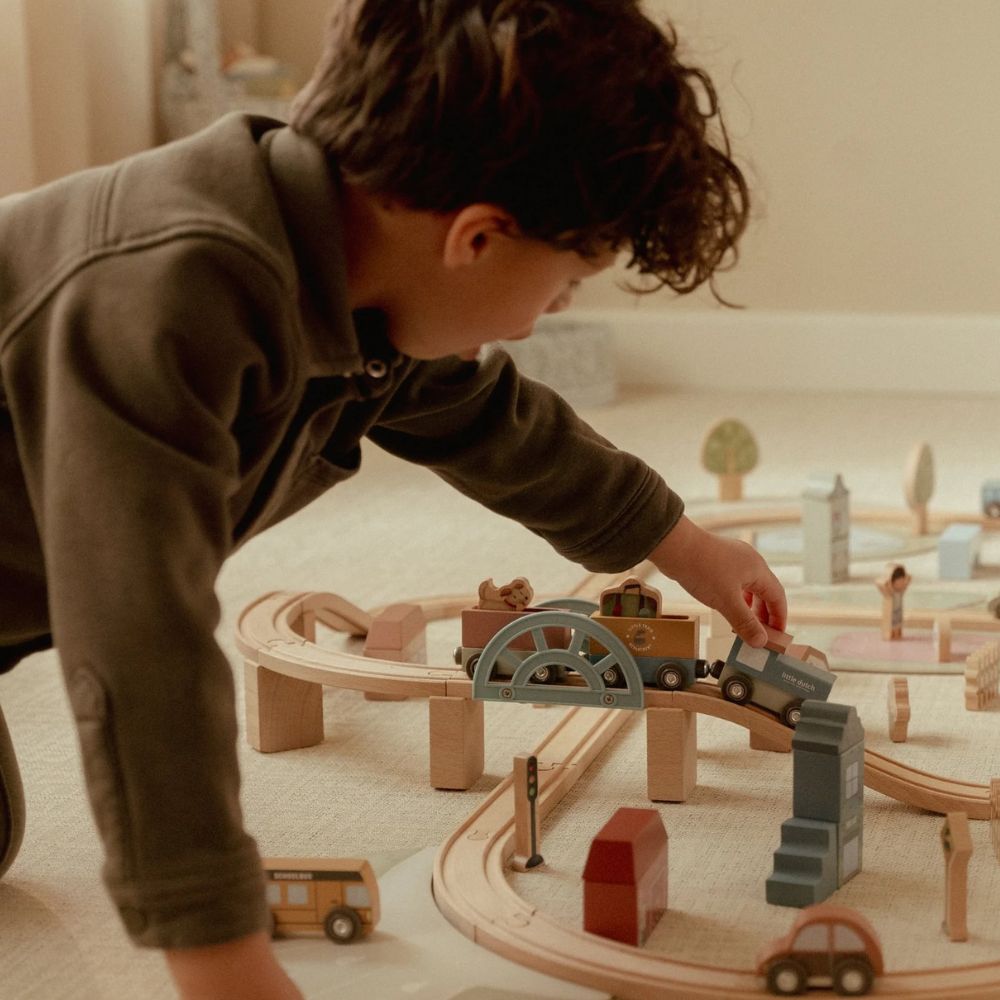 Drewniana kolejka Little Dutch to prawdziwa gratka dla małych miłośników podróży i budowania własnych miasteczek. W zestawie znajdziesz ponad 100 elementów, które pozwolą stworzyć pełne życia miasto – z pociągami, samochodami, pięknymi domkami, szkołą, sklepem i kościółkiem. W trasie pojawią się też zwierzątka, drzewa oraz znaki drogowe, które wprowadzą dziecko w świat zasad ruchu drogowego. Każda zabawa to nowa przygoda – wystarczy ułożyć kolejkę w inny sposób, a historia potoczy się inaczej!