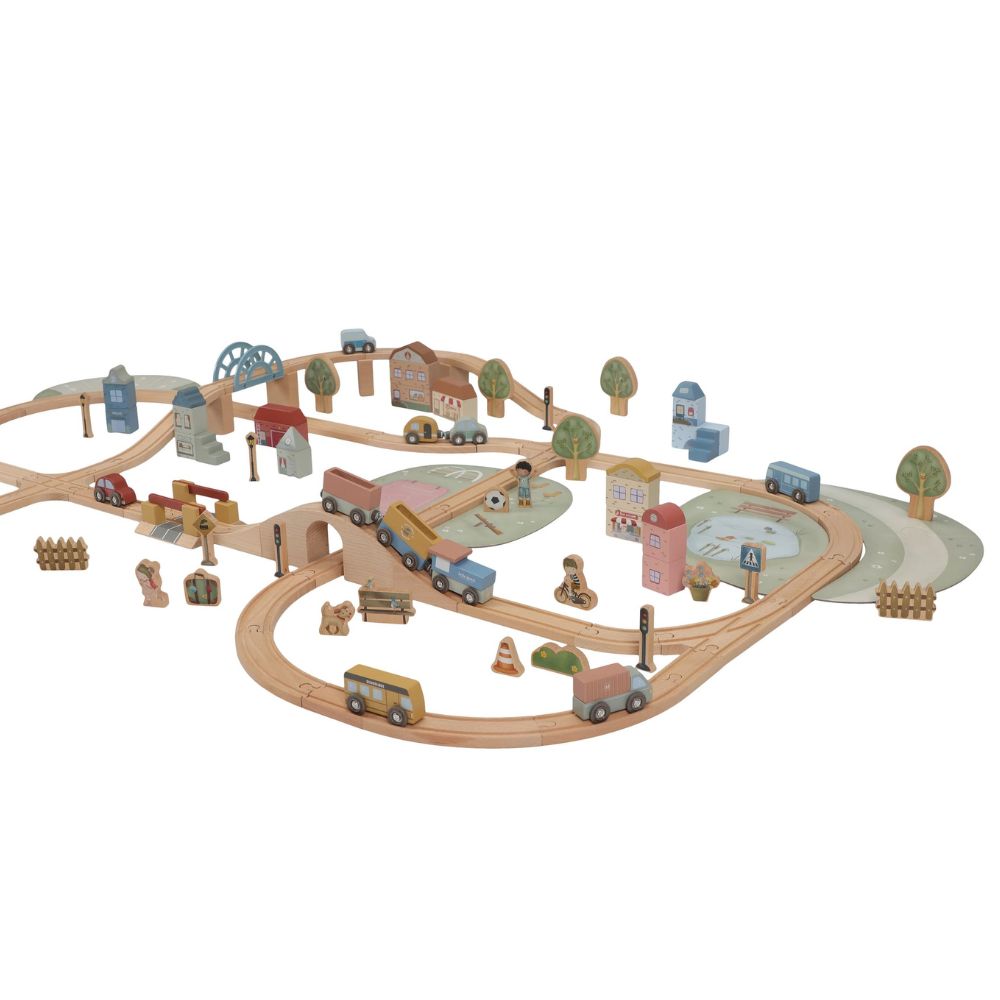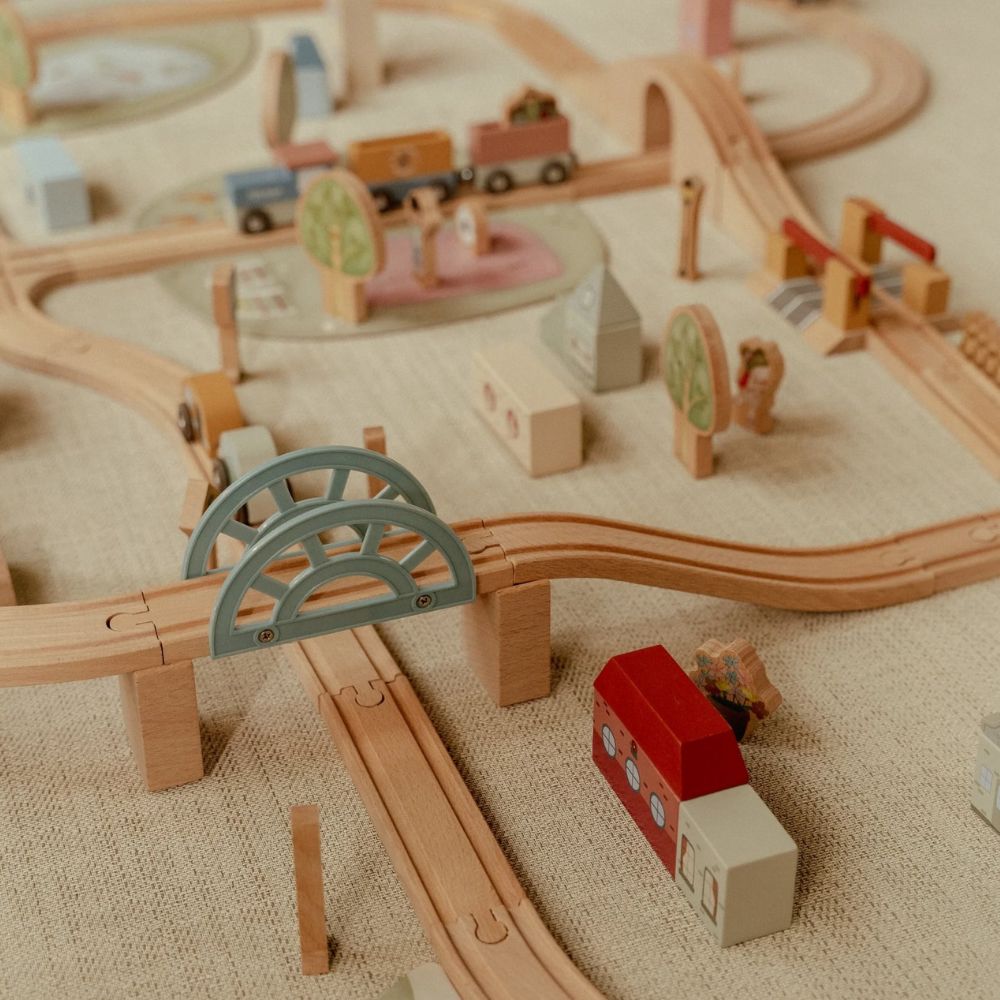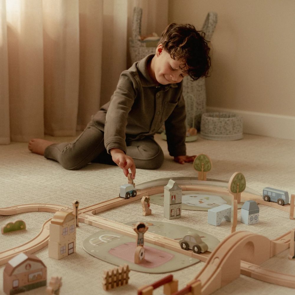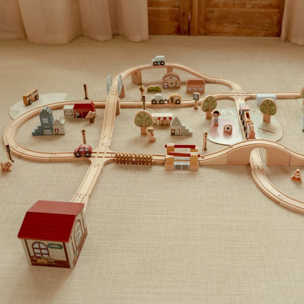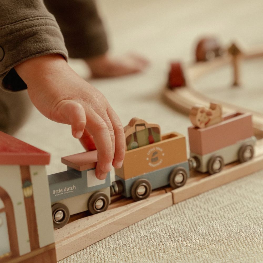 Drewniana kolejka Little Dutch to prawdziwa gratka dla małych miłośników podróży i budowania własnych miasteczek. W zestawie znajdziesz ponad 100 elementów, które pozwolą stworzyć pełne życia miasto – z pociągami, samochodami, pięknymi domkami, szkołą, sklepem i kościółkiem. W trasie pojawią się też zwierzątka, drzewa oraz znaki drogowe, które wprowadzą dziecko w świat zasad ruchu drogowego. Każda zabawa to nowa przygoda – wystarczy ułożyć kolejkę w inny sposób, a historia potoczy się inaczej!