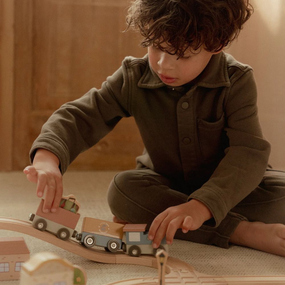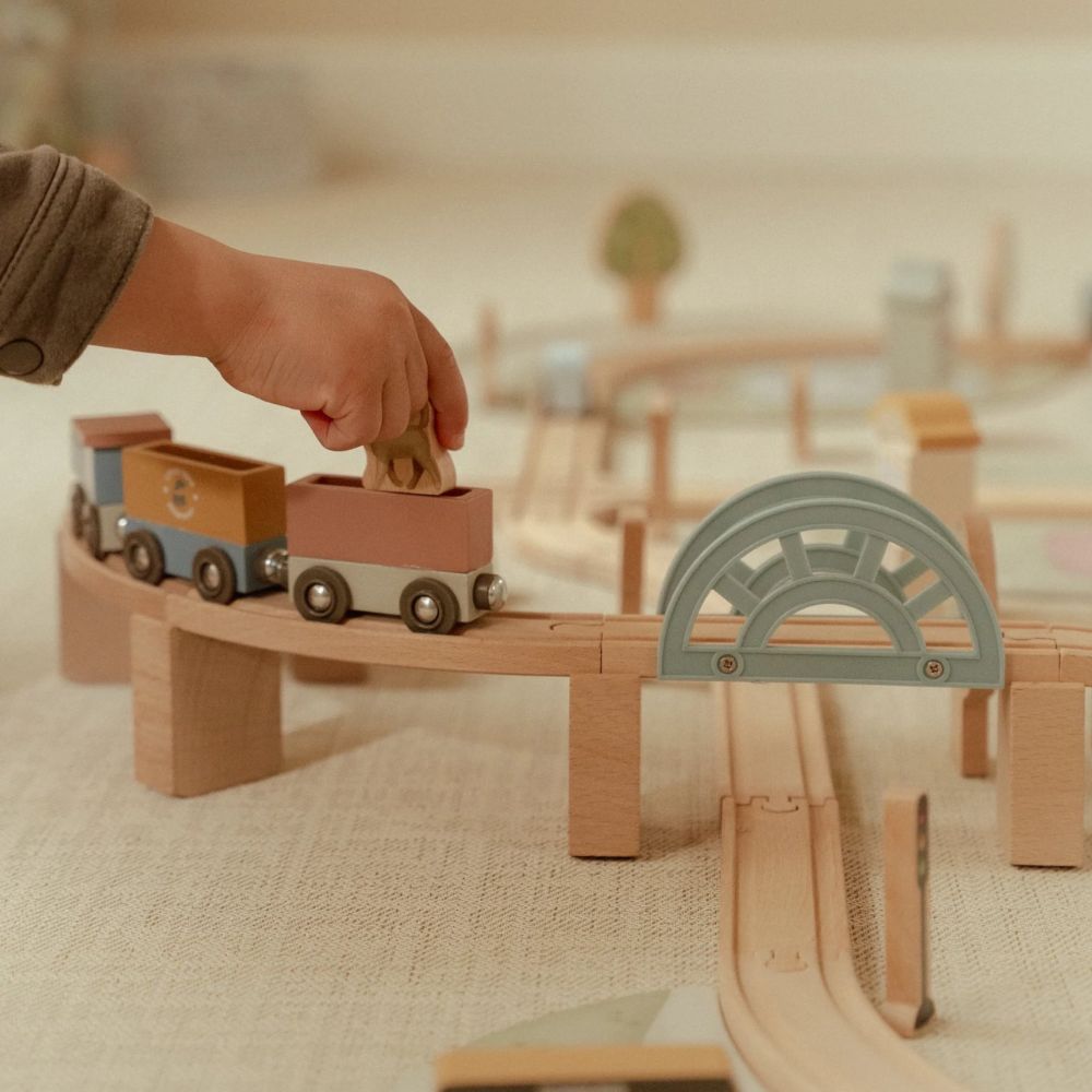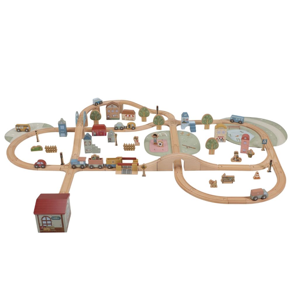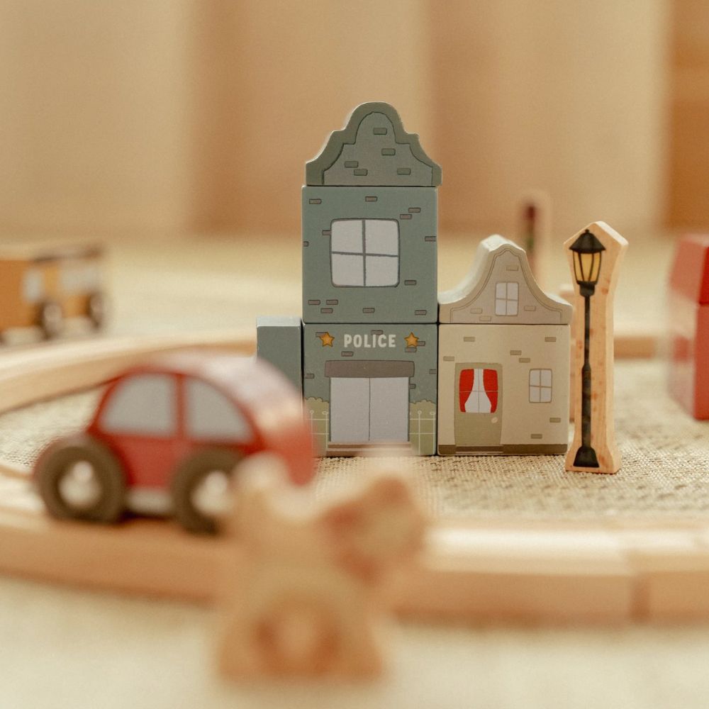 Drewniana kolejka Little Dutch to prawdziwa gratka dla małych miłośników podróży i budowania własnych miasteczek. W zestawie znajdziesz ponad 100 elementów, które pozwolą stworzyć pełne życia miasto – z pociągami, samochodami, pięknymi domkami, szkołą, sklepem i kościółkiem. W trasie pojawią się też zwierzątka, drzewa oraz znaki drogowe, które wprowadzą dziecko w świat zasad ruchu drogowego. Każda zabawa to nowa przygoda – wystarczy ułożyć kolejkę w inny sposób, a historia potoczy się inaczej!