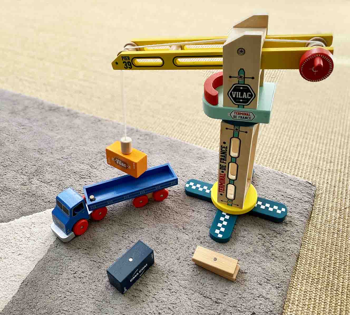Idealny zestaw dla małych miłośników motoryzacji. Dźwig posiada obrotową kabinę, z jednej strony znajduje się kołowrotek do opuszczania kontenerów, z drugiej sznurek zakończony magnesem. Do kompletu dołączone są dwa kontenery oraz dwie deseczki. Dźwig jest kompatybilny z innymi pojazdami marki Vilac do zabawy w budowę.