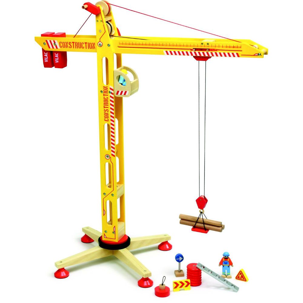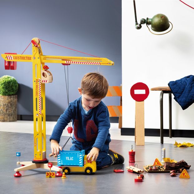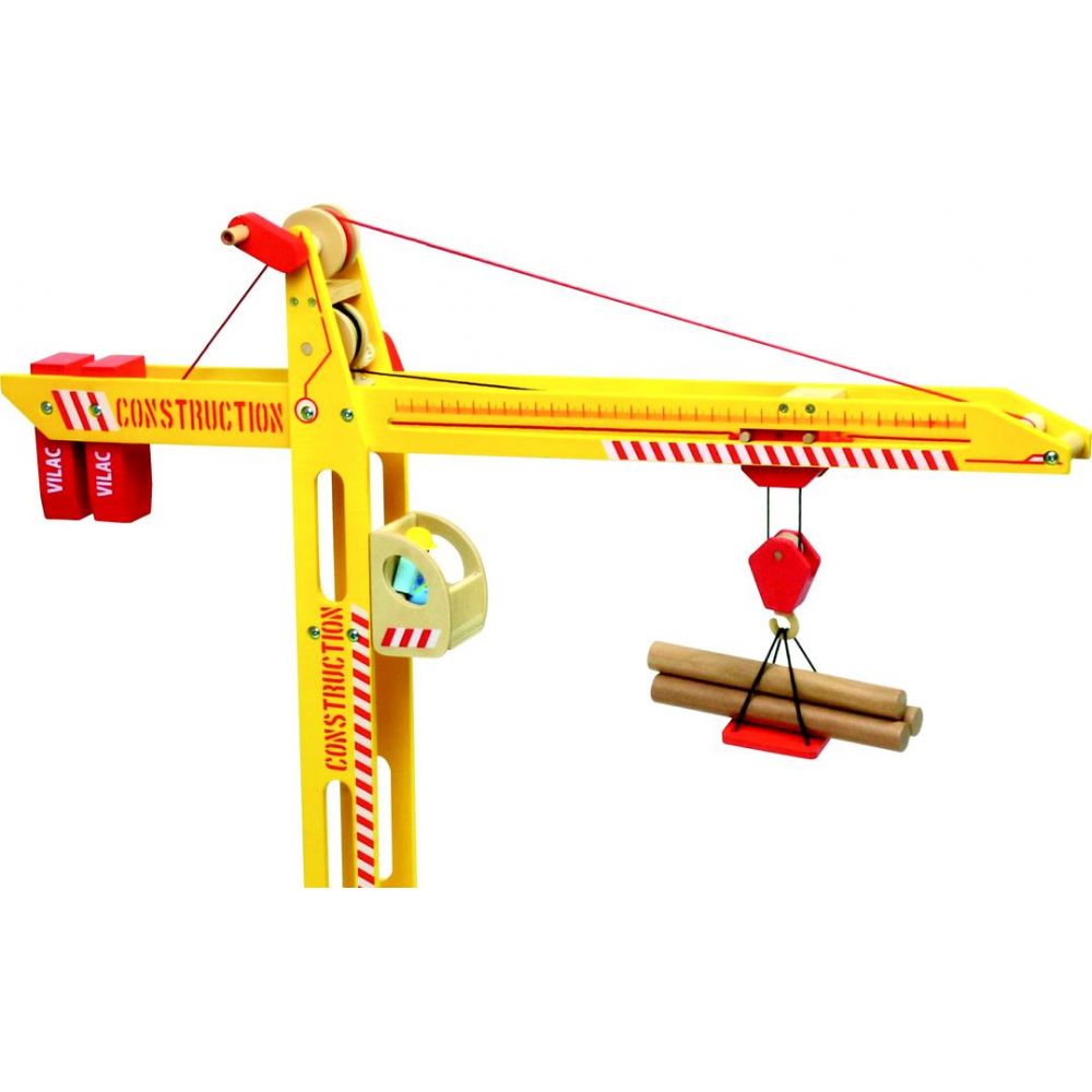 Idealny zestaw dla małych miłośników motoryzacji. Ogromny drewniany dźwig z ruchomą kabiną do zabawy w budowę pozwala podnosić i opuszczać zabawki. W zestawie 2 figurki robotników, bele drewna i znaki.
