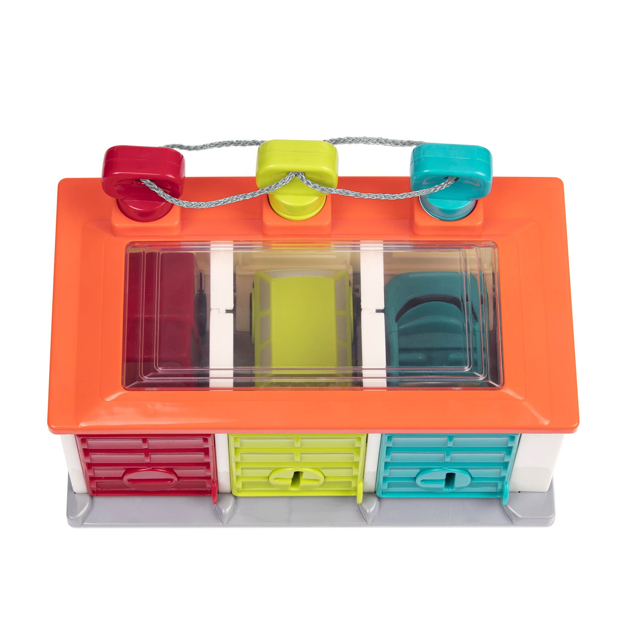 Samochodziki, bramy garażowe i klucze dopasowane kolorystycznie – tylko właściwy klucz pozwoli wyprowadzić autko z jego garażu i/lub zaparkować je we właściwym miejscu. Dodatkową atrakcję stanowi przezroczysty dach budynku oraz mechanizm powodujący, że zaparkowany samochód wyjeżdża z garażu.