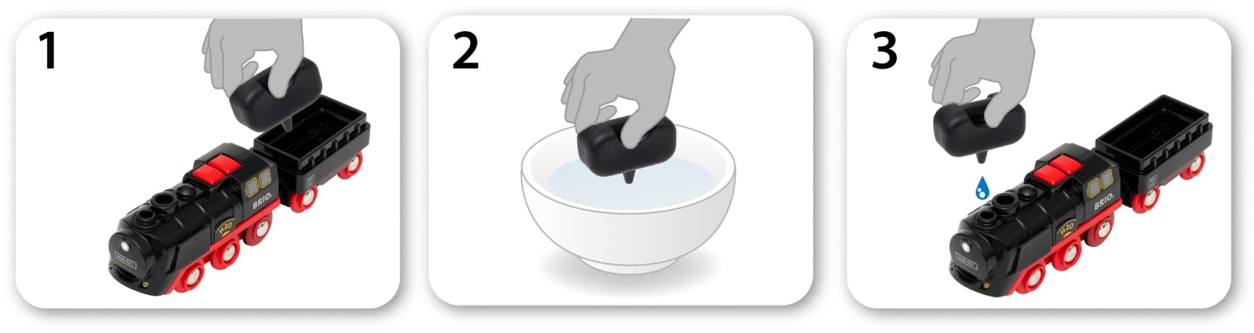 Kolejka BRIO World buchająca dymem. Kiedy mknie po szynach z jej komina wydobywa się bezpieczna para. Realistyczną parę zapewnia zasilany bateriami silnik. Można jej dotknąć i na pewno nie poparzy. Para powstaje z wody, którą łatwo uzupełnić przy pomocy ładunku umieszczonego na wagoniku. Wyjmij go, napełnij wodą, zaaplikuj wodę przez komin znajdujący się z przodu i ruszaj w drogę!