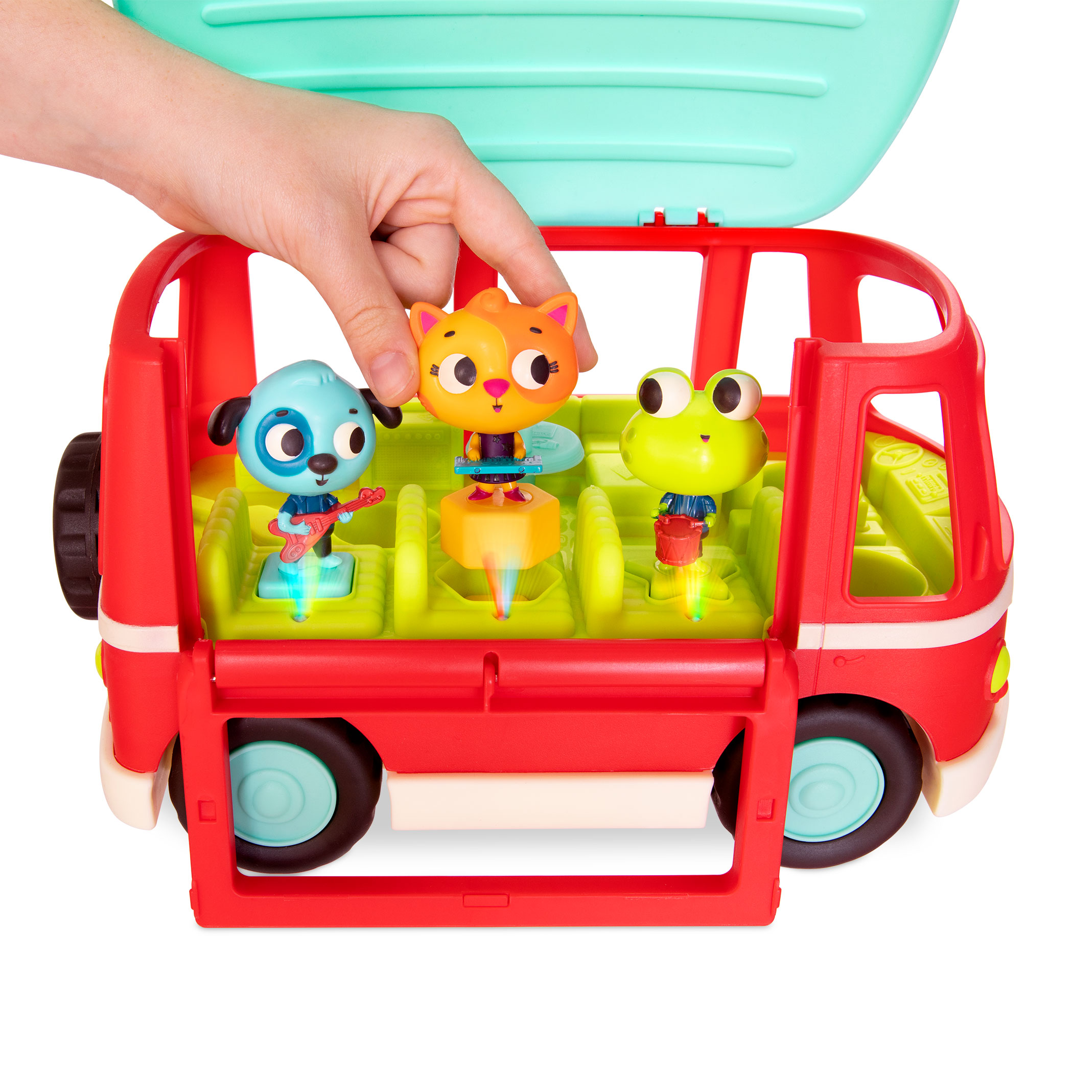 Muzyczny autobus z wesołymi pasażerami serii Land of B. (podmarka B.Toys). 4-częściowy zestaw, w skład którego wchodzą: autobus z otwieranym dachem i uchylnym bokiem, w funkcji sortera kształtów, z efektami świetlnymi i muzyką oraz trzej uroczy pasażerowie – zwierzątka – muzycy, znane postaci B.toys i Land of B.: gitarzysta – Woofer, klawiszowiec – Meowsic, perkusista – Jax (Ribbit). Każde ze zwierzątek pasuje również na miejsce kierowcy. Ustawienie figurki w tym miejscu skutkuje uruchomieniem klaksonu. Odgłosy – muzyka i efekty dźwiękowe – oraz kolorowe efekty świetlne uruchamiane poprzez naduszenie figurek.