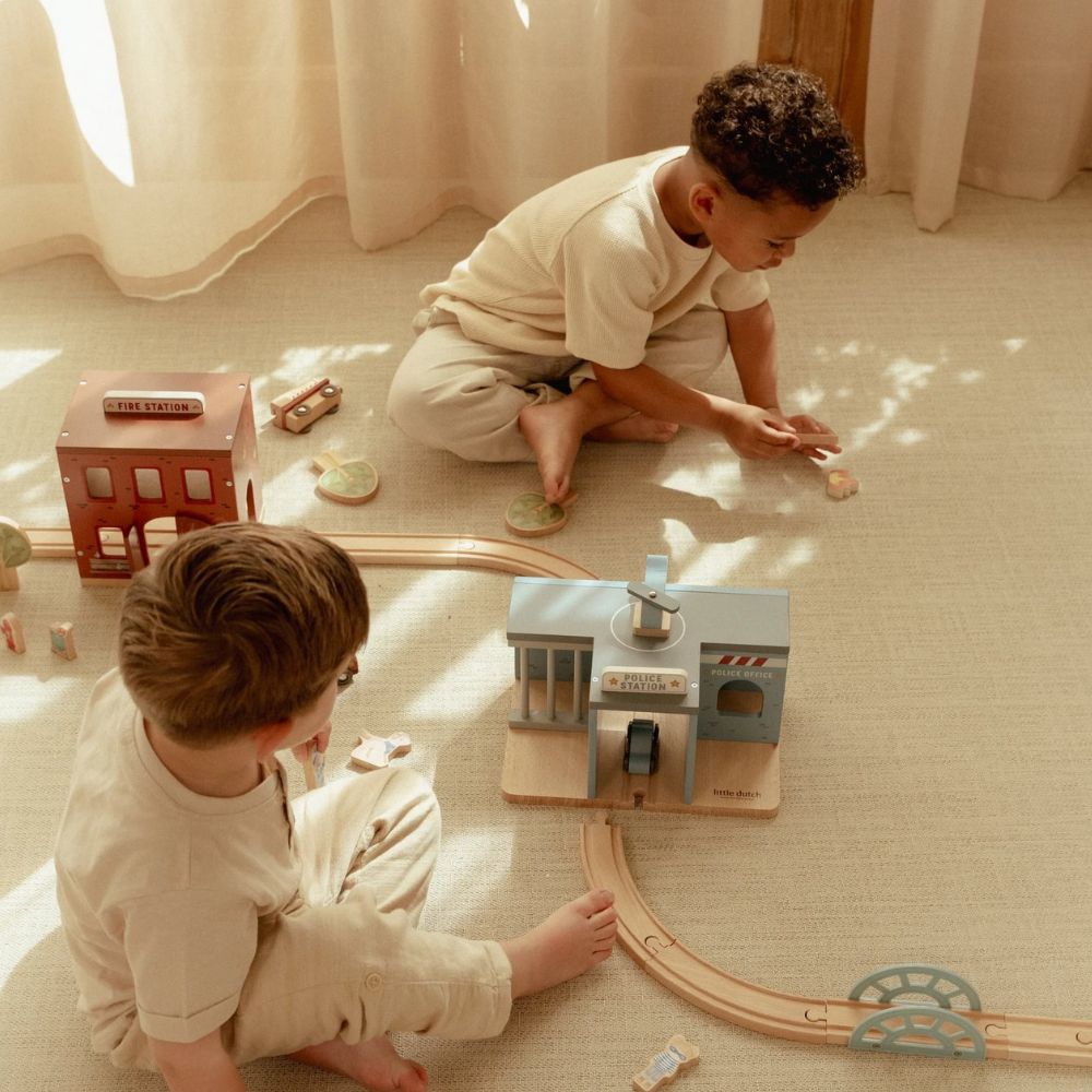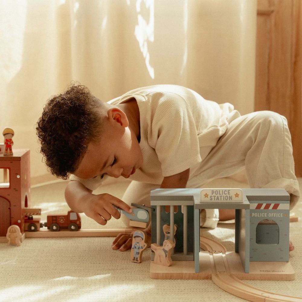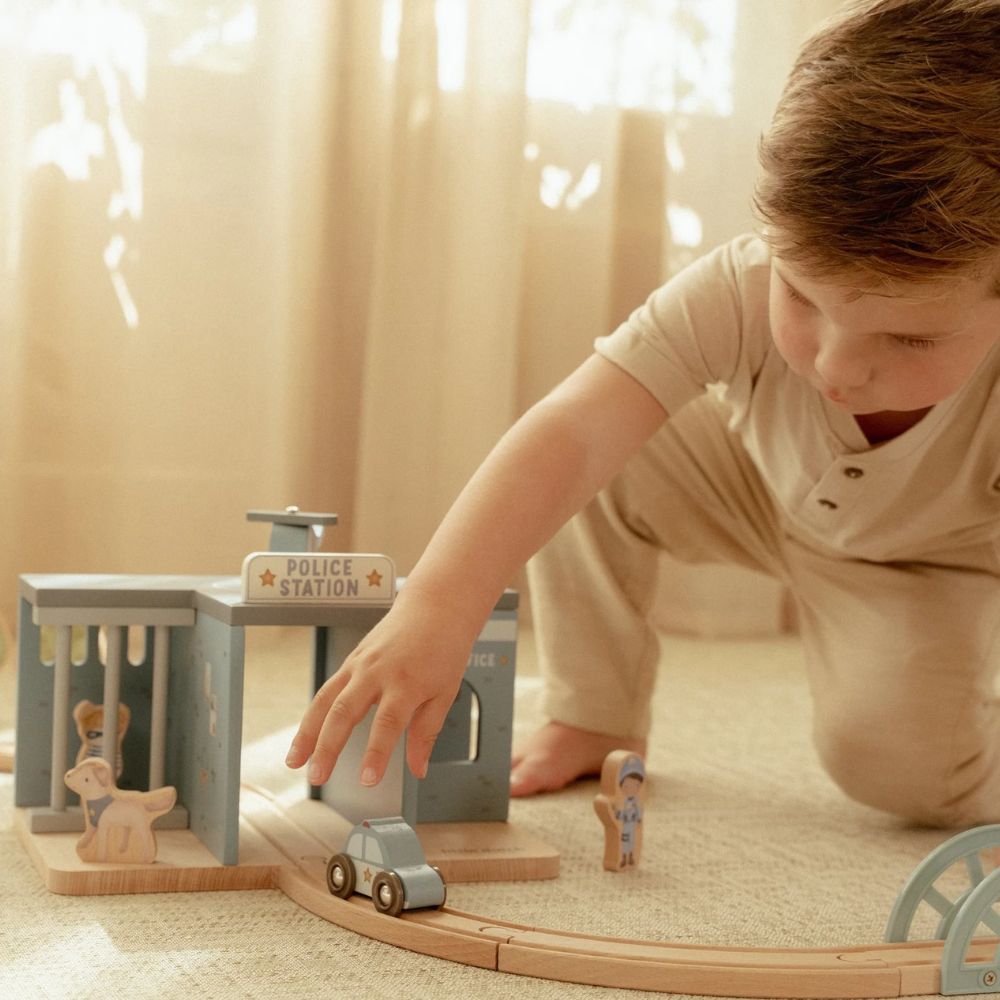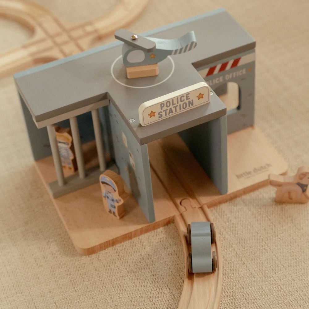 To doskonały pomysł na prezent dla 3-latka – zabawka wspiera rozwój manualny, uczy logicznego myślenia i zachęca do odgrywania ról. Co więcej, posterunek można połączyć z dużą drewnianą kolejką Little Dutch XXL (100 elementów), co otwiera jeszcze więcej możliwości zabawy.
