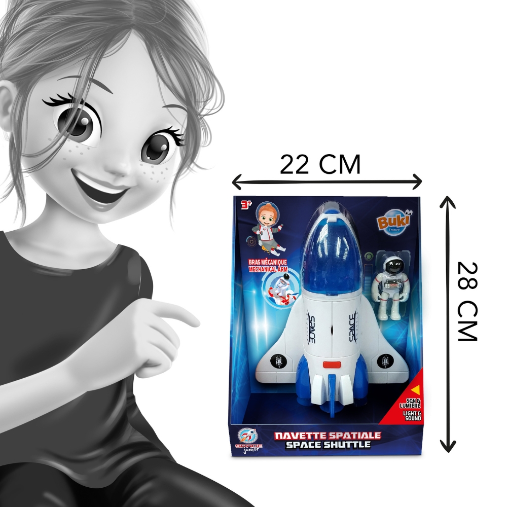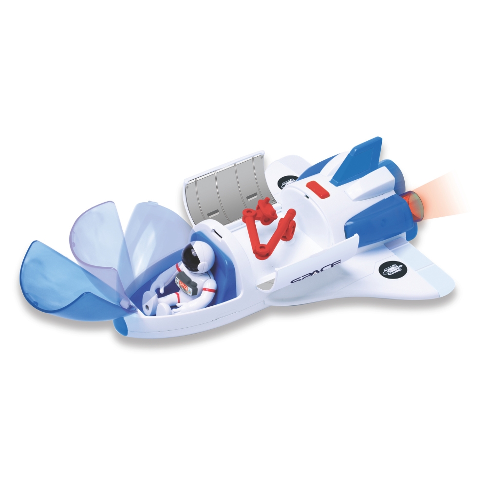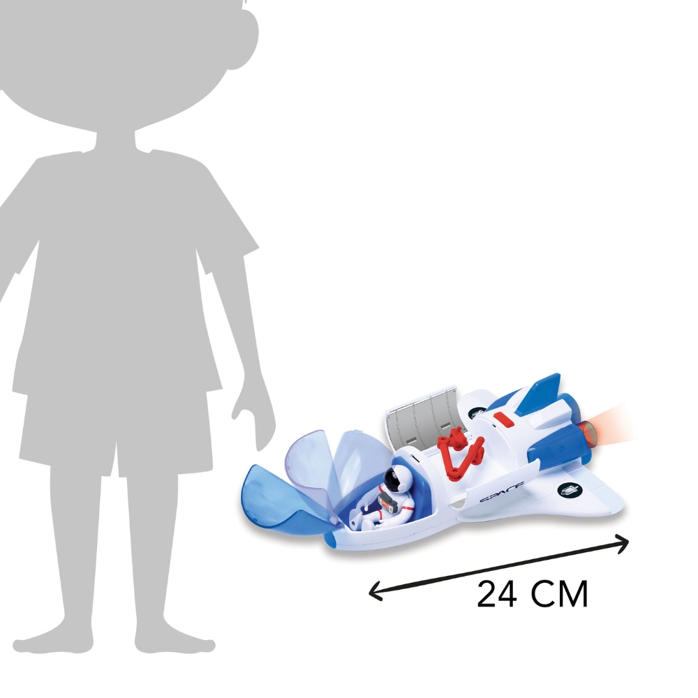 Drzwi promu można otworzyć, odkrywając wysuwane, przegubowe ramię - idealne miejsce dla dołączonego astronauty. Figurka może siedzieć w kokpicie lub stać na ramieniu, dzięki czemu maluch może odgrywać różne scenariusze misji kosmicznych, rozwijając swoją wyobraźnię i zdolności narracyjne. To świetna zabawka zarówno do samodzielnej zabawy, jak i wspólnych kosmicznych przygód z rodzicem.