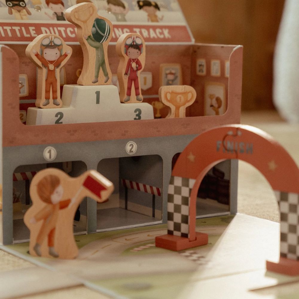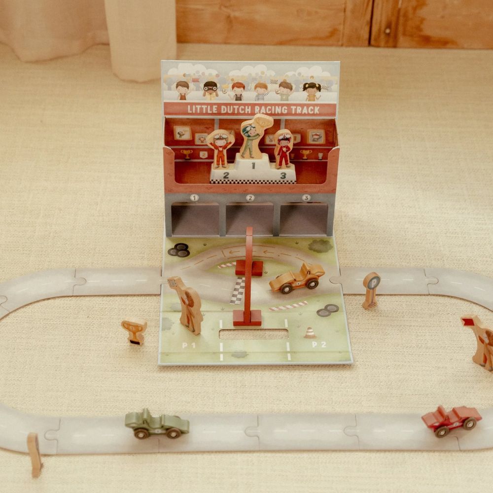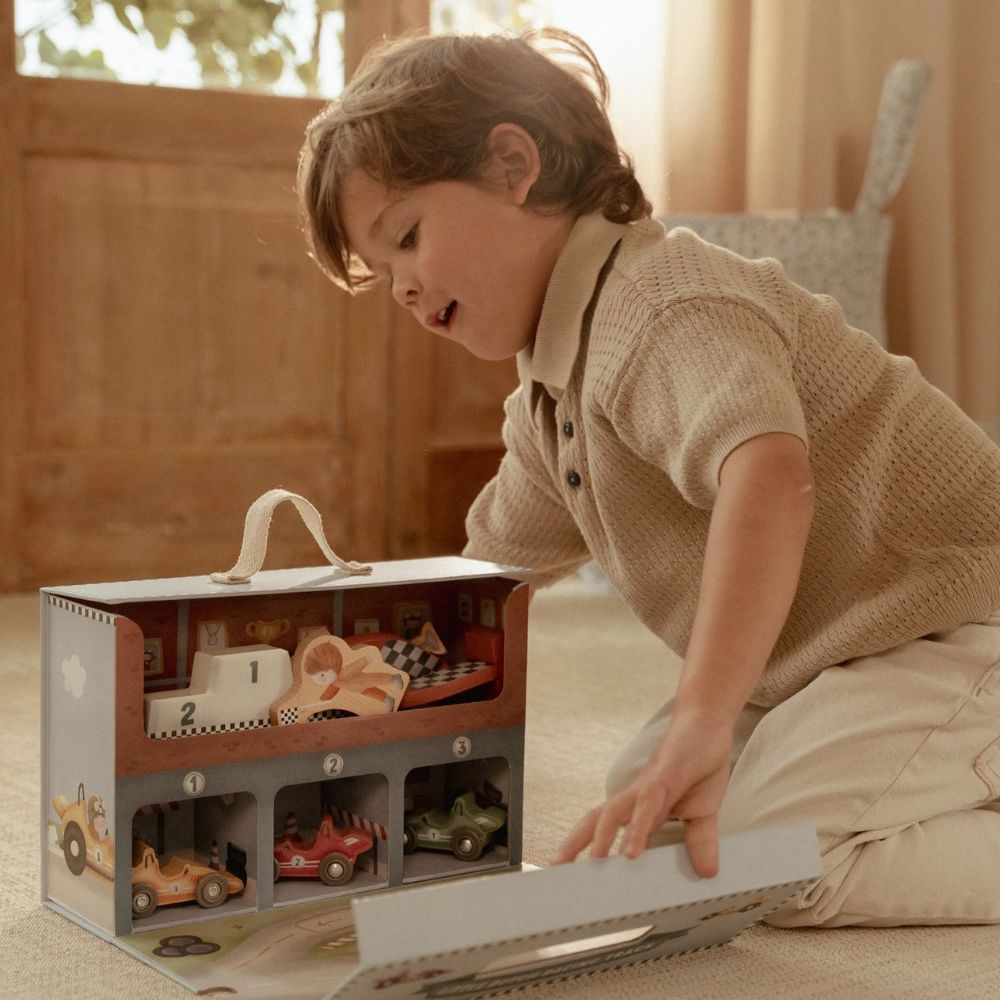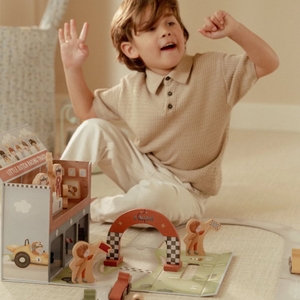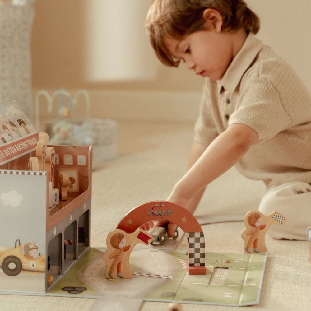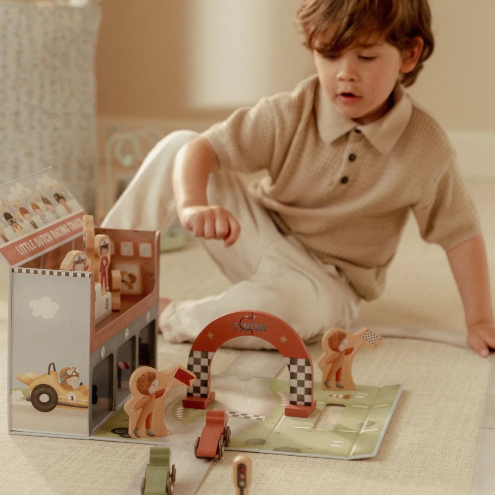 Gotowi na wielki wyścig? Ten wyjątkowy tor wyścigowy od Little Dutch to świetna propozycja dla małych fanów motoryzacji. Zestaw zapakowany jest w praktyczną walizeczkę, dzięki czemu możesz go z łatwością zabrać do przedszkola, na wakacje czy w odwiedziny do znajomych. Po rozłożeniu maluch odkryje tor z grubego kartonu, kolorowe autka oraz drewniane akcesoria, które sprawią, że zabawa stanie się jeszcze bardziej realistyczna. Po skończonym wyścigu wszystkie elementy bez problemu zmieszczą się z powrotem do walizeczki – porządek gwarantowany!
