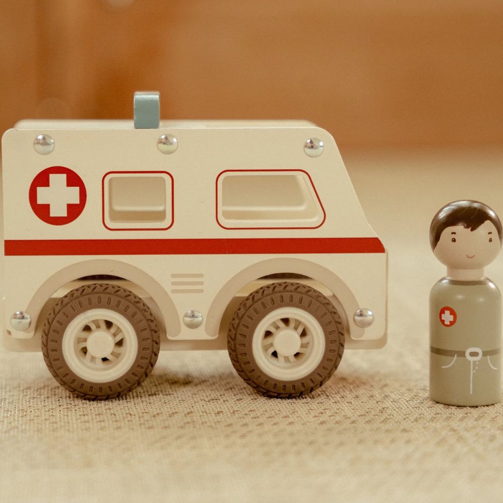 Ten uroczy drewniany ambulans to doskonała zabawka dla najmłodszych miłośników pojazdów. Dzięki wyjmowanemu ludzikowi dziecko może odgrywać scenki ratunkowe i wcielać się w rolę lekarza czy ratownika. Zabawka została zaprojektowana z myślą o małych rączkach – jej kształt i rozmiar sprawiają, że jest łatwa do chwytania i prowadzenia po podłodze. To świetny sposób na rozwijanie koordynacji ruchowej, kreatywności i umiejętności społecznych już od pierwszego roku życia. Idealny pomysł na prezent dla 1-latka, który pokocha pierwsze zabawy w odgrywanie ról.