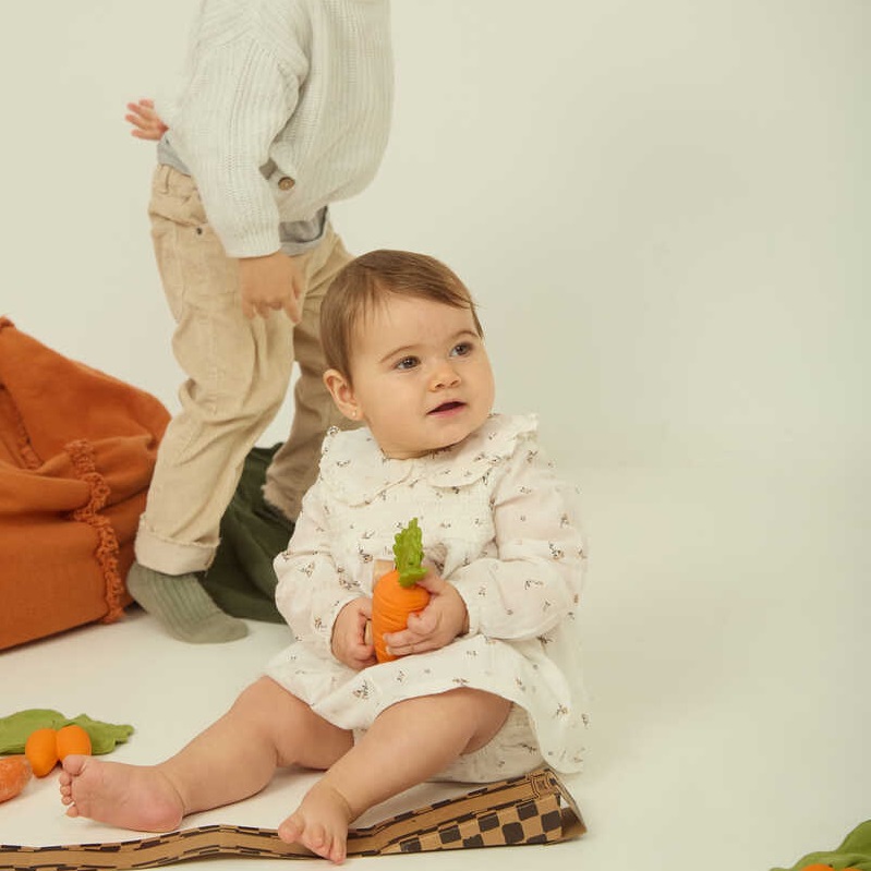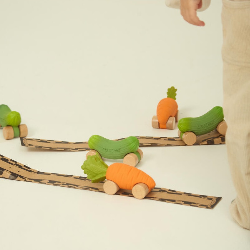 Samochodziki Oli&Carol to urzekająca linia przyjaznych dla środowiska zabawek dla niemowląt i małych dzieci w kształcie owoców i warzyw. Ten oryginalny projekt zachęca maluchy do kreatywnej zabawy, wspierając rozwój poznawczy oraz umiejętności społeczne dziecka. Samochodziki są zrobione z miękkiego, naturalnego kauczuku barwionego naturalnymi pigmentami, a koła wykonane są z drewna.