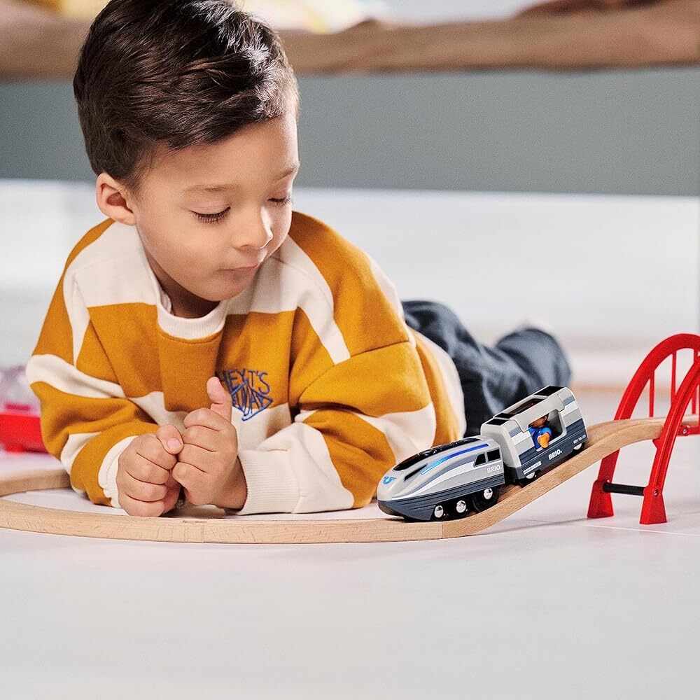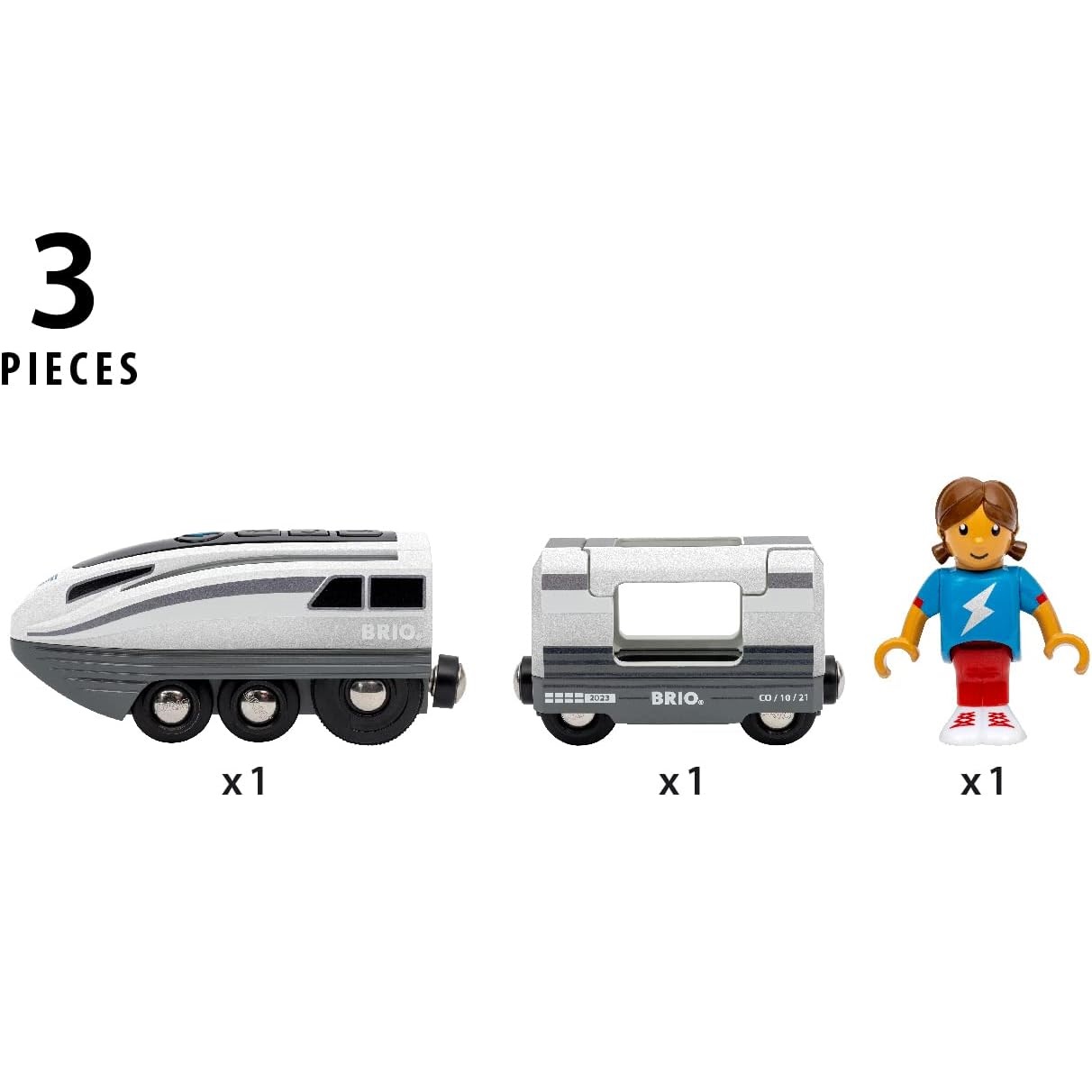 Wystarczy nacisnąć duży przycisk turbo, a ten zabawkowy pociąg na baterie podwaja swoją prędkość, dzięki czemu jest najszybszym pociągiem w świecie Brio. Turbodoładowanie trwa 5 sekund, a gdy działa z maksymalną prędkością, białe światła po bokach silnika zmieniają się na chłodny niebieski.