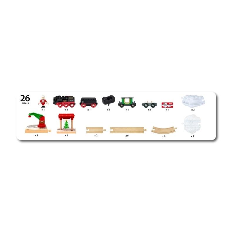 Drewniana kolejka w świątecznym przepięknym wydaniu marki BRIO. Znajdziesz tu Świetego Mikołaja, który jako konduktor dostarcza dzieciom prezenty. Ciężkie podarunki możemy podnosić małym dźwigiem, na magnesik. Jest tu także sporo śniegu i przystanek z piękną choinką.
