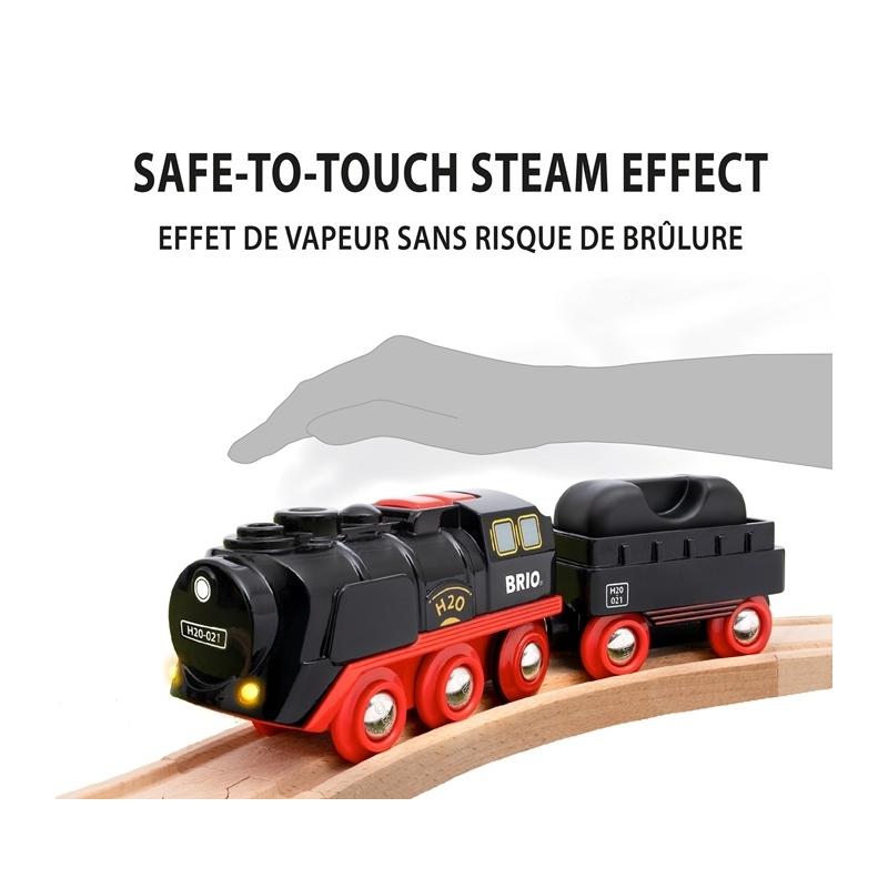 Kolejka którą znajdziesz w zestawie to niesamowity model, który faktycznie wypuszcza parę! Wystarczy wlać do niej wodę oraz wcisnąć przycisk. Dzięki specjalnemu silniczkowi zasilanego bateriami od razu pojawia się para wodna, przypominająca tą prawdziwą :)