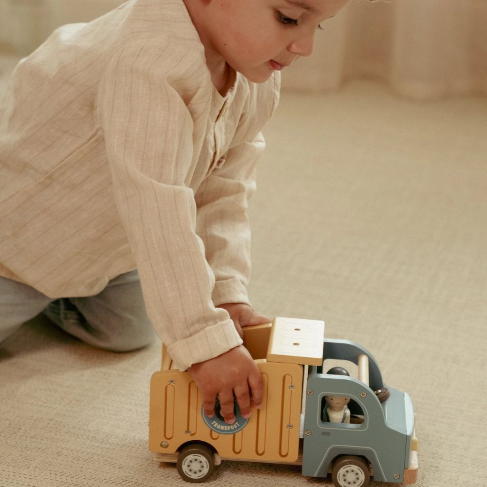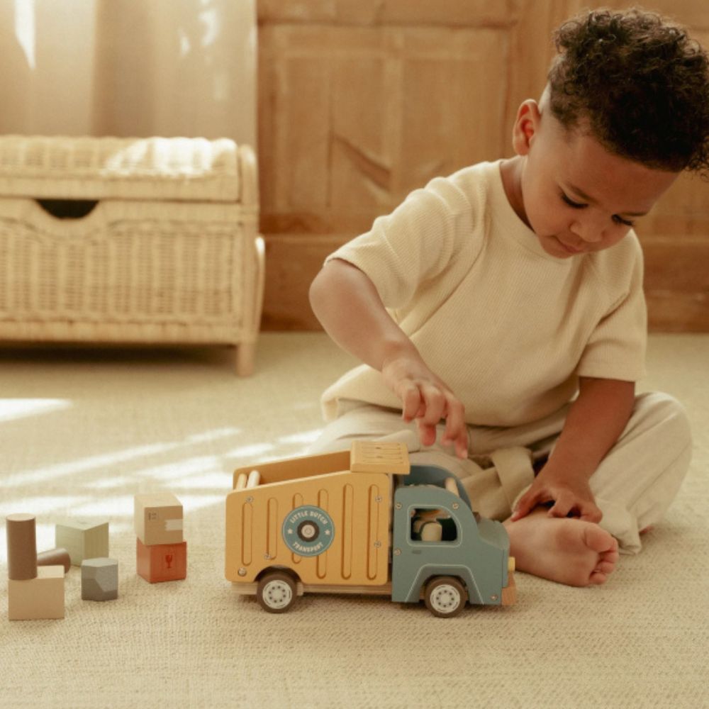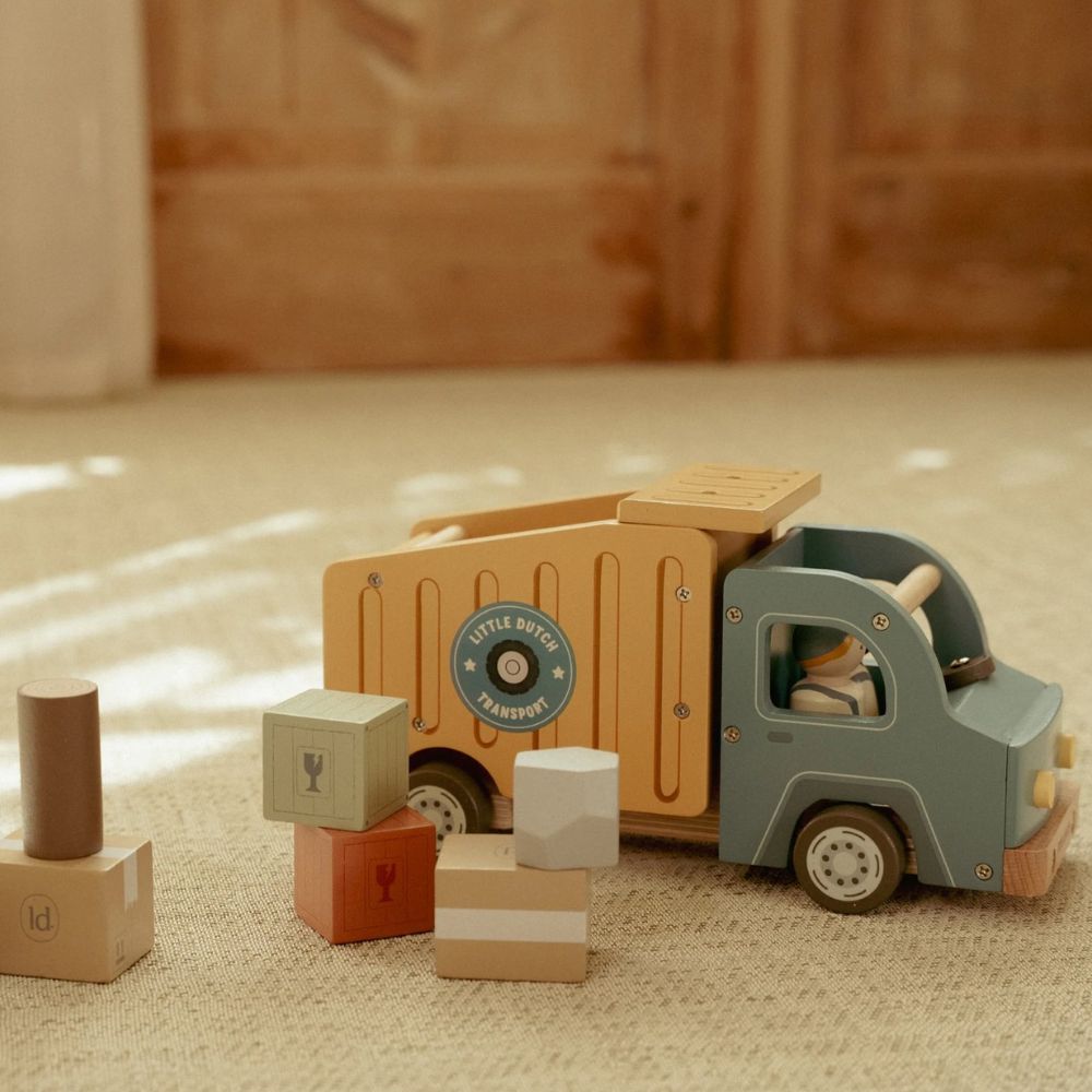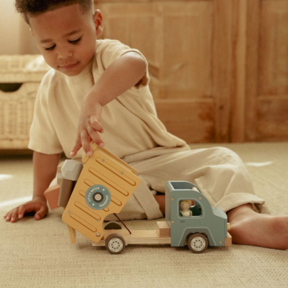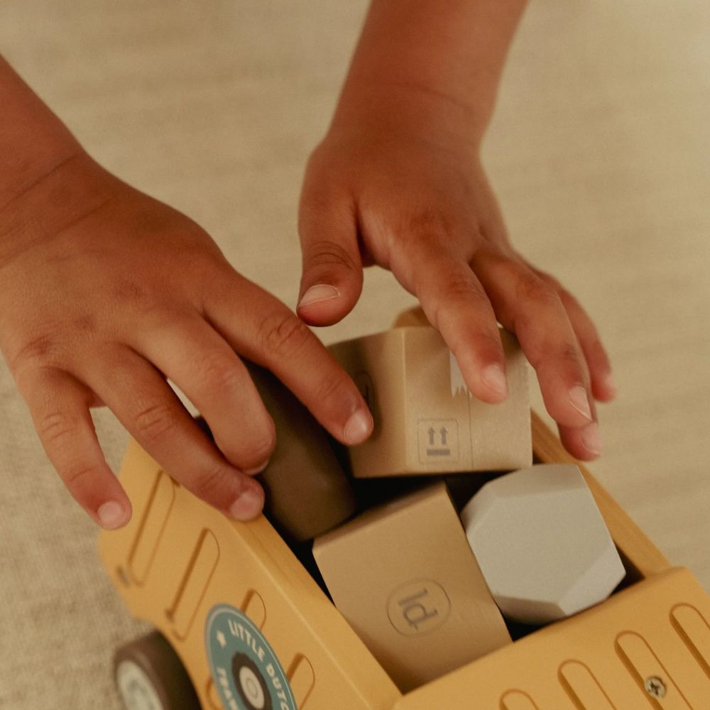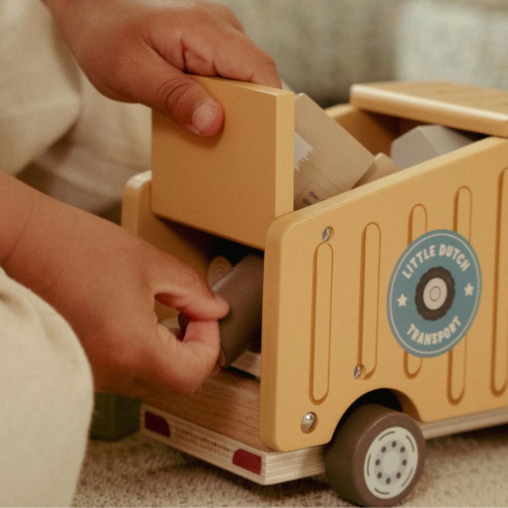 Gotowi na budowlane przygody? Drewniana wywrotka Little Dutch to wyjątkowy pojazd, który zachwyci małych fanów maszyn budowlanych. Dzięki ruchomej platformie i otwieranej tylnej klapie dzieci mogą samodzielnie przewozić i rozładowywać ładunki – od kłód i kamieni po drewniane skrzynki. W kabinie czekają kierowca i pomocnik, którzy zawsze są gotowi do działania.