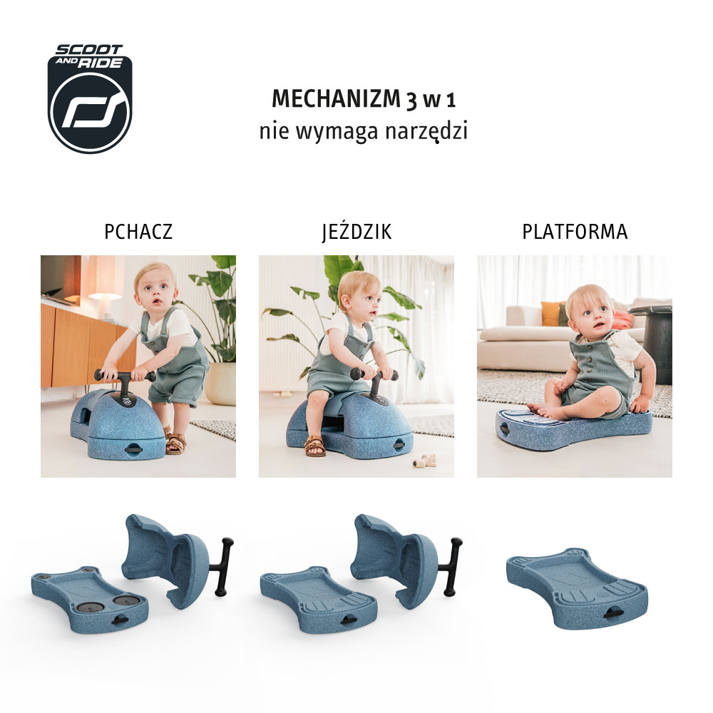 My First to innowacyjny produkt dla dzieci od 6 miesiąca życia, łączący funkcję jeździka, pchacza i platformy. Rozwija motorykę dziecka, towarzysząc mu na kolejnych etapach rozwoju. Zabawka jest idealnym towarzyszem zabaw na wiele lat. Dodatkowo pchacz, wyposażony został w schowek, który umożliwia przewożenie ulubionych zabawek czy przytulanek. Pozwól swojemu dziecku cieszyć się aktywnością fizyczną i rozwijaj jego zdolności motoryczne.