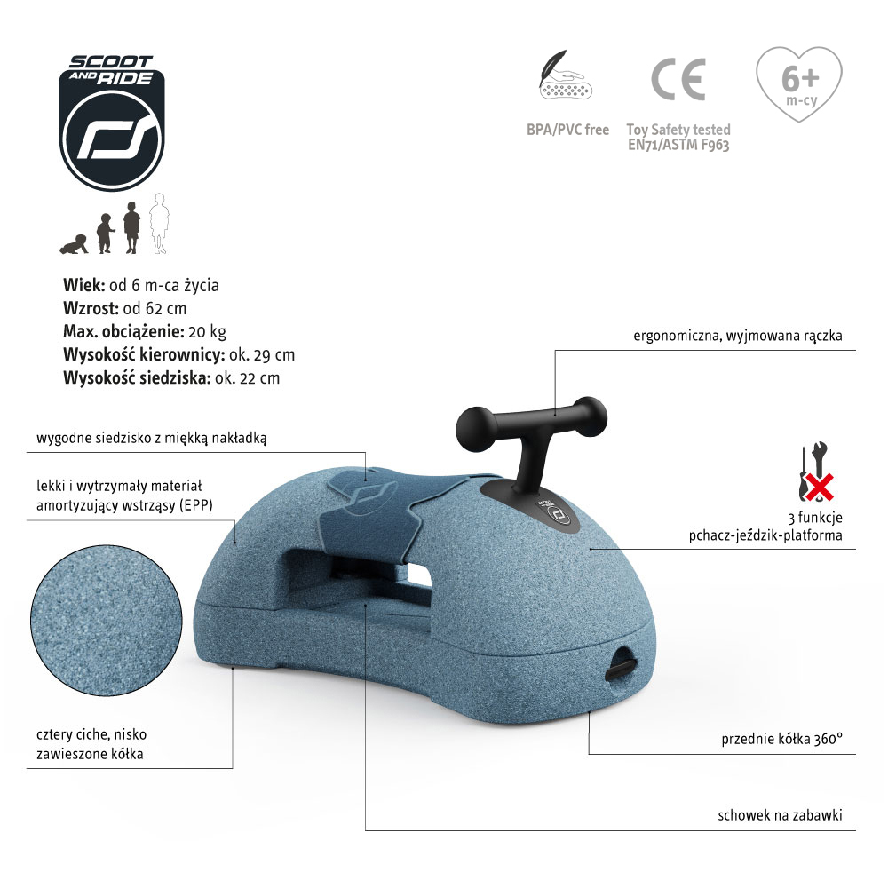 Co więcej, materiał EPP jest przyjazny dla środowiska i może być poddawany recyklingowi. W przeciwieństwie do innych materiałów, nie powoduje zagnieceń w ścianach, meblach czy na podłodze, co czyni go idealnym do użytku domowego. Dzięki temu jeździk My First nie tylko zapewnia maksymalną ochronę, ale także dba o nasze otoczenie i zwiększa naszą świadomość ekologiczną.