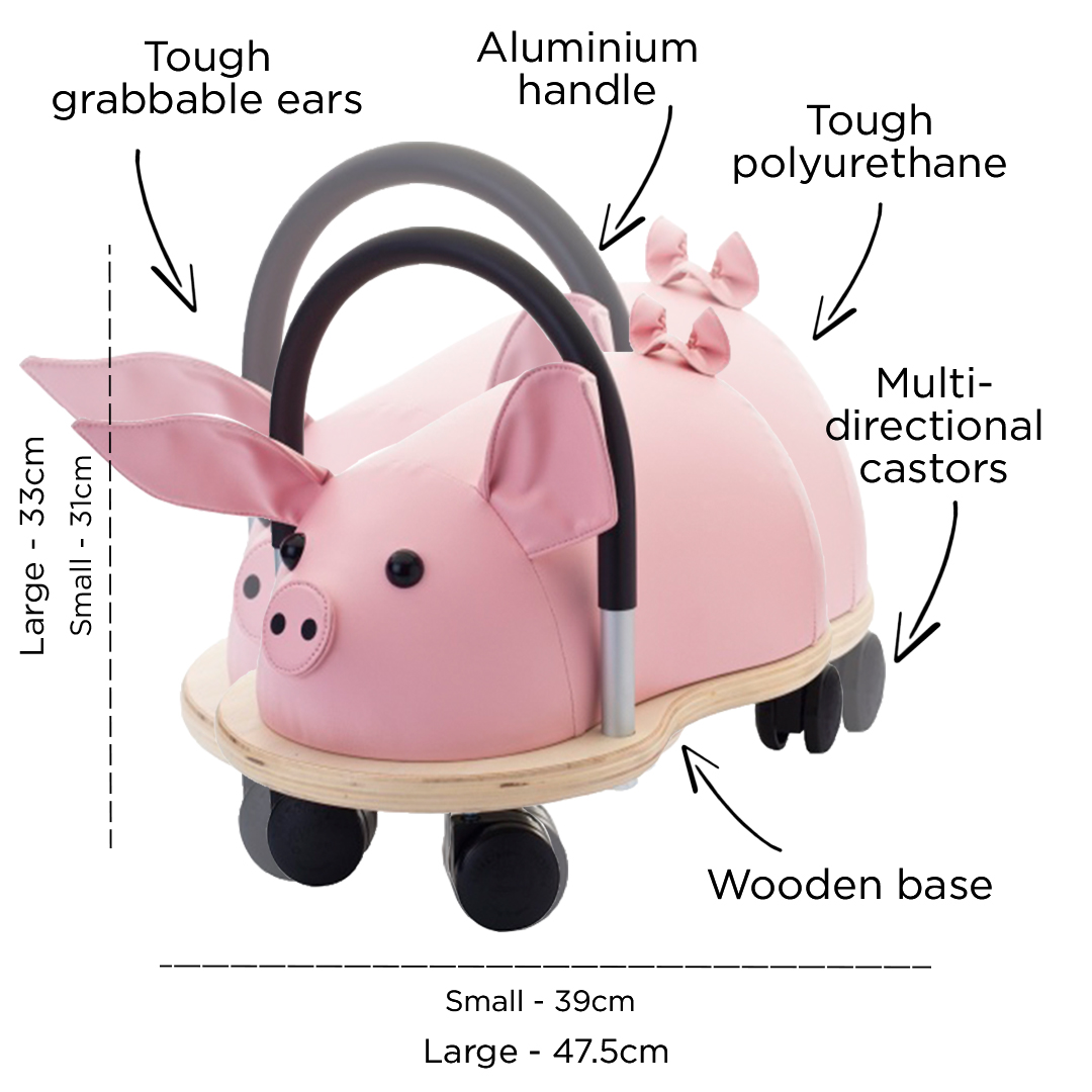 Jeździki zbudowane są na solidnej drewnianej podstawie o bezpiecznych zaokrąglonych kształtach do której przytwierdzone są 4 kółka obrotowe, zapewniające płynne poruszanie się przód-tył, na boki a także wokół własnej osi. Siedziska wykonane są z łatwej do czyszczenia i mięciutkiej w dotyku ekoskóry. Wheely Bug dzięki swojemu przyjaznemu wyglądowi stanie się najlepszym przyjacielem maluszka. Będzie świetnym pomysłem na prezent na roczek.