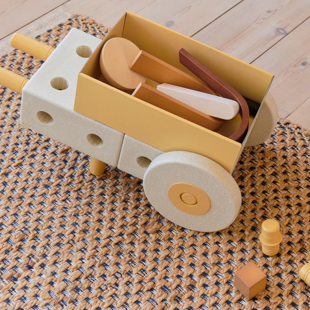 W skład zestawu wchodzi: 22 elementy (3x klocki, 14x łączników, 4x piankowe koła, 1x pudełko)