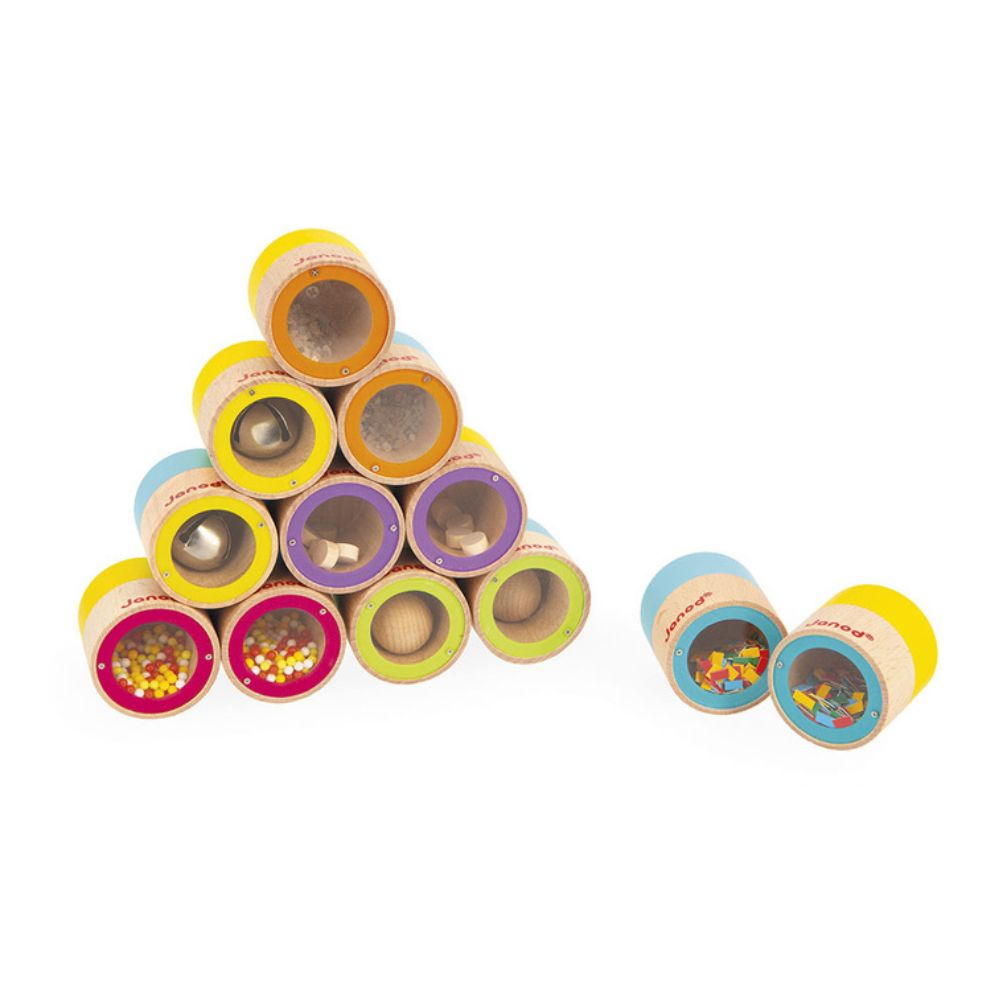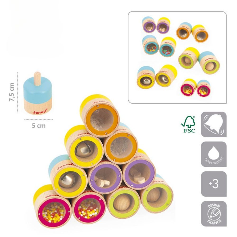 Zestaw zawiera 6 par drewnianych grzechotek, wydających różne dźwięki. W ich wnętrzach znajdują się: dzwoneczki, kamyczki, drewniana kula, koraliki z plastiku, kartoniki i drewniane krążki. Celem gry jest dopasowanie ich do siebie kierując się wyłącznie słuchem.