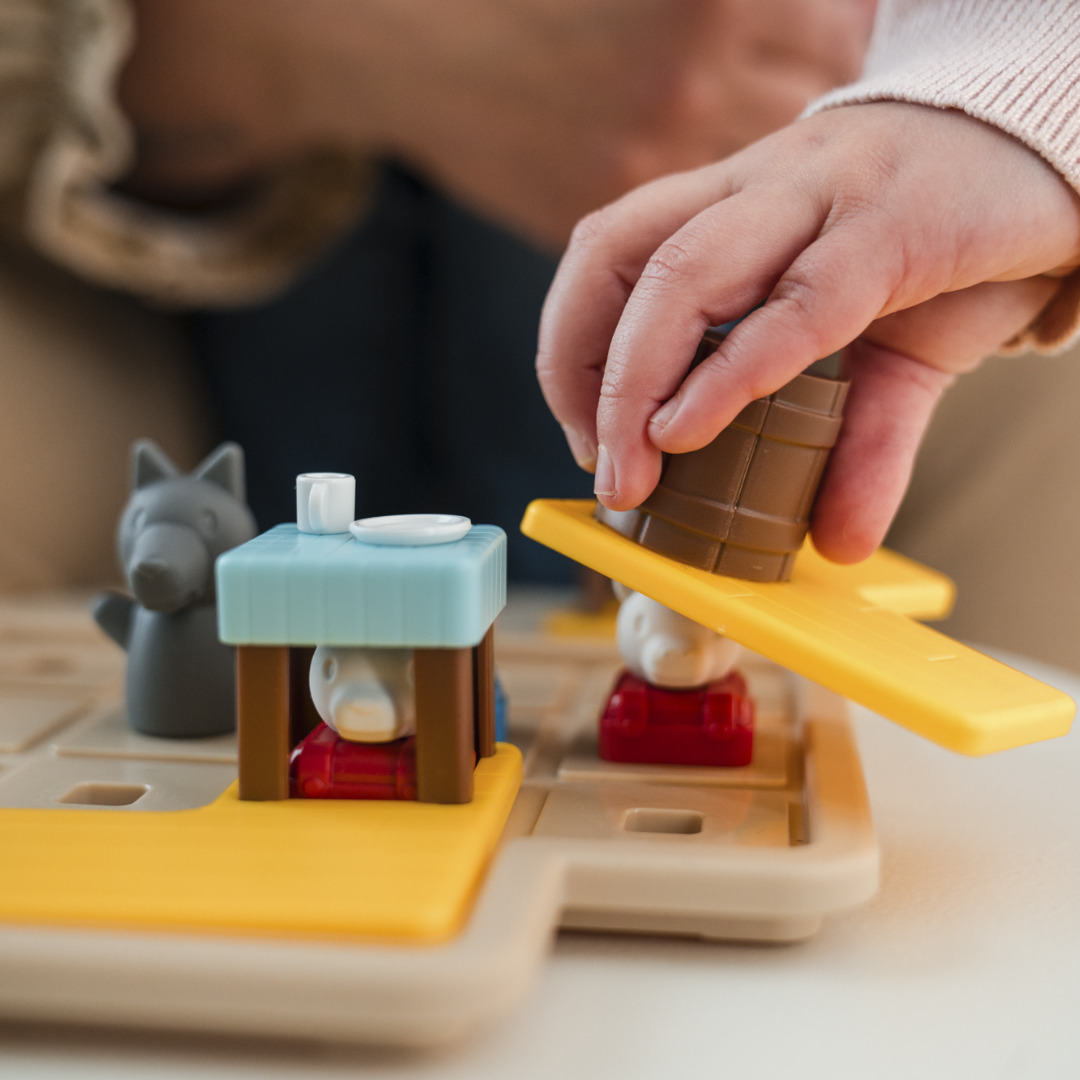W grze Wilk i Siedem Koźlątek dziecko pomaga koźlątkom znaleźć odpowiednie kryjówki, aby mogły uratować się przed wilkiem, który wtargnął do ich domku. Nie jest to jednak takie proste, ponieważ kózki, jak i meble, pod którymi chcą się schować mają różne kształty. To doskonała nauka przez zabawę, która rozwija umiejętności orientacyjne oraz poznawcze.