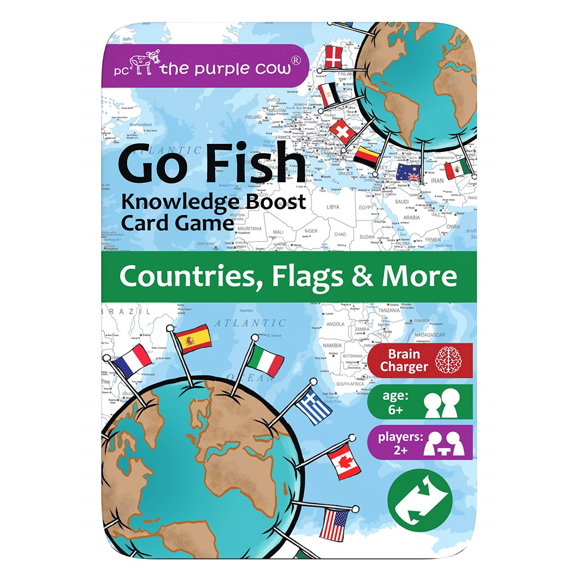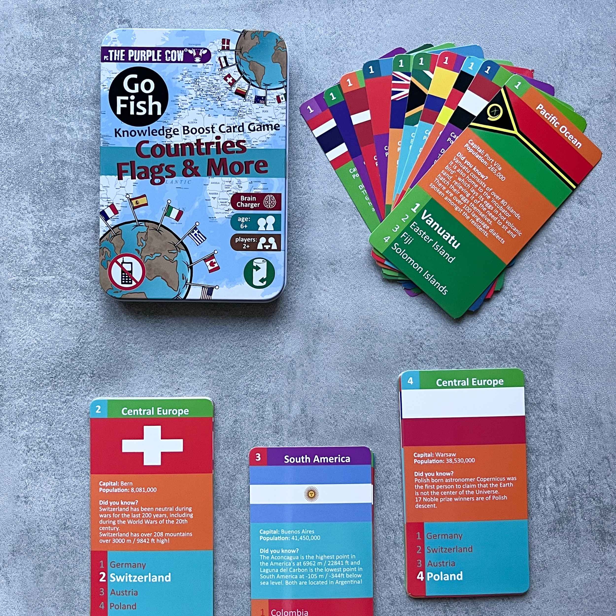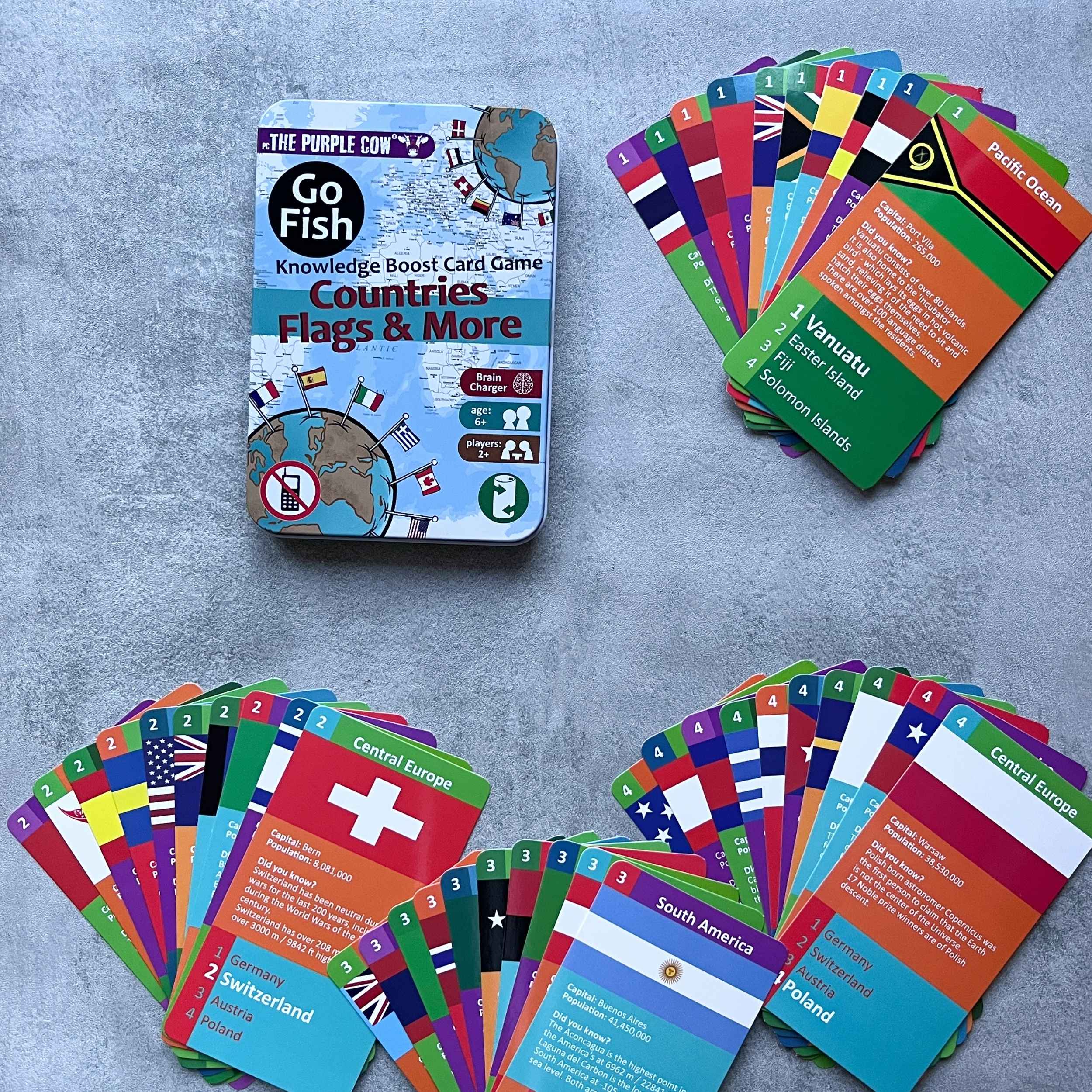 Podróżna gra karciana Kwartet The Purple Cow - Go Fish zapewni doskonałą zabawę dla całej rodziny. Gra polega na zebraniu 4 kart z danej serii tzw. Kwartetu, np. 4 morza, 4 flagi. Gracze muszą wytypować poprzez pytania jaką kartę posiada przeciwnik. Jeżeli osoba zapytana posiada pożądaną kartę - oddaje ją przeciwnikowi. W ten sposób zbiera się karty z serii. Wygrywa gracz, któremu udało się zdobyć najwięcej kwartetów. Na każdej karcie zawarte są bardzo ciekawe informacje dotyczące flag, państw, populacji. Gra jest w języku angielskim z dołączoną polską instrukcją.