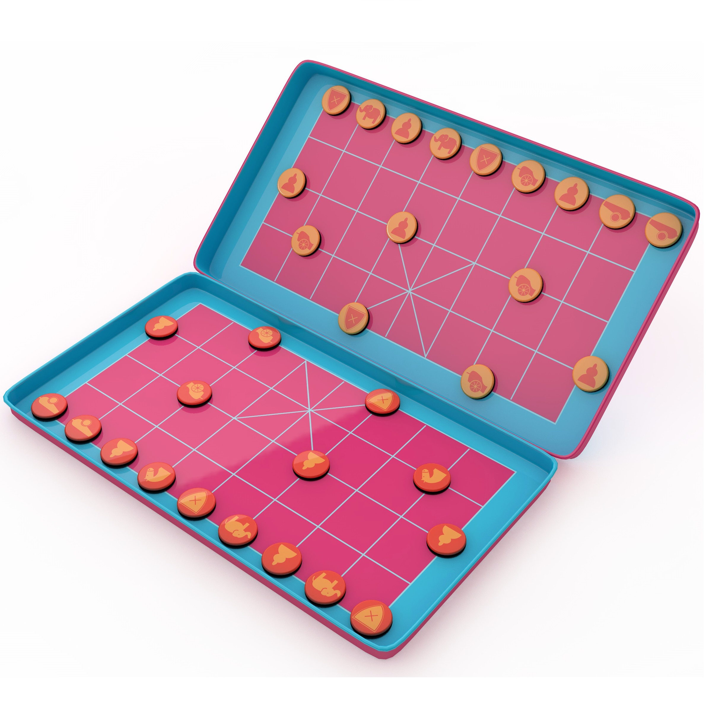 Gra magnetyczna The Purple Cow - Chińskie Szachy zapewni świetną zabawę dla całej rodziny. Xiangqi (chińskie szachy) - to forma szachów popularna w całych Chinach. Gra w nią więcej osób niż w inne gry planszowe na całym świecie. Mogą w nią grać 2 osoby. Zaczyna się od ustawienia pionków na planszy na przecięciach linii (9 linii pionowych, 10 poziomych). Ustawienie pokazane jest w instrukcji. Pionki (bierki) poruszają się tylko po skrzyżowanych liniach. Dwa pola na planszy w kształcie litery X to tak zwane pałace, a pusty obszar po środku to rzeka. Wybrane figury nie mogą opuszczać pałaców, a inne przekraczać rzeki. Grę rozpoczyna gracz z ciemno pomarańczowymi pionkami. Pionki należy przesuwać według zasad zdefiniowanych w instrukcji. Gdy gracz znajdzie się na polu zajmowanym przez przeciwnika to zbija jego pionek. Cel gry to zbicie króla przeciwnika lub doprowadzenie go do sytuacji, w której nie będzie mógł wykonać żadnego ruchu.