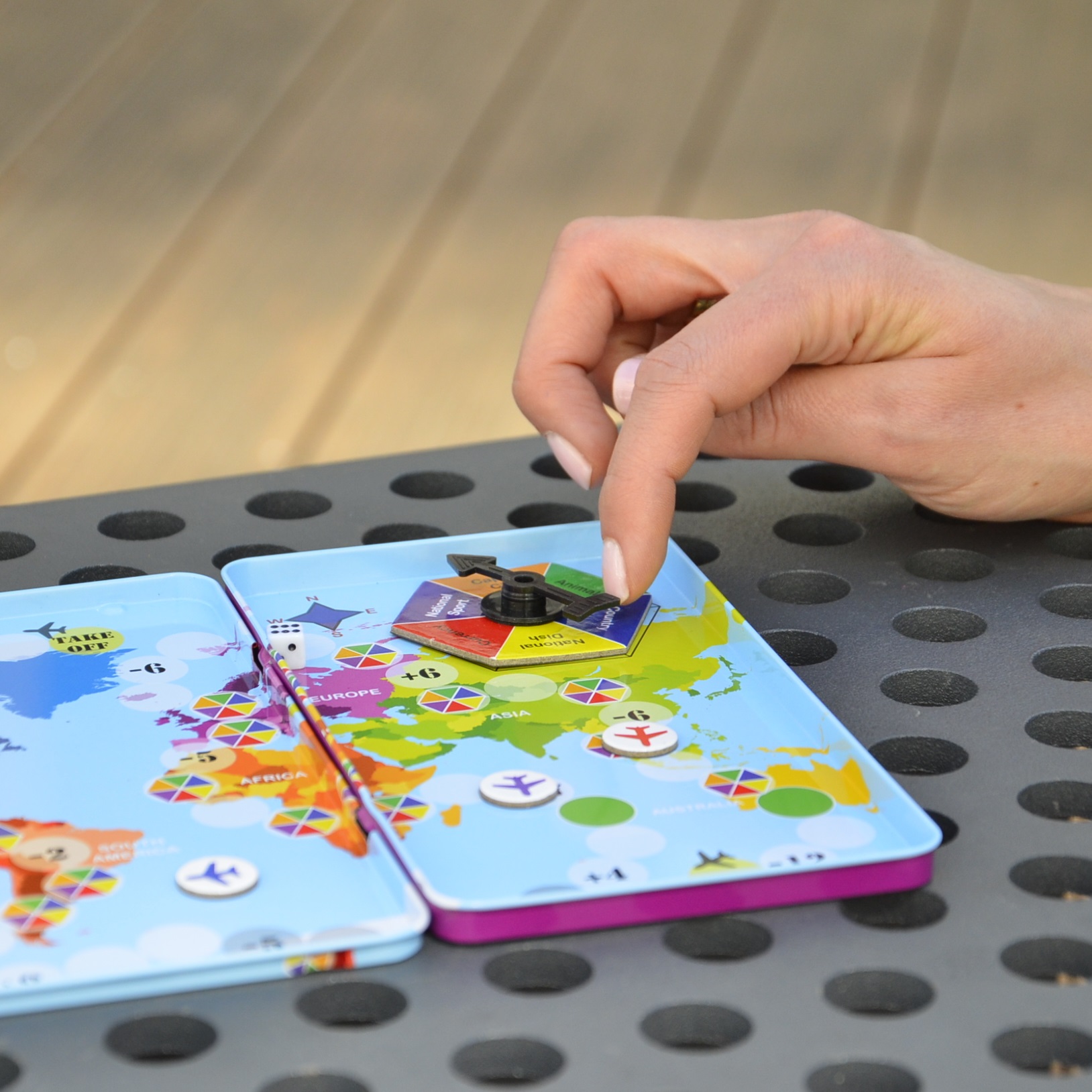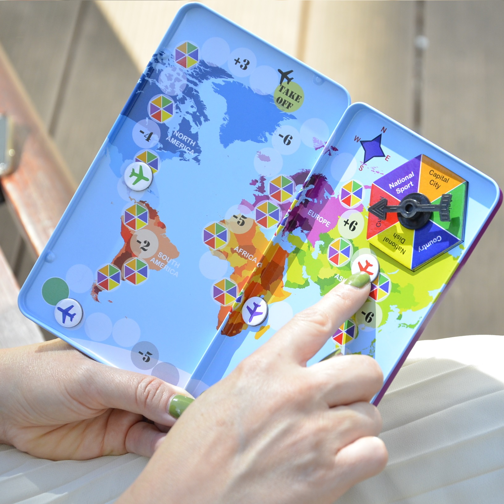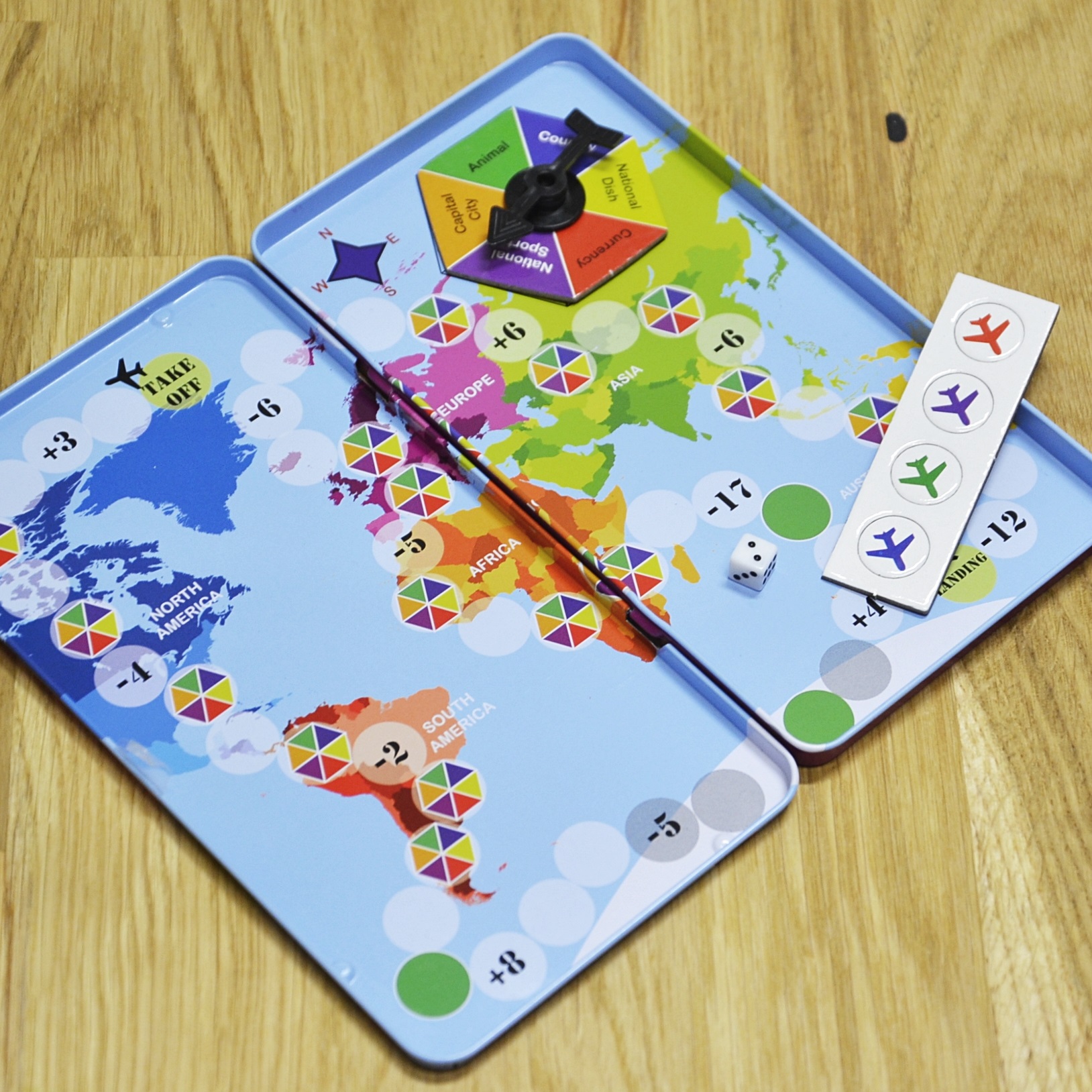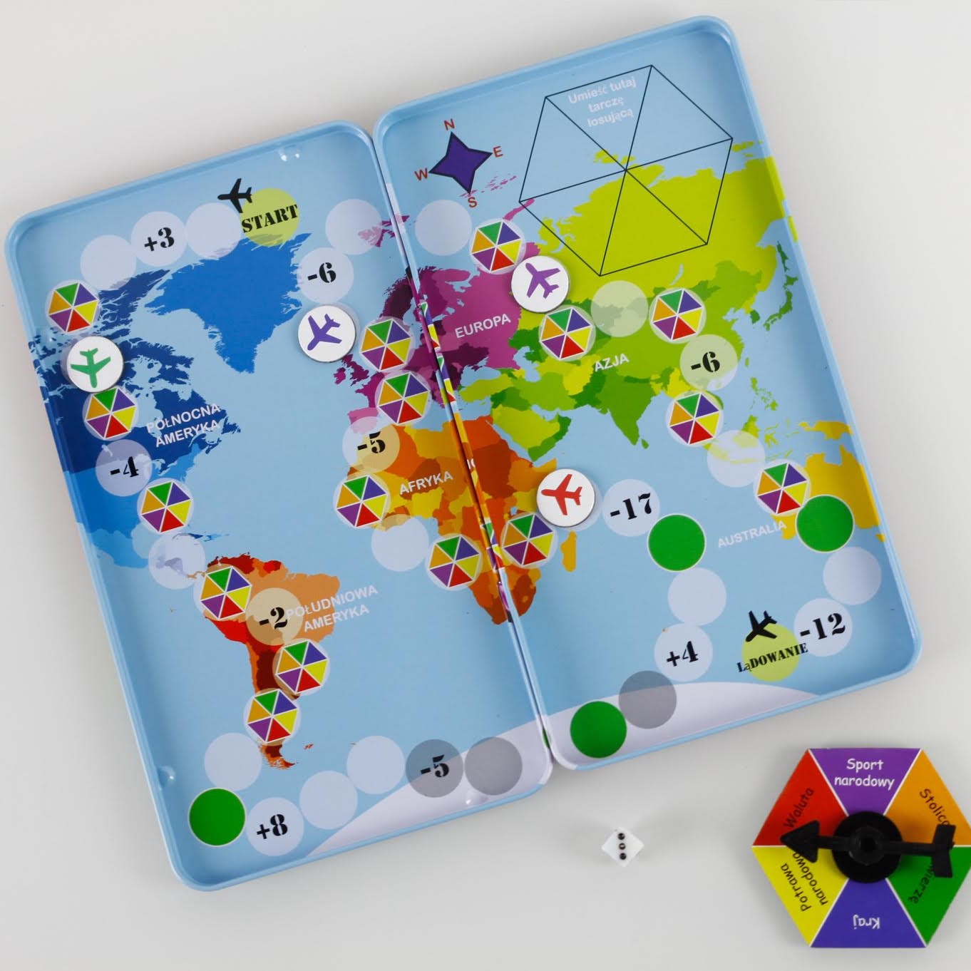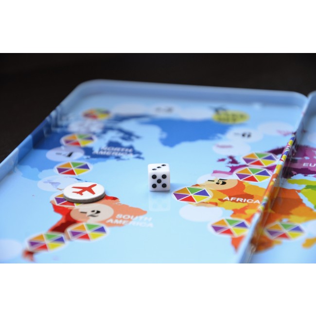 Jak grać: Wybieramy po jednym pionku (samoloty). Zaczyna najmłodszy uczestnik, rzucając kostką i przesuwając pionek na planszy o liczbę pól, którą wskazuje kostka. Wylądowanie na polu z tarczą losującą oznacza, że należy odpowiedzieć na pytanie z jednej z kategorii (stolica, sport narodowy, kraj, waluta, potrawa, zwierzę), dotyczące kontynentu, na którym się znajdujesz. Udzielenie nieprawidłowej odpowiedzi to utrata kolejki. Wylądowanie na polu z liczbą skutkuje pójściem do przodu lub cofnięciem - w zależności od wartości na polu. Lądowanie na polu przeciwnika powoduje cofnięcie na pole "start".