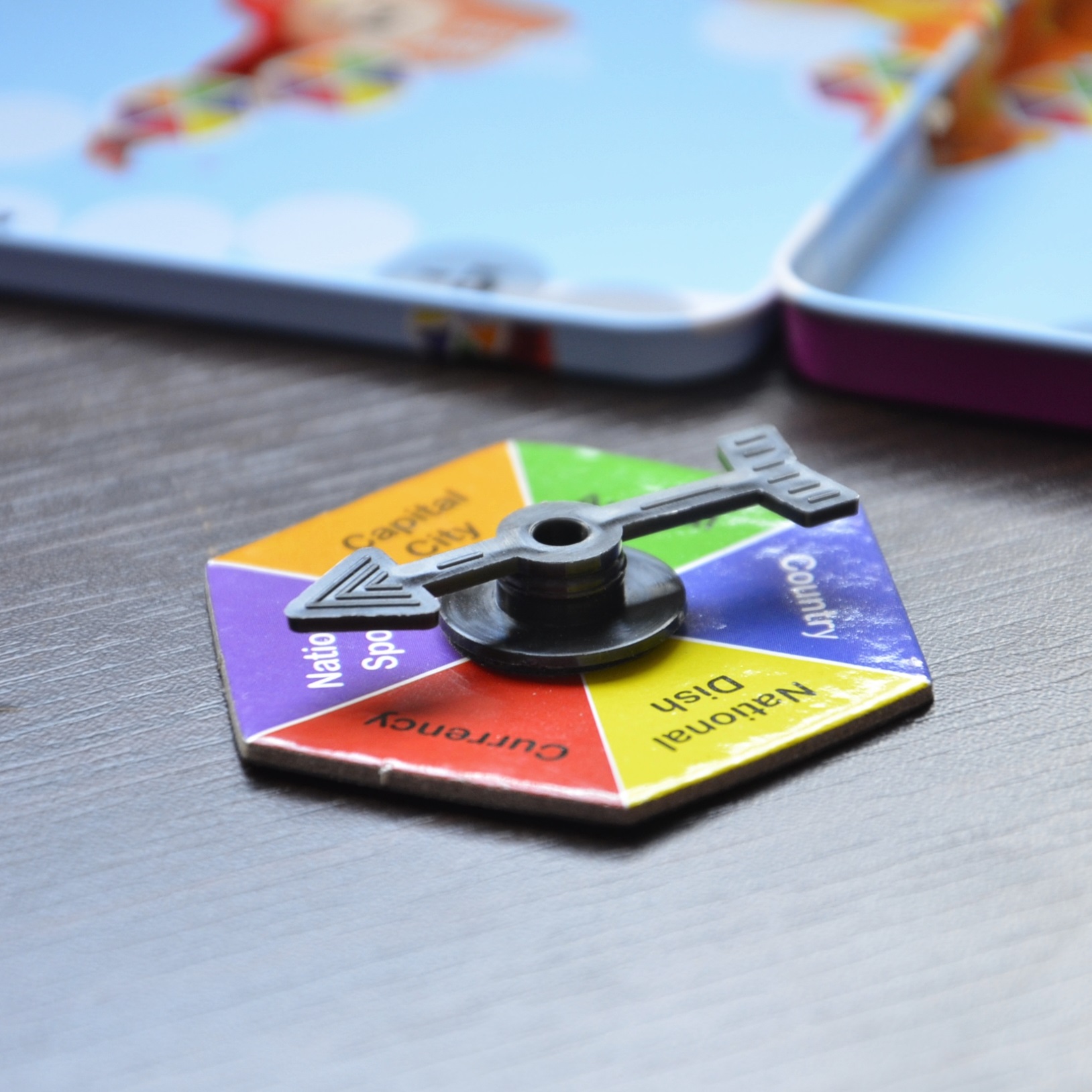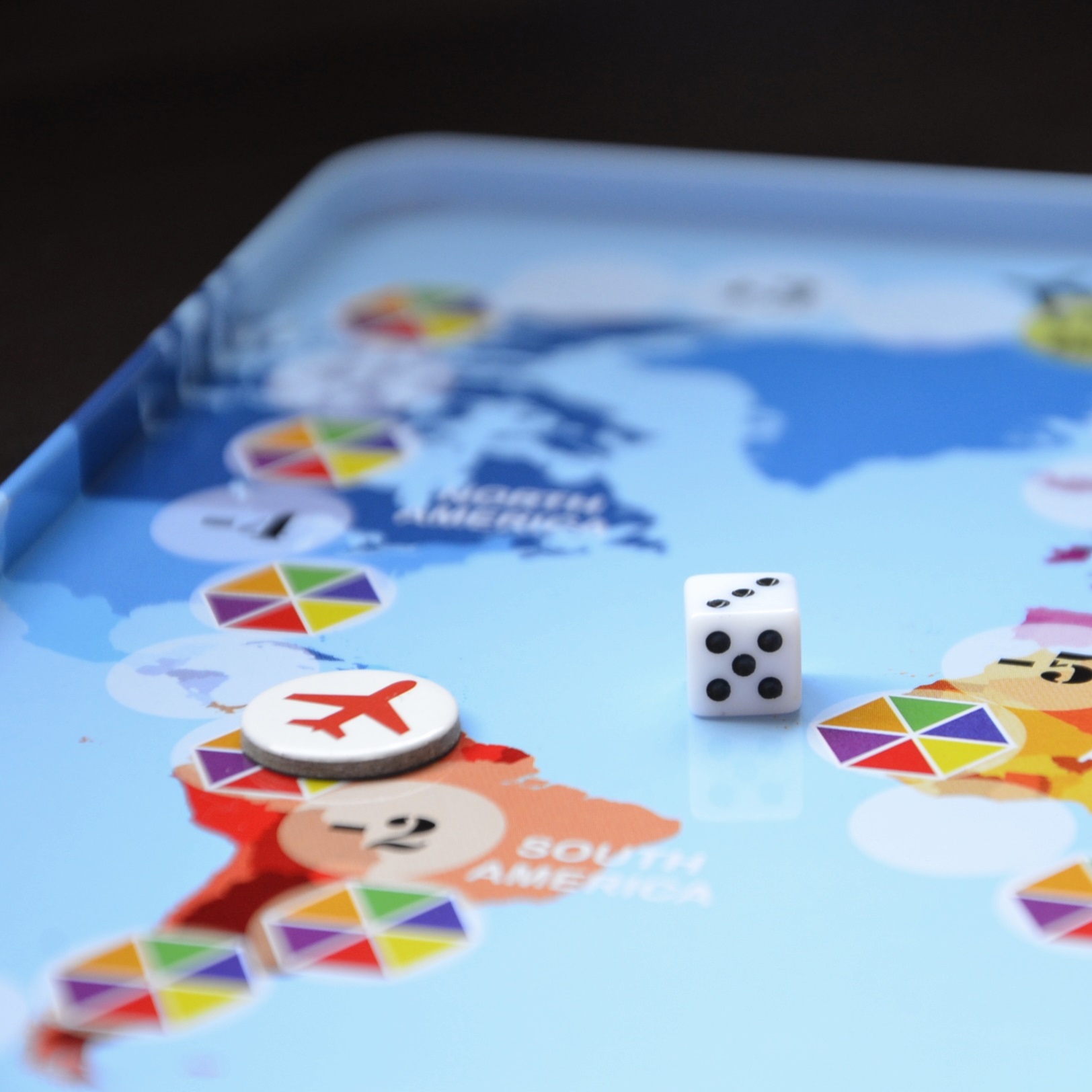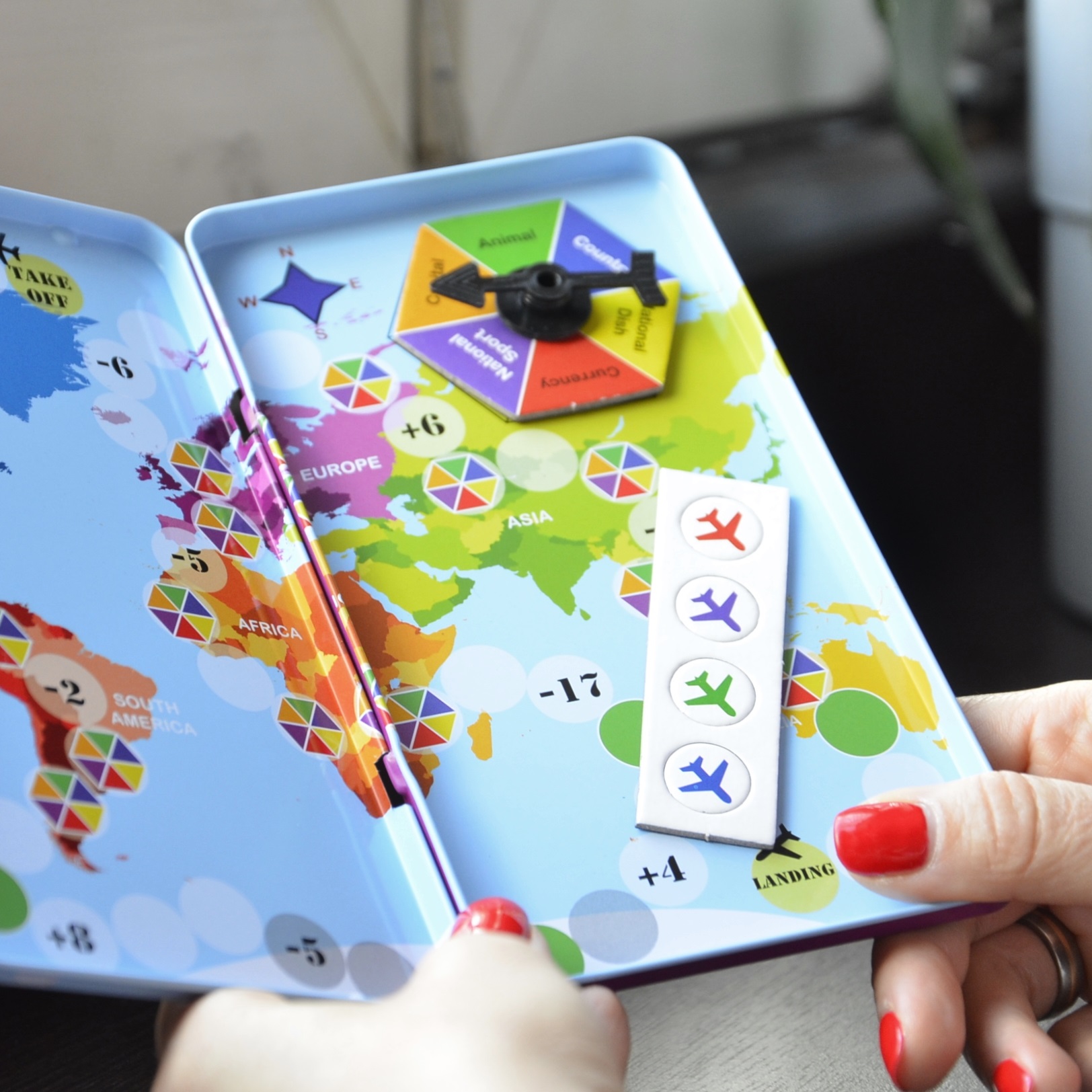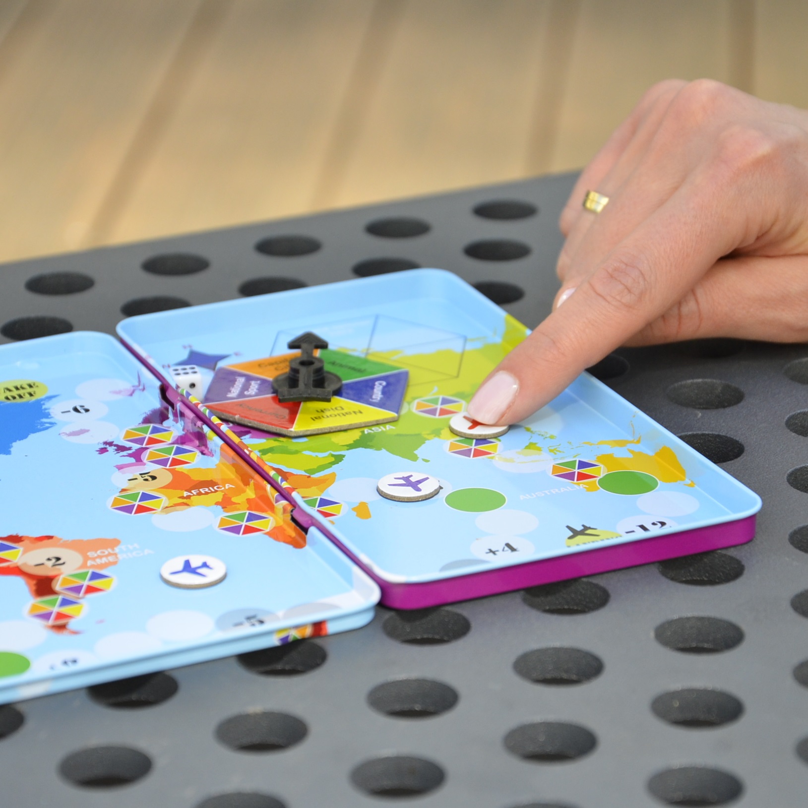 Jak grać: Wybieramy po jednym pionku (samoloty). Zaczyna najmłodszy uczestnik, rzucając kostką i przesuwając pionek na planszy o liczbę pól, którą wskazuje kostka. Wylądowanie na polu z tarczą losującą oznacza, że należy odpowiedzieć na pytanie z jednej z kategorii (stolica, sport narodowy, kraj, waluta, potrawa, zwierzę), dotyczące kontynentu, na którym się znajdujesz. Udzielenie nieprawidłowej odpowiedzi to utrata kolejki. Wylądowanie na polu z liczbą skutkuje pójściem do przodu lub cofnięciem - w zależności od wartości na polu. Lądowanie na polu przeciwnika powoduje cofnięcie na pole "start".