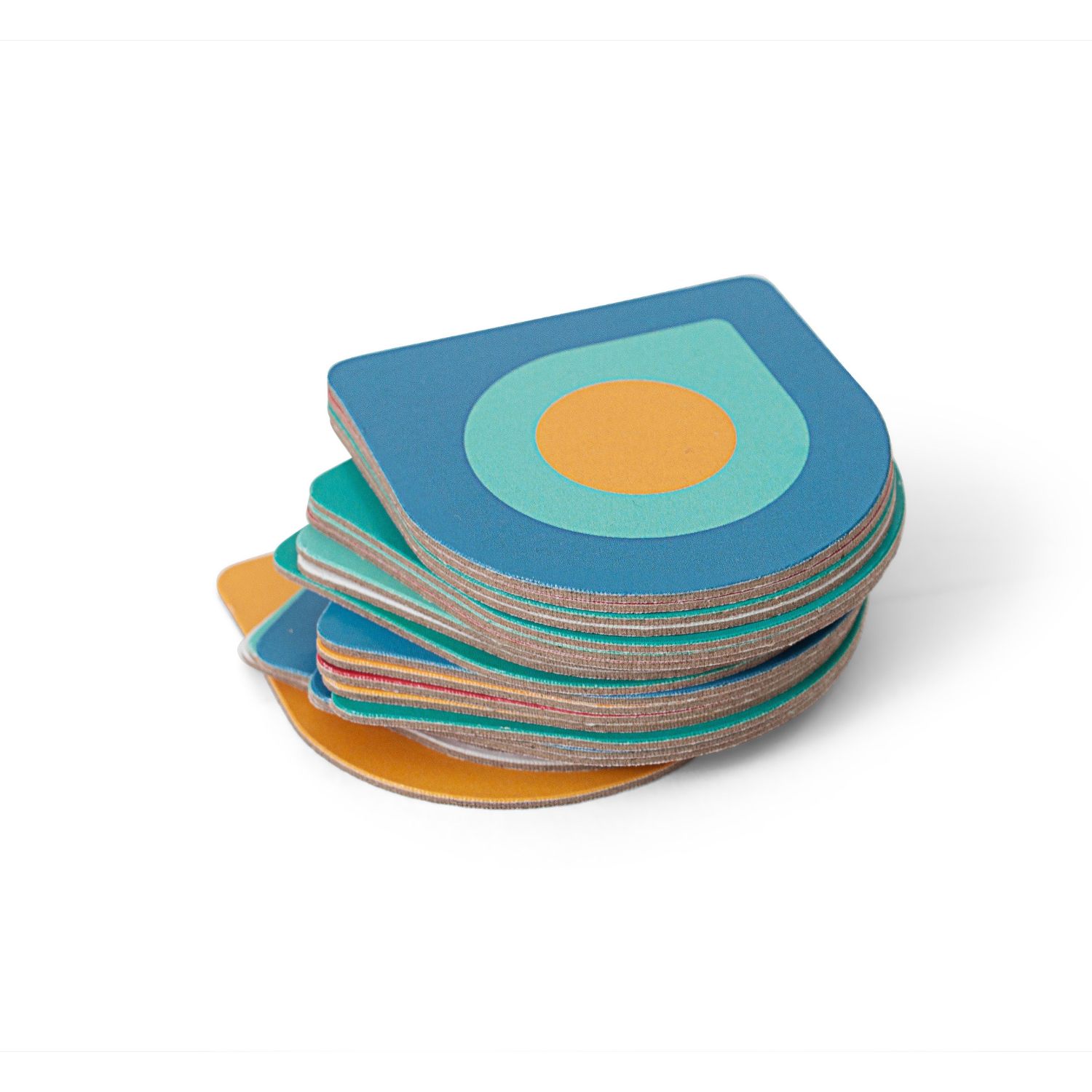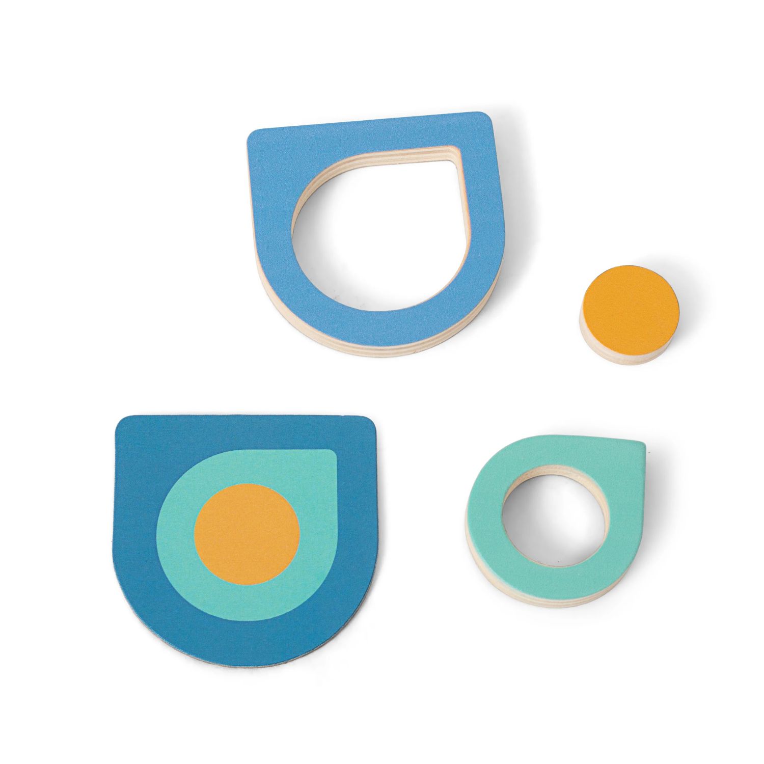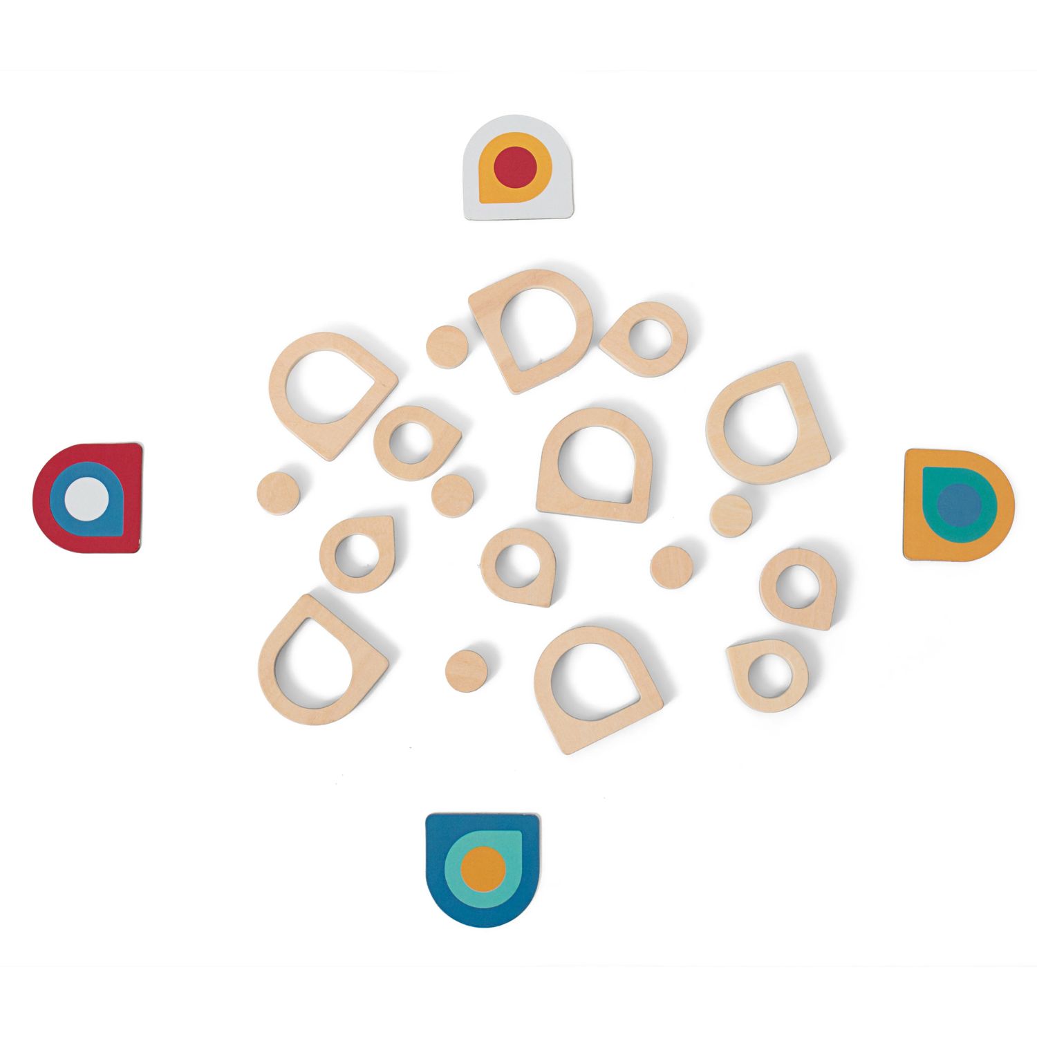 W zestawie znajdują się: 24 drewniane elementy puzzli (2 - 6 cm) oraz 18 kart z różnokolorowymi wzorami (6 x 6 cm).