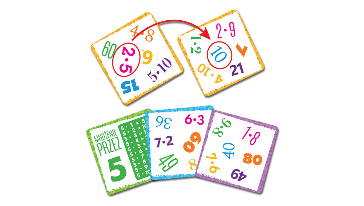 Na kartach znajdują się kolorowe zapisy działań mnożenia oraz iloczynów. Karty zostały podzielone według trzech poziomów trudności: mnożenie przez 1-5 i 10; mnożenie przez 6-9 oraz najtrudniejszy wariant: mnożenie w zakresie 1-10. Dodatkowe karty z tabliczką mnożenia 1-10 pomogą w szybkiej powtórce i utrwaleniu zdobytej wiedzy.