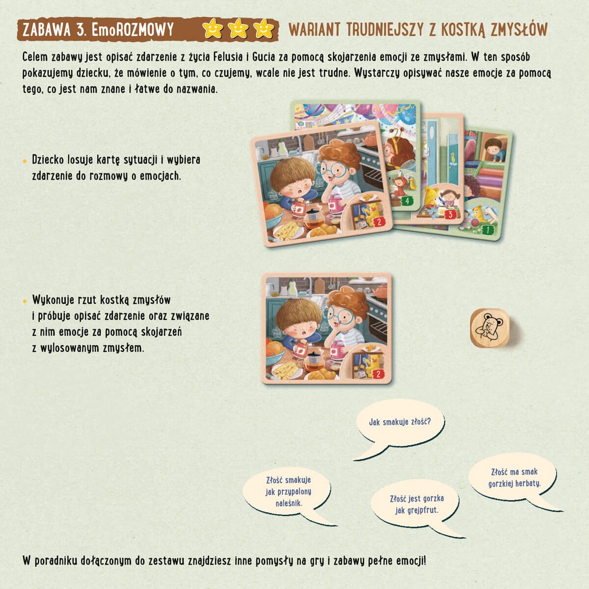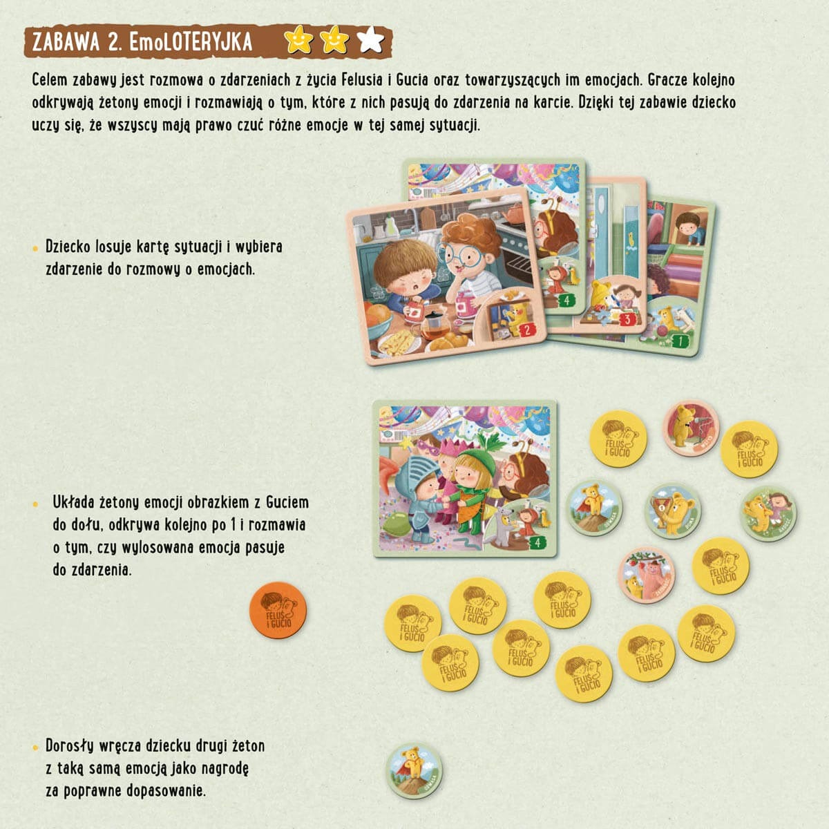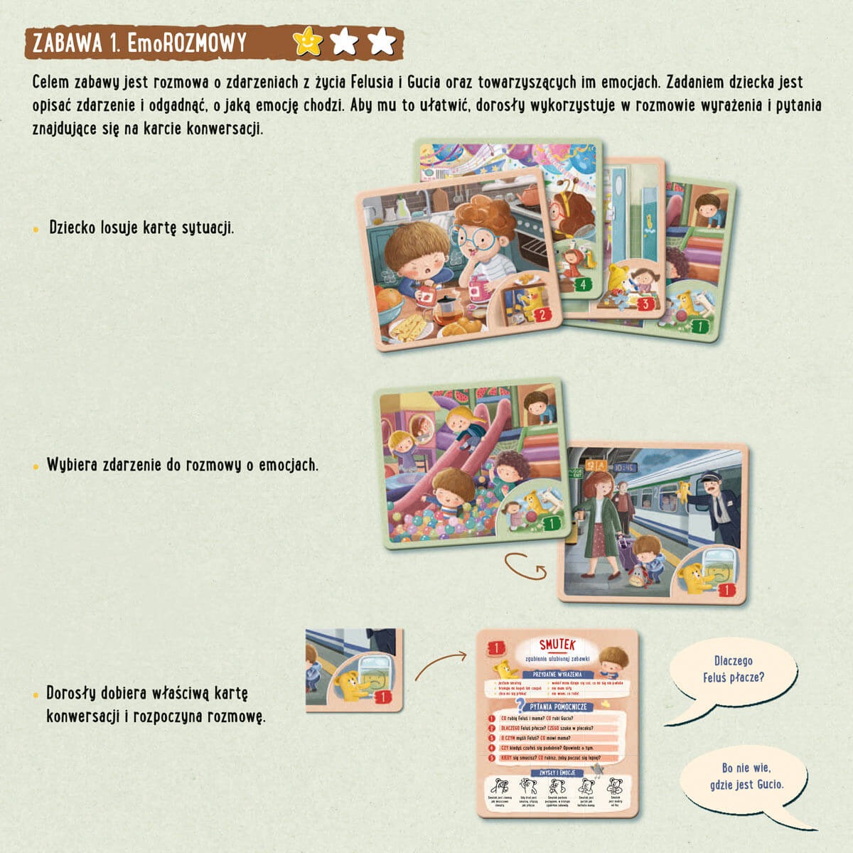 Gra wspiera prawidłowy rozwój emocjonalny i wspomaga rodziców w trudnych rozmowach z dzieckiem o emocjach. Idealna jako samodzielny pakiet edukacyjny oraz uzupełnienie książki "Feluś i Gucio poznają emocje"