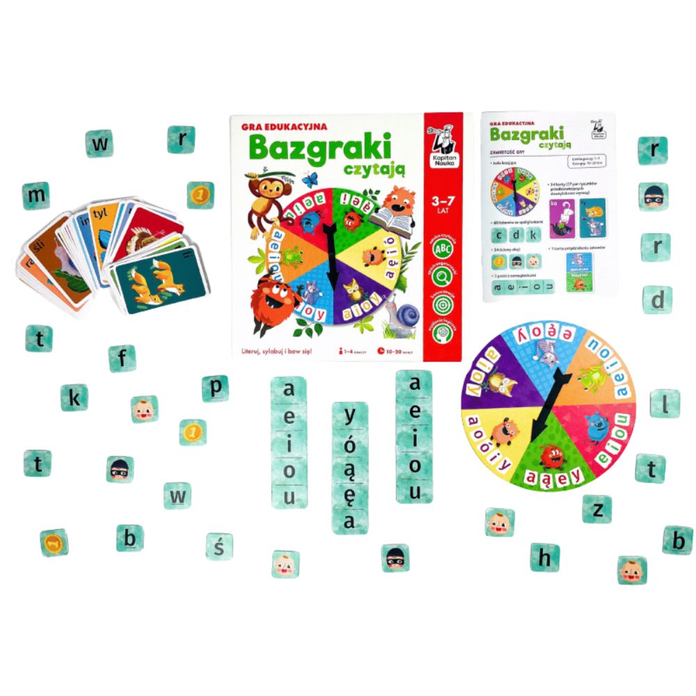 Nauka czytania z Bazgrakami to świetna zabawa! "Bazgraki czytają" (3-7 lat) to gra edukacyjna, która stanowi świetne uzupełnienie zestawu elementarzy i ćwiczeń z naklejkami do nauki czytania uznaną i popularną metodą sylabową. W rozrywkowej, pełnej emocji formie utrwala poznane dzięki książkom litery, sylaby i słowa. Rozgrywki mogą być oparte zarówno na literowej, jak i na sylabowej metodzie nauki czytania. Kilka wariantów o różnym stopniu trudności gwarantuje, że dzieci będą mogły wracać do gry na różnych etapach swojej przygody z nauką czytania i za każdym znajdą w niej coś nowego.