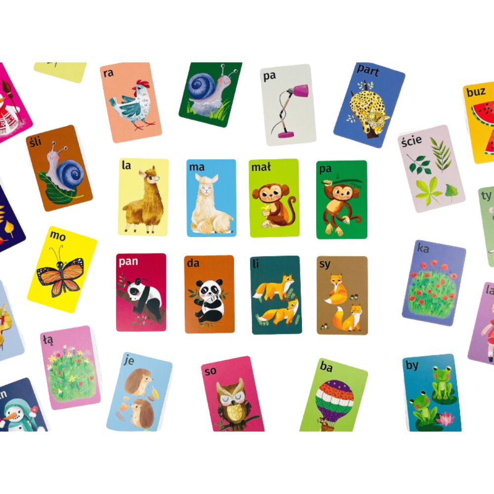 Na kartach przedstawiono barwnie zilustrowane 54 wyrazy 2-sylabowe o różnych stopniu trudności: od prostych wyrazów składających się z dwóch sylab otwartych (np. lala, kura) do trudniejszych słów ze znakami diakrytycznymi i sylabami zamkniętymi i otwartymi (bałwan, żaba, arbuz).