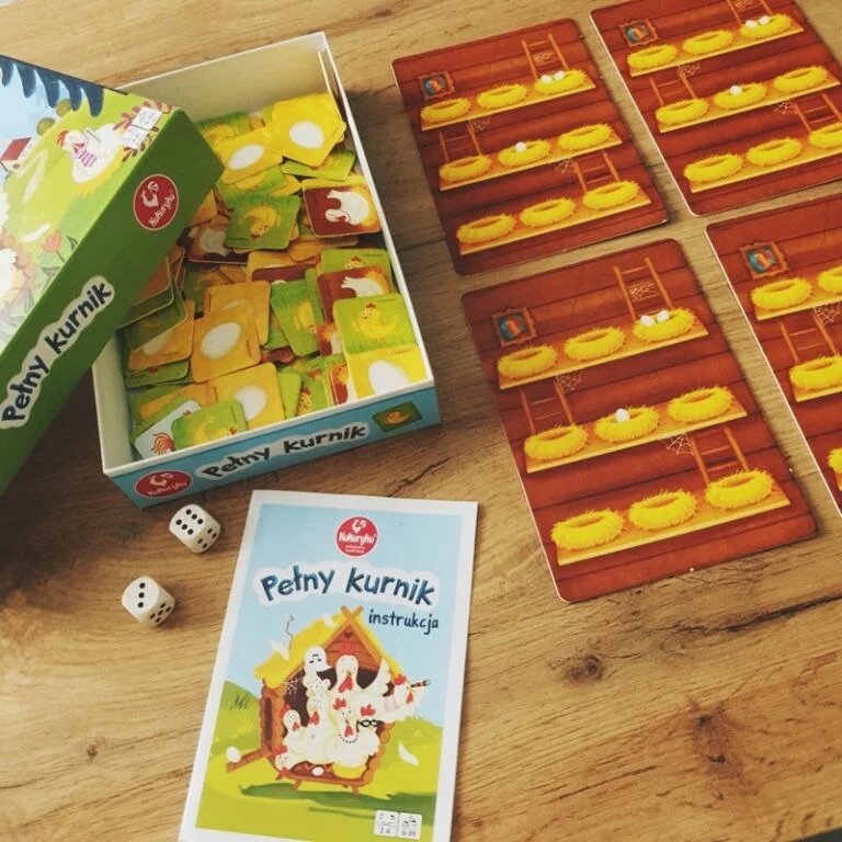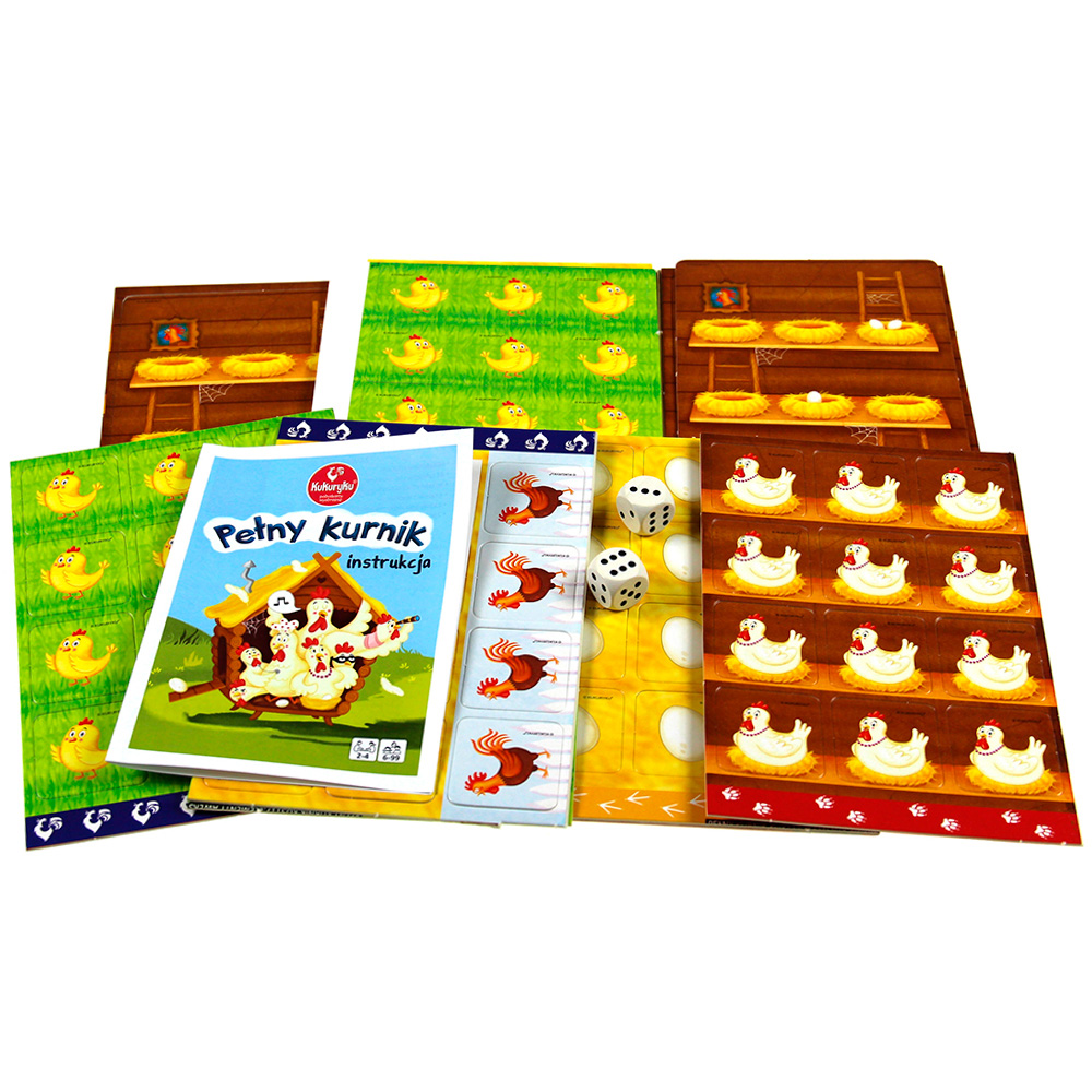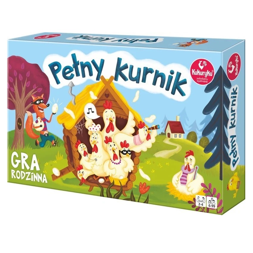 Gra "Pełny kurnik" zapewni fantastyczną zabawę dla całej rodziny. Gracze zbierają jaja, hodują kurczaki i kury. Jednak musisz uważać i bronić je przed przebiegłym lisem! Ten z hodowców, który jako pierwszy ułoży na grzędach w swoim kurniku dziewięć dorosłych kur, zwycięża!