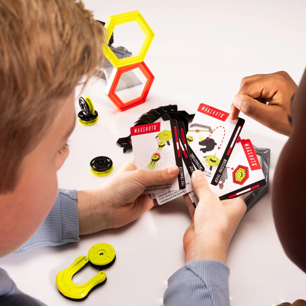 Marzysz o emocjonującej zabawie, która rozwija zręczność, refleks i pomysłowość? MagShuto Tor Wyzwań to zestaw pełen magnetycznych atrakcji, który pozwoli Twojemu dziecku tworzyć własne pokazy trików i przeżywać niesamowite emocje. Dzięki wyrzutni i magnetycznym dyskom Mag-Pod, każdy strzał to widowisko pełne odbić, koziołków i efektownych akrobacji. To świetna alternatywa dla ekranów – zabawa, która przyciąga i nie puszcza!