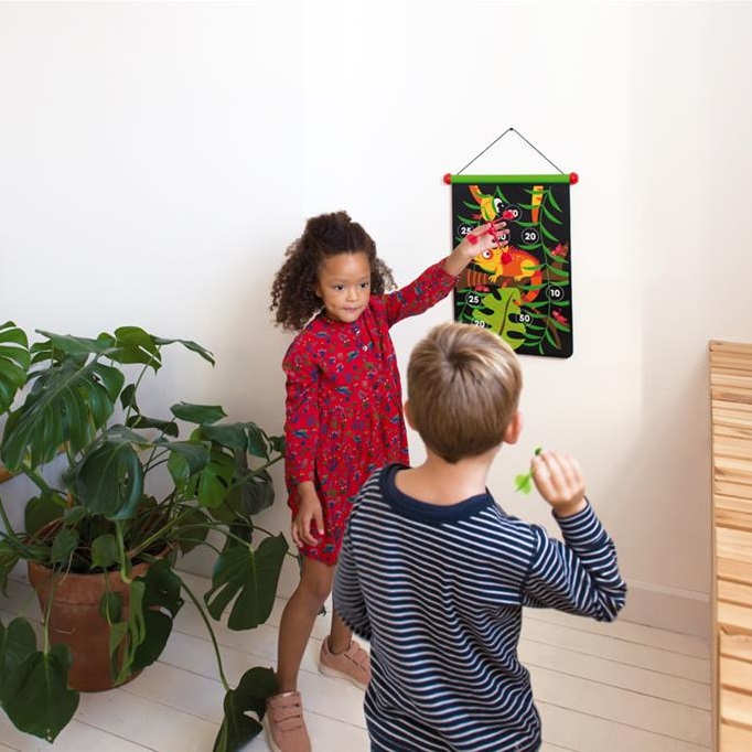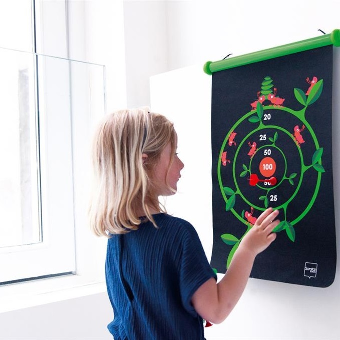 Tarcza jest dwustronna co pozwala na zabawę na dwa różne sposoby. Rzutki wykonano z tworzywa sztucznego z metalową końcówką, która ma specjalnie zaokrąglone wykończenie dla bezpieczeństwa dzieci. Tarcza wykonana z płótna idealnie mieści się do specjalnie zaprojektowanej tuby, którą wykonano z wytrzymałej tektury. Łatwe przechowywanie to dodatkowy atut tej niezwykłej zabawki. Dart to znana i lubiana gra, która rozwija zręczność i koordynację ruchowo-wzrokową u dzieci.