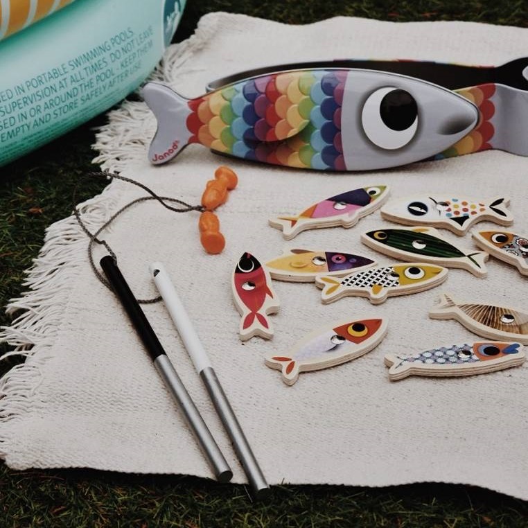 W zestawie znajduje się 10 sporych (8,7 x 3,5 cm), kolorowych rybek z magnesami oraz dwie wędki, również zakończone magnesami, co pozwala na łapanie rybek na wędkę. Gra ta rozwija wyobraźnię, myślenie strategiczne oraz umiejętność planowania, a przy tym stanowi wspaniałą rozrywkę dla całej rodziny. Zaprojektowana we Francji, jest zapakowana w estetyczne, metalowe pudełko w kształcie sardynki.