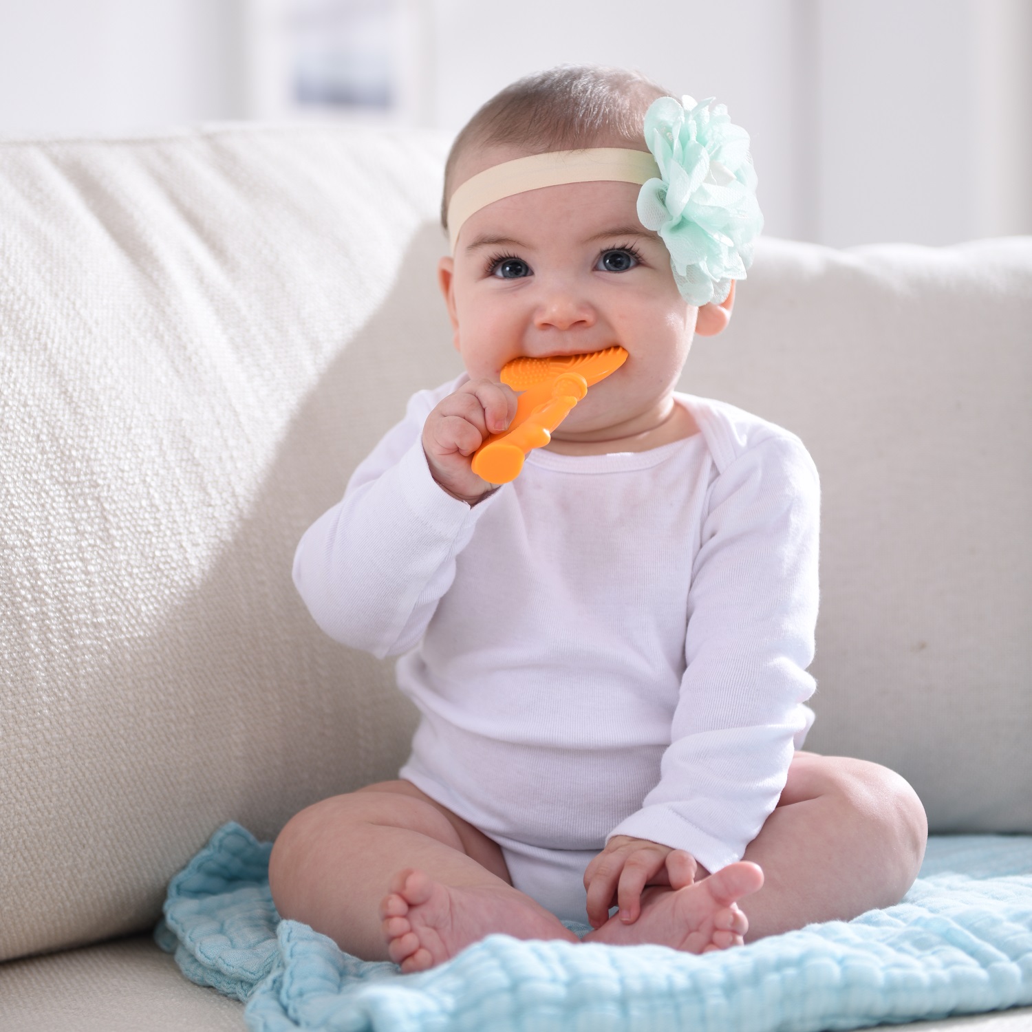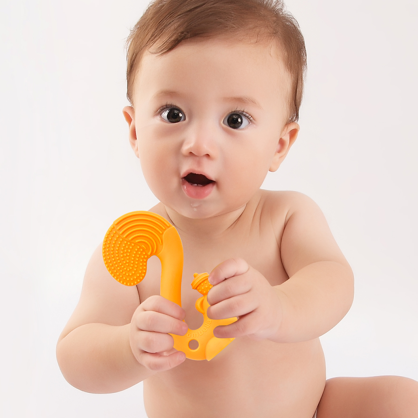 Miękki gryzak wiewiórka w kształcie literki "S" został zaprojektowany z myślą o najmłodszych dzieciach. Różnorodne struktury gryzaka masują delikatne dziąsełka i łagodzą ból podczas ząbkowania. Odpowiedni kształt i rozmiar umożliwiają dziecku łatwe chwytanie. Może być również stosowany do podawania np. kaszek i przecierów. Kształt wiewiórki i jej kolorystyka zachęcą Malucha do zabawy. Jest bezpieczny i łatwy w gryzieniu nawet po ochłodzeniu. Można używać go w zmywarce, mikrofalówce, a także zamrażarce.