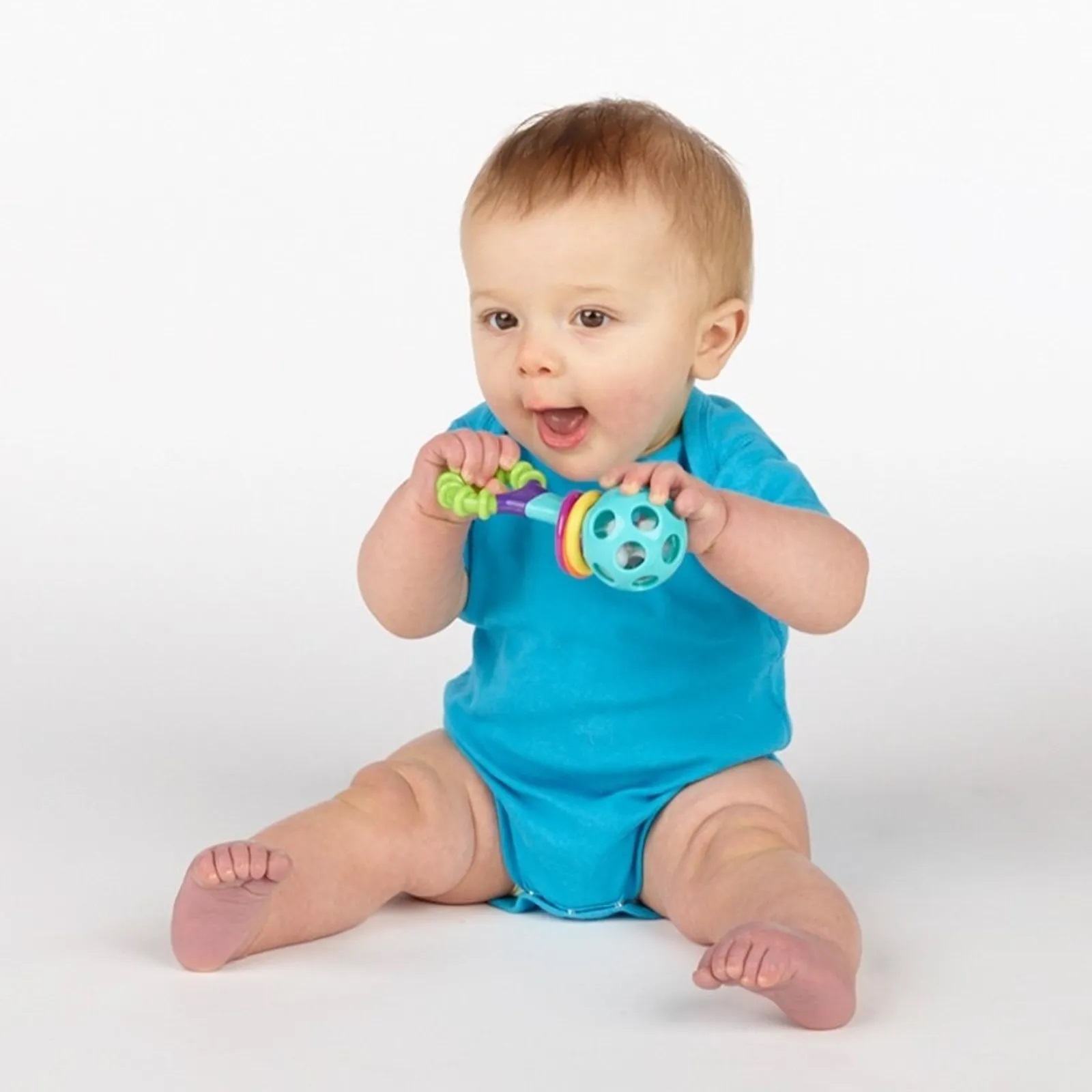 Ta kolorowa, giętka grzechotka jest idealna do tego, by zainteresować maluszka. Elastyczna szyjka grzechotki, która wygina się o 180°, stanowi doskonałe wyzwanie dla małych rączek. Z kolei kontrastujące czarno-białe koraliki znajdujące się w kuli grzechotki, przyciągają rozwijający się wzrok dziecka i budzą świadomość słuchową. Dodatkowo jaskrawe, ruchome pierścienie zapewniają stymulację słuchową, a teksturowany uchwyt świetnie nadaje się do trzymania w ustach.